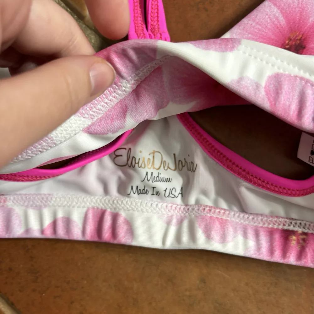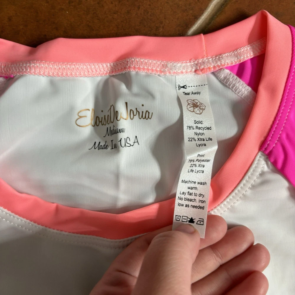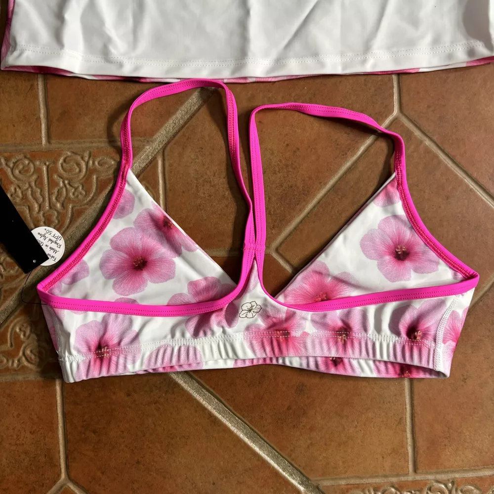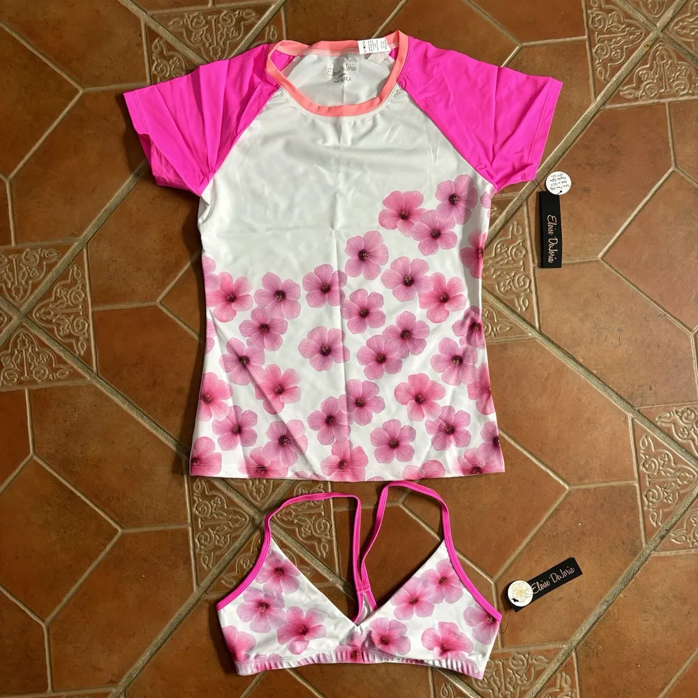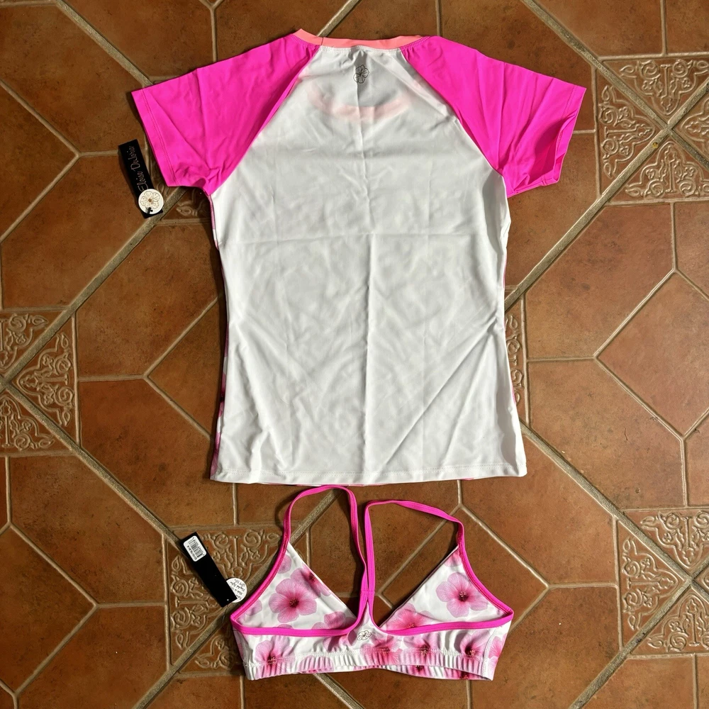 Eloise DeJoria White Pink Floral Sports Bra and Workout Top Set Women Size M Brand new with hanging tags intact. No tears/holes or stains. Brand label says fits a women’s size medium. Includes 1 white and pink floral racerback workout sports bra with pink trim, and a white workout short sleeve top with pink floral at the base, coral trim, and pink sleeves. I have other Eloise DeJoria athletic wear in this size, check my page for other options and reach out to bundle. Pink Floral Set #1