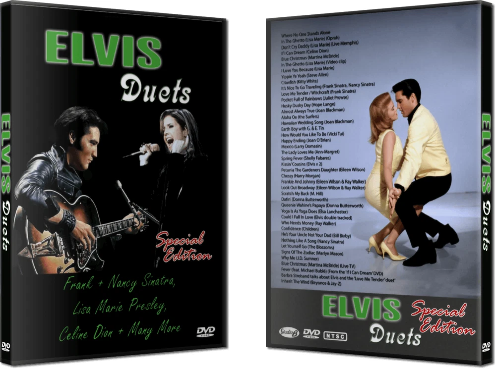 This DVD is both Region Free (For all countries - No code restriction) and NTSC suitable for the USA Elvis Presley Official Fan Club | ElvisPresleyShop.com www.elvis.com.au www.elvispresleyshop.com Elvis Duets DVD | Special Edition with Bonus DVD (Elvis Presley) A limited-edition batch of 100 sets was produced of 'Elvis Duets' and we have just obtained a few of these . Each set contains 5 photographs , 4 great shots of Elvis. As nice as these are, the bonus DVD is the standout , featuring Lisa Marie in concert during her recent worldwide concert tour (Nashville in this case), an interview with Lisa and T Bone Burnett, and music videos and more. If you appreciate Lisa Marie Presley the artist, you will be floored with the bonus disc. Region Free (0) NTSC The main, 1st DVD also contains a 'bonus' section containing only the Elvis & Lisa Marie duets so they can be played without the need for all the other tracks for those people mainly interested in these duets. Plus there are some surprises added. Preview Videos Video: In The Ghetto Duet Video: I Love You Because Duet I Love You Because (02:55) Latest Video Updates Elvis Duets 'Elvis Duets' is a colorful collection of Elvis songs with the theme: ' Duets '. During his movie career, Elvis recorded a vast amount of songs together with other vocalists. The result is a wide variety of songs and video clips out of the many well known Elvis movies. An entertaining collection that is nice to watch. Rare are the images of the 1960 'Welcome Home Elvis' Frank Sinatra TV-Special; they remain a unique momentum to see. Other rare performances include Lisa Marie's duet with Elvis on 'In The Ghetto' during an Oprah TV-show, complete with Gospel Choir. It is beyond anyone's guess why this never turned into a big hit; great performance. A lso: Celine Dion's duet with Elvis on 'American Idol ' and Martina McBride appearing - with Elvis on screen - on a tv-show to promote the 'Christmas Duets' album. The odd one out is a clip from 'Beyonce & Jay-Z'. A nicely produced DVD with a special selection of songs and images. DVD Where No One Stands Alone with Lisa Marie Presley In The Ghetto with Lisa Marie Presley (TV Show) Don't Cry Daddy with Lisa Marie Presley If I Can Dream with Celine Dion Blue Christmas with Martina McBride In The Ghetto with Lisa Marie Presley (video clip) I Love You Because Elvis and Lisa Marie Presley Yippie Ye Yeah with Steve Allen Crawfish with Kitty White It's Nice To Go Traveling with Frank and Nancy Sinatra , Sammy Davis jr, Joe Bishop Love Me Tender / Witchcraft with Frank Sinatra Pocketful Of Rainbows with Juliet Prowse Husky Dusky Day with Hope Lange Almost Always True with Joan Blackman Aloha Oe with the Surfers Hawaiian Wedding Song with Joan Blackman Earth Boy with G. & E. Tin How Would You Like To Be with Vicky Tui Happy Ending with Joan O'Brien Mexico with Larry Domasin The Lady Loves Me with Ann-Margret Spring Fever with Shelley Fabares Kissin' Cousins with Elvis Petunia The Gardeners Daughter with E. Wilson & R. Walker Chesay with Harry Morgan Frankie And Johnny with E. Wilson & R. Walker Look Out Broadway with E. Wilson & R. Walker Scratch My Back with M. Hill Datin' with Donna Butterworth Queenie Wahine's Papaya with Donna Butterworth Yoga Is As Yoga Does with Elsa Lanchester Could I Fall In Love with Elvis Who Needs Money with Ray Walker Confidence with Kids He's Your Uncle Not Your Dad with Bill Bixby Nothing Like A Song with Nancy Sinatra Let Yourself Go with The Blossoms Signs Of The Zodiac with Marlyn Mason Why Me Lord with J.D. Sumner Fever Michael Bublà © Love Me Tender with Barbra Streisand Blue Christmas with Martina McBride (TV Show) Inherit The Wind (Beyonce & Jay-Z) Exclusive BONUS DVD In The Ghetto (Version #1) (Elvis & Lisa Marie Presley) I Love You Because (Elvis & Lisa Marie Presley) Don't Cry Daddy (Elvis & Lisa Marie Presley) (Live Memphis) In The Ghetto (Lisa Marie) (Oprah) In The Ghetto (Version #2) (Elvis & Lisa Marie Presley) Lisa Marie Presley Talks About Growing Up at Graceland on CBS's The Talk Over Me (Lisa Marie Presley) (Music Video) You Ain't Seen Nothin' Yet (Lisa Marie Presley) (Music Video) T Bone Burnett & Lisa Marie Presley Interview on AXS Live Live in Nashville, November 5, 2012 (Lisa Marie Presley) - So Long - Over Me - You Ain't Seen Nothin' Yet - Weary - Sticks & Stones Storm of Nails (Lisa Marie Presley) (Live at WFUV) Weary (Lisa Marie Presley) (Live at WFUV) Dad, you will always be in my memory (Lisa Marie Presley) To Elvis With Love - The Graceland Wall