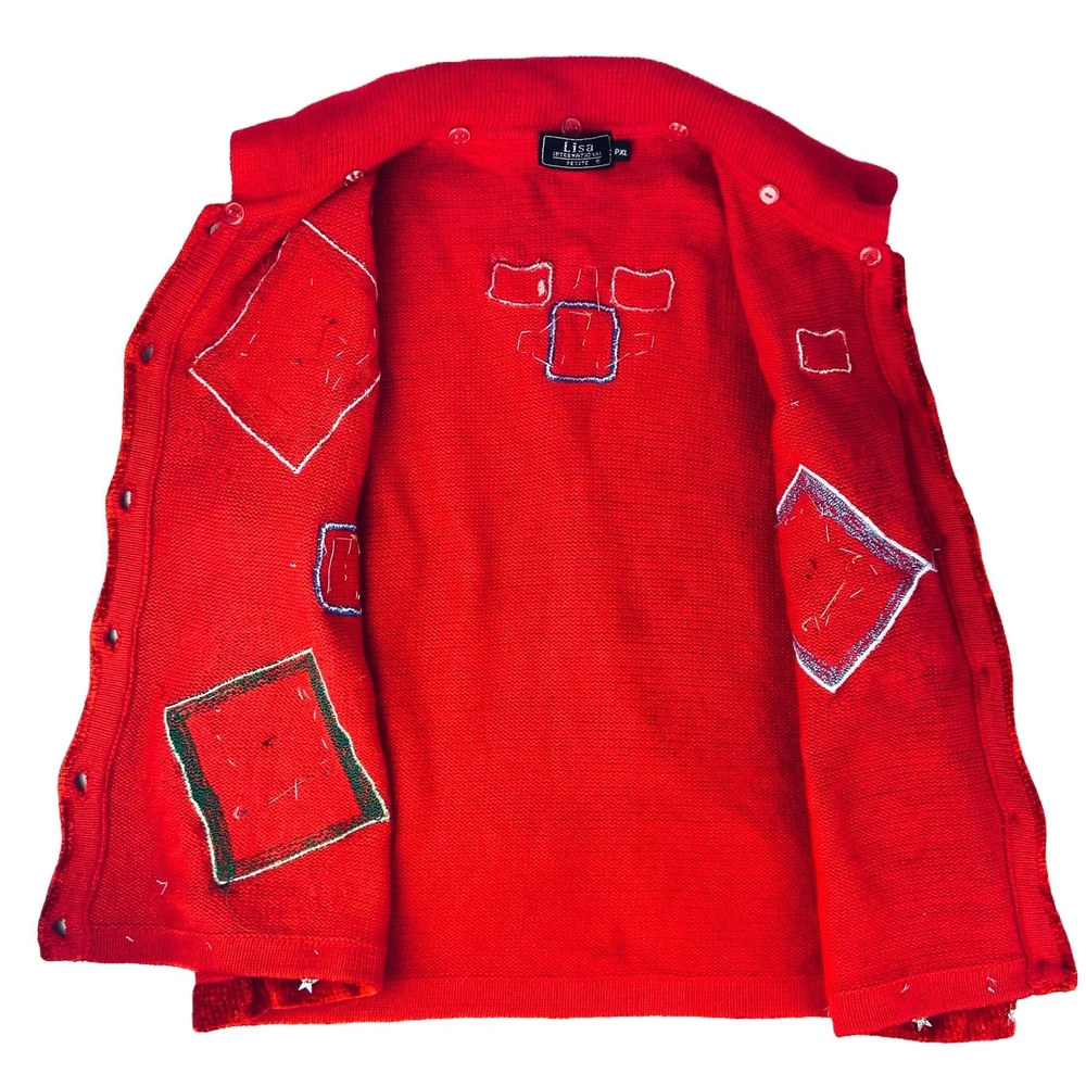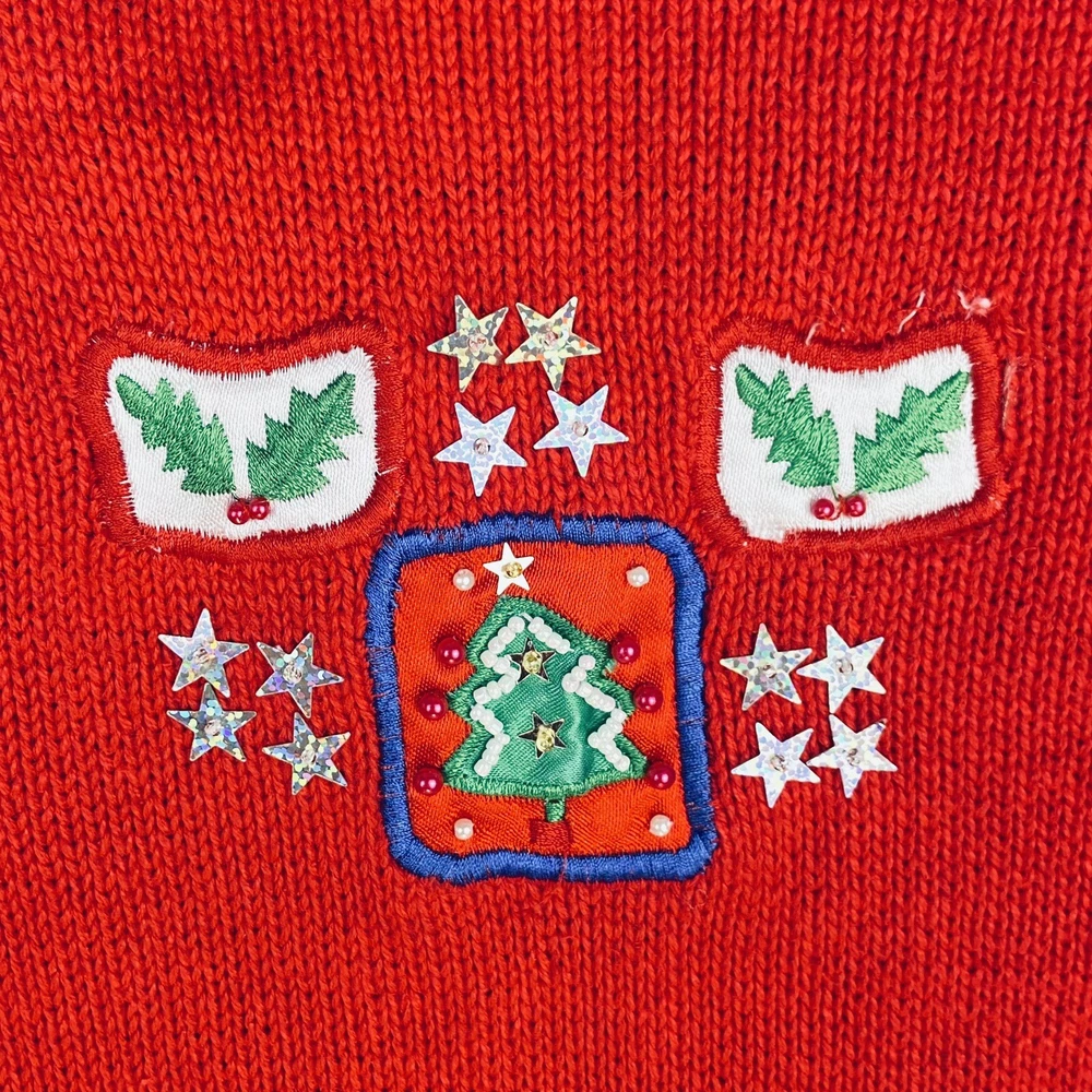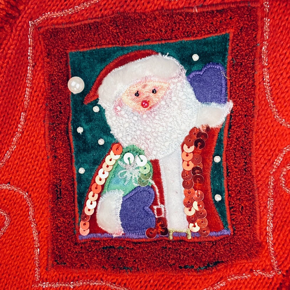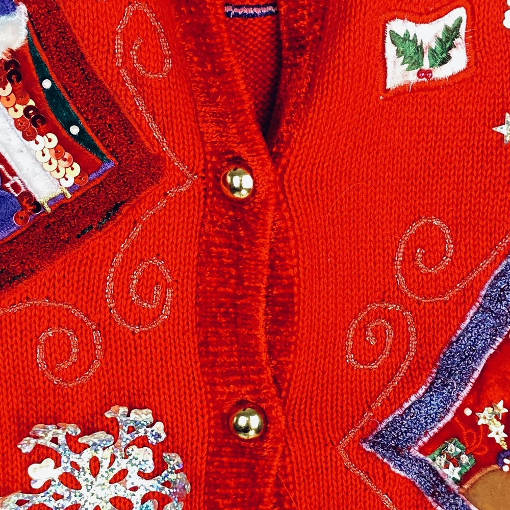 Christmas vest cardigan with gold buttons and embellished with embroidery, beading, snowflakes and stars. A cozy velvet like red trim is around arm holes, button placket, and hem. This sweater features "snapshots" of Santa, Snowman, and Rudolph. There are buttons on the inner collar to attach a fur collar - which is missing. Condition/Info: This is a pre-owned item. One of the snowflakes has edges lifting up and needs some fabric glue. Two of the tiny stars along the hemline are peeling. See last 3 photos before tag pictures. Detachable fur collar is missing. No holes, stains, or tears seen. View all pictures carefully as they are part of the description. Color in pictures may be different in person due to lighting. Size: PXL Color: Red Material: Cotton/Ramie blend Style: Sweat vest, cardigan. Boxy, short. Handwash MEASUREMENTS (approximate laying flat): Shoulder to shoulder: 16.5" Underarm to underarm: 20.5" / 41" circumference Hem opening: 21" / 42" circumference Length from bottom of collar to hem: 22" 🍄Thanks for looking! ⭐Smoke and pet-free ⭐Examine photos carefully as they are part of the description. ⭐Ships quickly - same or next business day! #Bling #Embellished #Uglychristmassweater #Christmasparty