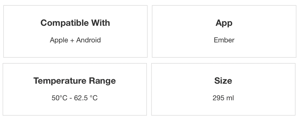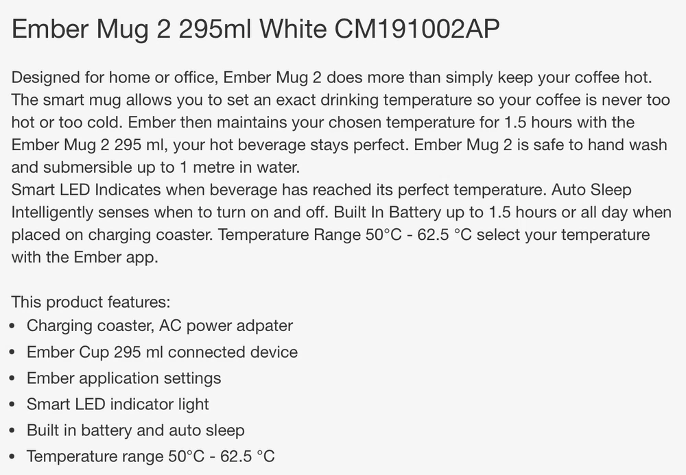 Ember Mug2 White 295ml The perfect gift for home or office, the Ember Mug2 does more than simply keep your coffee hot. This smart mug allows you to set an exact drinking temperature so your coffee is never too hot or too cold! Maintains your chosen temperature for 1.5 hours so your hot beverage stays perfect. Safe to hand wash and submersible up to 1 meter in water. Smart LED Indicates when beverage has reached its perfect temperature. Auto Sleep Intelligently senses when to turn on and off. Built In Battery up to 1.5 hours or all day when placed on charging coaster. Temperature Range 50°C - 62.5 °C select your temperature with the free Ember App. Compatible with Apple and Android devices. Includes 1 mug and 1 charging saucer. Product features : Charging coaster, AC power adpater. Ember Cup 295 ml connected device. Ember application settings. Smart LED indicator light. Built in battery and auto sleep. Temperature range 50°C - 62.5 °C Genuine and Brand New *Actual colour may vary due to monitor settings and lighting conditions. Click here to see more quality products in our store Terms and conditions: Shipping restrictions may apply to some areas and post codes Extra postage may apply to regional and northern areas Does not ship to Post Office/PO Box/Bag/Parcel Locker/Parcel Collect/Mail Bag Pick up is not available. Offers are not accepted. Delivery to non-metro areas may take longer than stated Dispatch warehouse may vary as required, at our discretion