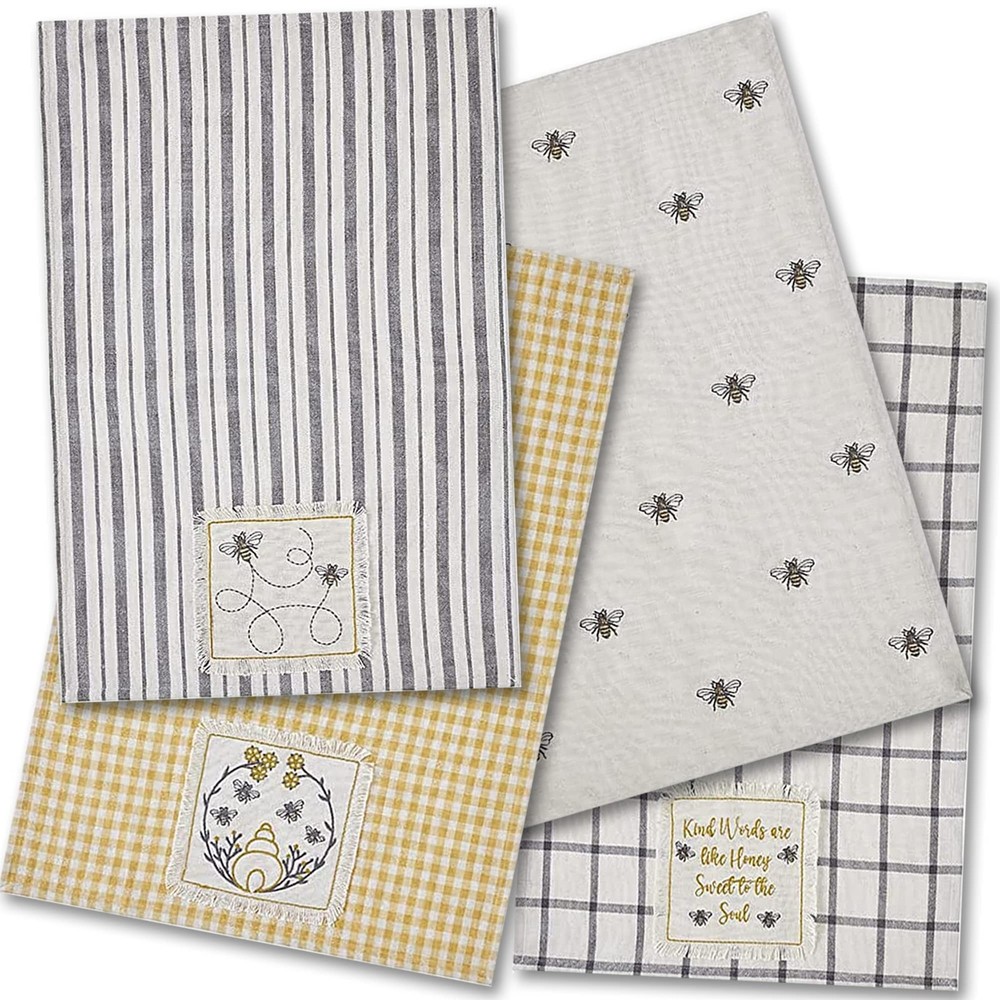 The Embroidered Bee Kitchen Tea Towel Set of 4 features a textured woven cotton base fabric with bee-inspired appliques and embroidery in natural creme, soft yellow, and charcoal grey. For your convenience, each towel includes a fabric loop for easy hanging. Towel Set: Add a cottage style to your kitchen for a farmhouse feel; Provides style and functionality for a homey feel to you decor. Textured Material: This 100% cotton flax makes this towel set extra soft and extra absorbent. Machine wash on gentle and tumble dry low. Towel Set: Our wide array of towel sets are perfect for adding a farmhouse element to your kitchen; Complements your home, lodge, cabin, retreat or lake house Farmhouse Home Decor: We offer a wide range of products to decorate your home from wall to wall; This includes bedding, window treatment, rugs, and holiday themed textiles and decorative items : After more than 3 decades, the company has grown to become a trusted brand for quality country and traditional American decor; it is our firm belief that our products will last you for years to come