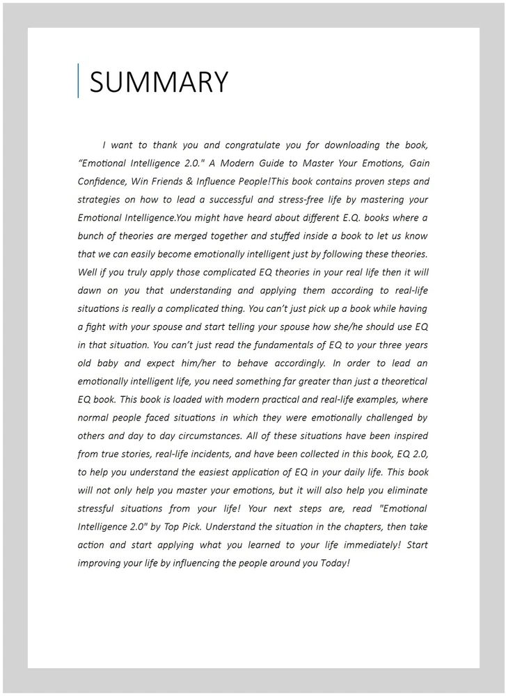 Emotional Intelligence : A Modern Guide to Master Your Emotions,gain Confidence, Win Friends & Influence People!, Paperback by Conrad, Lewis; Dogan, Ibrahim S.; Huerta, Carlos, ISBN 1544755929, ISBN-13 9781544755922, Like New Used, Free shipping in the US I want to thank you and congratulate you for ing th, “Emotional Intelligence ." A Modern Guide to Master Your Emotions, Gain Confidence, Win Friends & Influence People!This book contains proven steps and strategies on how to lead a successful and stress-free life by mastering your Emotional might have heard about different . books where a bunch of theories are merged together and stuffed inside a book to let us know that we can easily become emotionally intelligent just by following these theories. Well if you truly apply those complicated EQ theories in your real life then it will dawn on you that understanding and applying them according to real-life situations is really a complicated thing. You can’t just pick up a book while having a fight with your spouse and start telling your spouse how she/he should use EQ in that situation. You can’t just read the fundamentals of EQ to your three years old baby and expect him/her to behave accordingly. In order to lead an emotionally intelligent life, you need something far greater than just a theoretical EQ book. This book is loaded with modern practical and real-life examples, where normal people faced situations in which they were emotionally challenged by others and day to day circumstances. All of these situations have been inspired from true stories, real-life incidents, and have been collected in this book, EQ , to help you understand the easiest application of EQ in your daily life. This book will not only help you master your emotions, but it will also help you eliminate stressful situations from your life! Your next steps are, read "Emotional Intelligence " by Top Pick. Understand the situation in the chapters, then take action and start applying what you learned to your life immediately! Start improving your life by influencing the people around you Today!