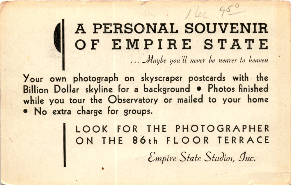 MAKE AN OFFER. THE MORE YOU BUY THE BETTER DEAL I WILL ACCEPT The postcard advertises a service by Empire State Studios, Inc., located on the 86th floor terrace of the Empire State Building in New York. The service offers visitors the opportunity to have their own photograph taken with the iconic Billion Dollar skyline in the background, creating a personal souvenir of their visit to the Empire State Building.