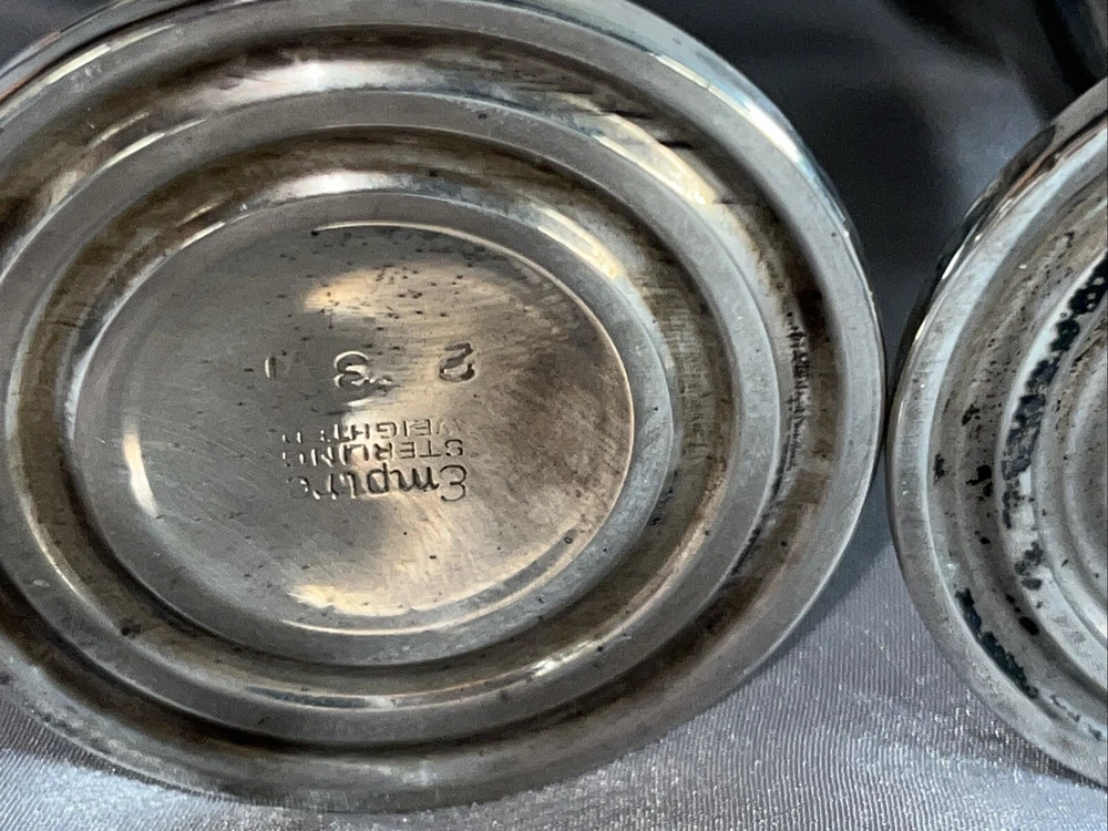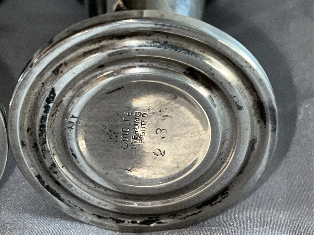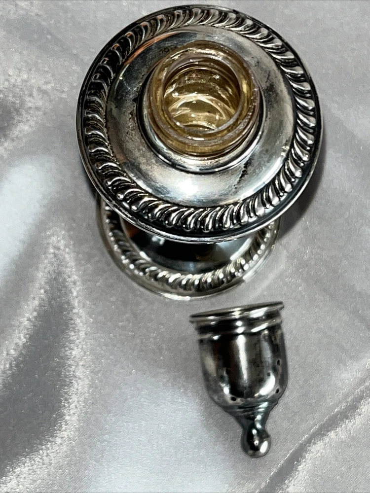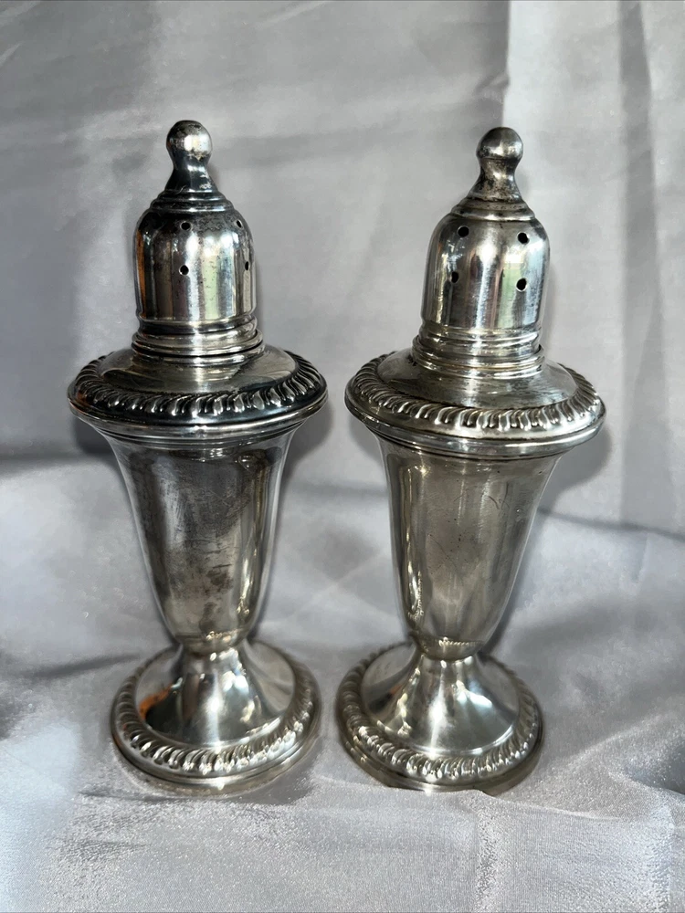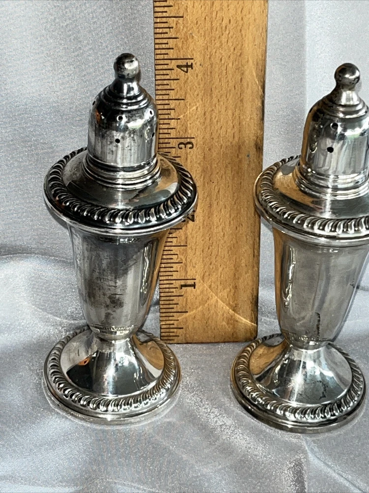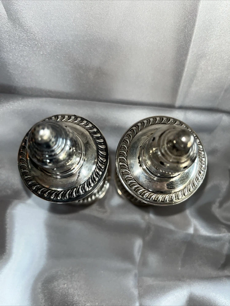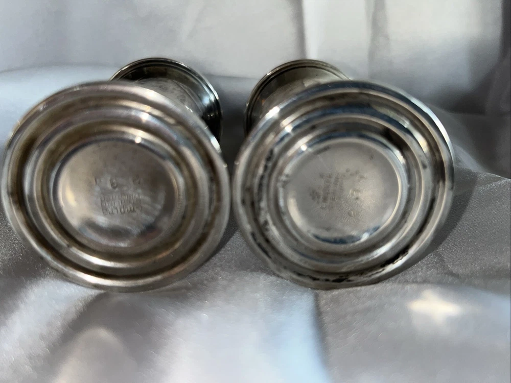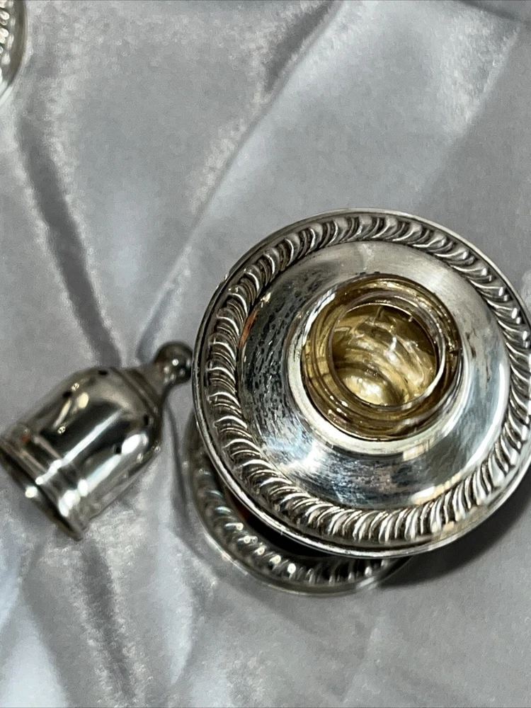 Add a touch of elegance to your dining table with these Empire Sterling Weighted 925 Silver Glass Lined 4-1/2” Salt & Pepper Shakers. Crafted with high-quality sterling silver (.925), these shakers are perfect for any occasion, whether it’s a formal dinner or a casual get-together with friends. The shakers feature a beautiful Empire pattern and are designed to hold salt and pepper. These antique shakers are a must-have for any collector or anyone who appreciates the beauty of sterling silver (.925). They are post-1940 and have a glass lining that adds a unique touch to the design. The shakers are perfect for anyone who loves to add a touch of elegance to their dining table. Please look at photos carefully they show all the details