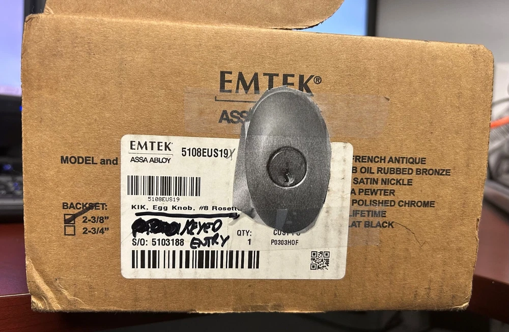 Country/Region of Manufacture:United StatesManufacturer Warranty:Sellers Offers No WarrantyType:Entry Door KnobFinish:MatteBrand:EmtekSeller Notes:“Never Used - Key is missing and will need to be made - Box may show shelf wear and or dust”Model:5108EUS19Features:Keyed EntryColor:BlackShape:Egg