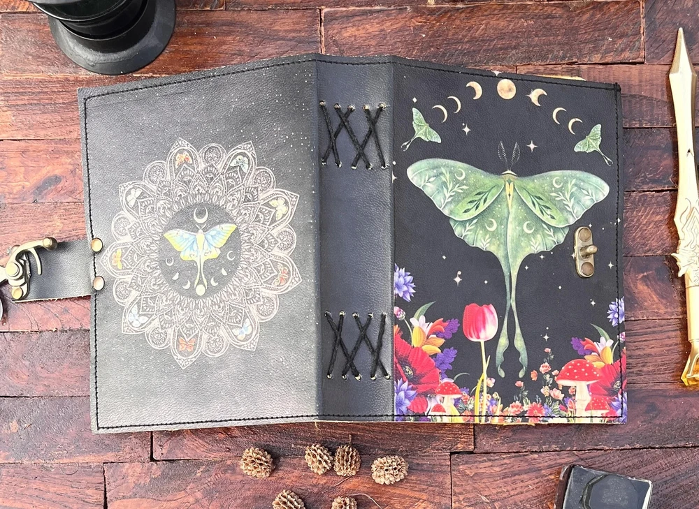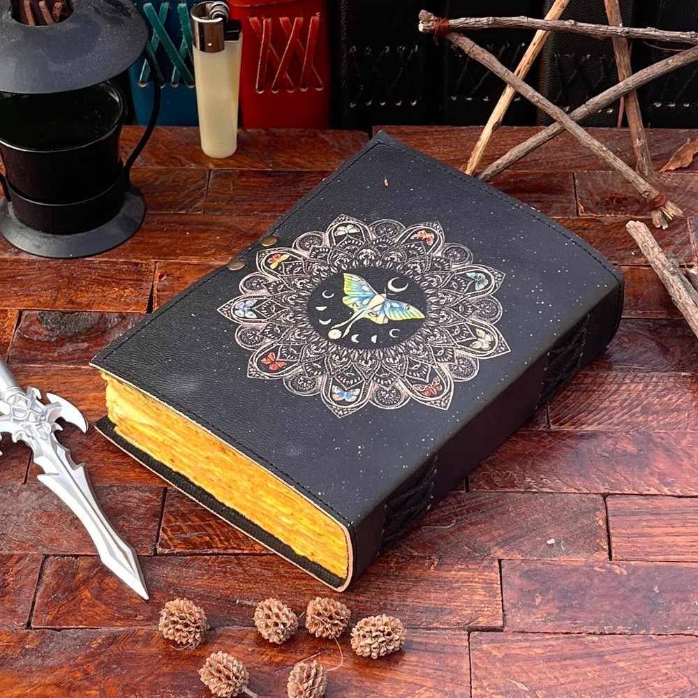 The Enchanting Luna Moth Blank Spell Book Leather Journal is a luxury edition, limited edition, and 1st edition handmade journal featuring 200 deckle-edged pages. The leather cover is personalized and the journal is crafted in India. This beautiful and unique piece offers a mystical and enchanting feel, making it an ideal choice for those seeking a special and magical writing experience. Exquisite Handcrafted Leather Journal - Luna Moth Print - 200 Deckle-Edged Pages - Available in Various Sizes" Unleash your creativity with our Exquisite Handcrafted Leather Journal featuring a captivating Luna Moth Print. This journal is a masterpiece, not just for your ideas but for your senses too. It boasts 200 premium deckle-edged pages that invite your pen to dance across their textured surface. Available in various sizes - 7x5, 8x6, 10x7, and 13x10 - you can choose the perfect canvas for your imagination. The genuine leather cover exudes quality and durability, and it even comes with a one-month warranty. Whether you're gifting it or keeping it for yourself, this journal is designed to inspire and endure. Get ready to embark on a creative journey like no other. Leather Journal Luna Moth Print Handcrafted Notebook Unique Artistic Diary Deckle-Edged Pages Premium Vintage Leather Sketchbook Nature-Inspired Writing Journal Rustic Leather Traveler's Diary Blank Page Personalized Notebook Elegant Luna Moth Design Quality Leather Bound Book Creative Gift Idea Available in 7x5, 8x6, 10x7, and 13x10 sizes