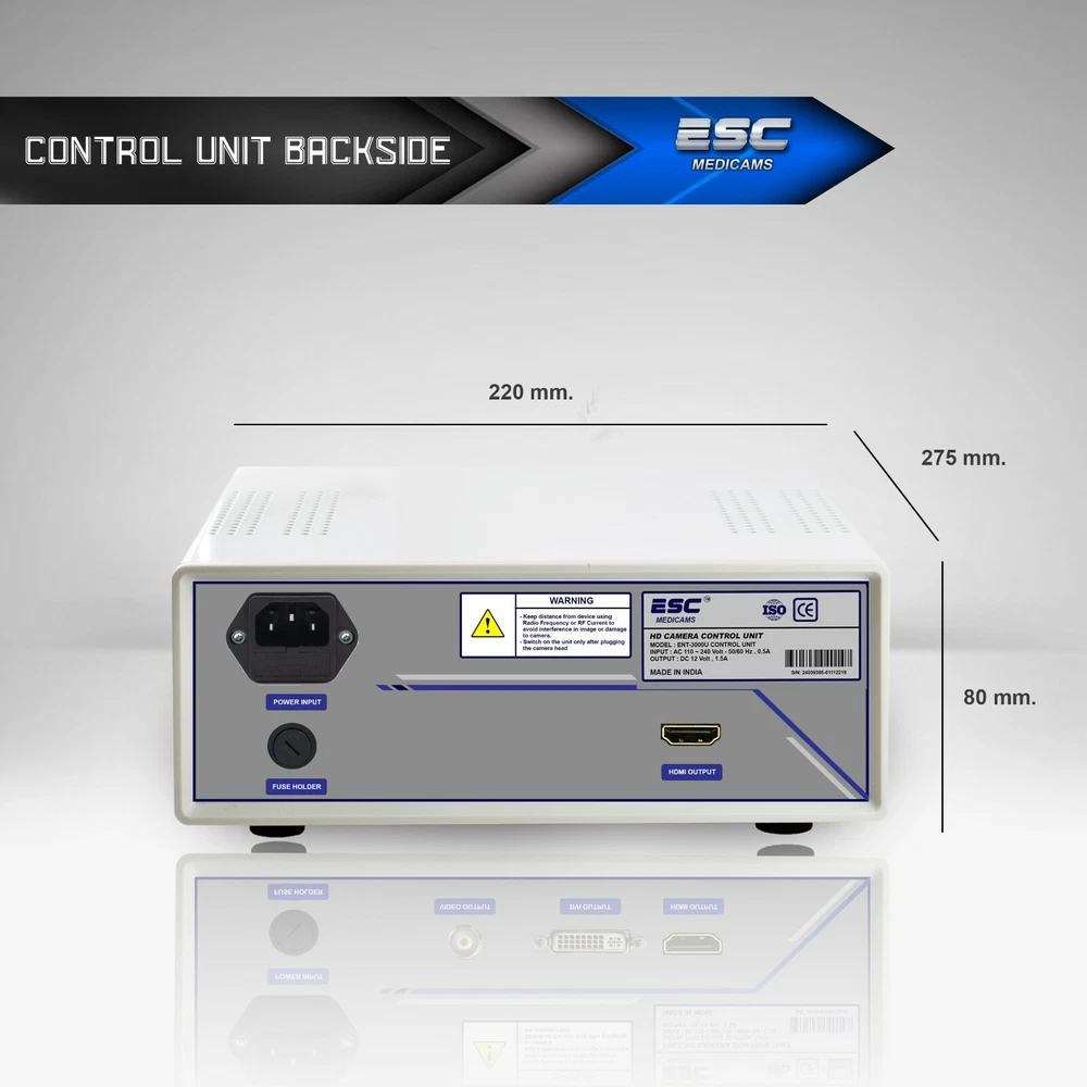 ESC MEDICAMS ESC-HD3100 HD PROFESSIONAL ENDOSCOPY CAMERA WITH LATEST HDR TECHNOLOGY ESC-HD3100 Endoscope Camera is adapts latest HDR technology which provides sharper details with low delay and high color accuracy. Its HD 1.2 Megapixel Resolution promises sharp and noise free images with vibrant colors. With latest dsp technology, it maintains true color of images by rapid auto gain control in all light conditions. With new intelligent White Balance Button on camera head doctors can achieve actual color rendition as White Balance uses information from the scene and calibrates how white object should appear under different light sources and conditions, thus providing accurate result. It has latest german glass lens with anti-reflective coating to prevent glare from liquids.Its premium handheld design is accompanied with german quality Full HD Glass lens Optical Coupler which ensures the fine-focus optical requirements of the Endoscopy Camera System and provides Crisp and Sharp HD images. For extra added protection it comes with heavy duty Medical Grade Power Supply. KEY FEATURES:- 1.) INTELLIGENT WHITE BALANCE - With its new intelligent white balance technology high color accuracy can be achieved in even challenging conditions which involves blood - ESC-HD3100 Camera has One Press White Balance button on camera head for hassle free usage during surgery which let you tell the camera precisely how the image appears in actual, thus providing more accurate results. 2.) LATEST DSP WITH HDR TECHNOLOGY - ESC-HD3100 adapts latest HDR Technology which provides 1.2 Megapixel resolution and at the same time gives sharper and noise free images. - Due to the nature of endoscopy, the level of tissue illumination is often very uneven. - Therefore, even if an endoscope provided accurate color reproduction under ideal test conditions, actual tissue color will vary constantly during live endoscopy. - ESC-HD3100 comprises of High Power DSP which eliminates this problem and captures vibrant color . 3.) RECORD AND TAKE SNAPSHOT INTO LAPTOP/ PC - Plug n Play Connection to Laptop. - Software provided to record videos and take snapshot. 4.) 5x Zoom - Now perform in-depth analysis with 5x digital zoom feature. - ESC-HD3100 Camera has warranty of 1 year - We deliver what we promise here - We don't compromise with the quality - We understand the importance of after sales service and support ABOUT US We are an India-based company with vast experience in the field of Medical grade cameras, Endoscopy cameras, Laparoscopy cameras and Microscope cameras. All this has contributed in making is a leading manufacturer and distributor worldwide in the field of medical equipments. In ESC, quality is our first priority. We focus on making healthcare better for our clients and customers by providing innovative products and services that meet our customers' demands. We are an organization with a goal to provide high quality Medical Cameras at competitive price.