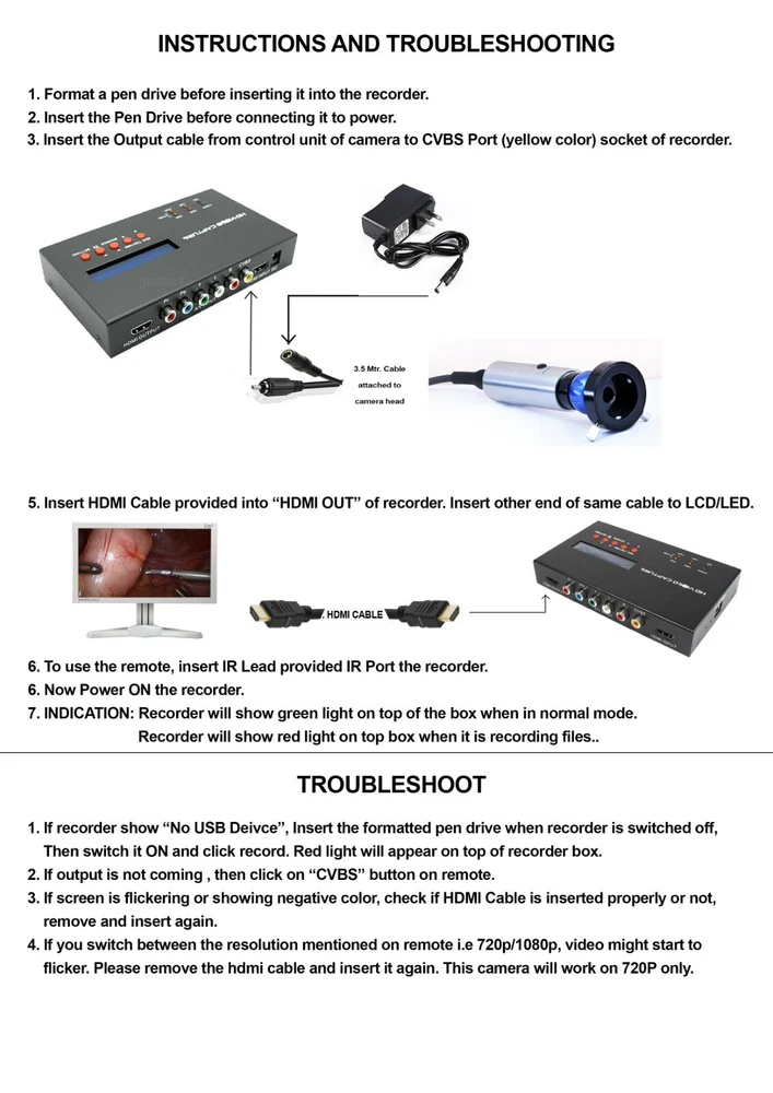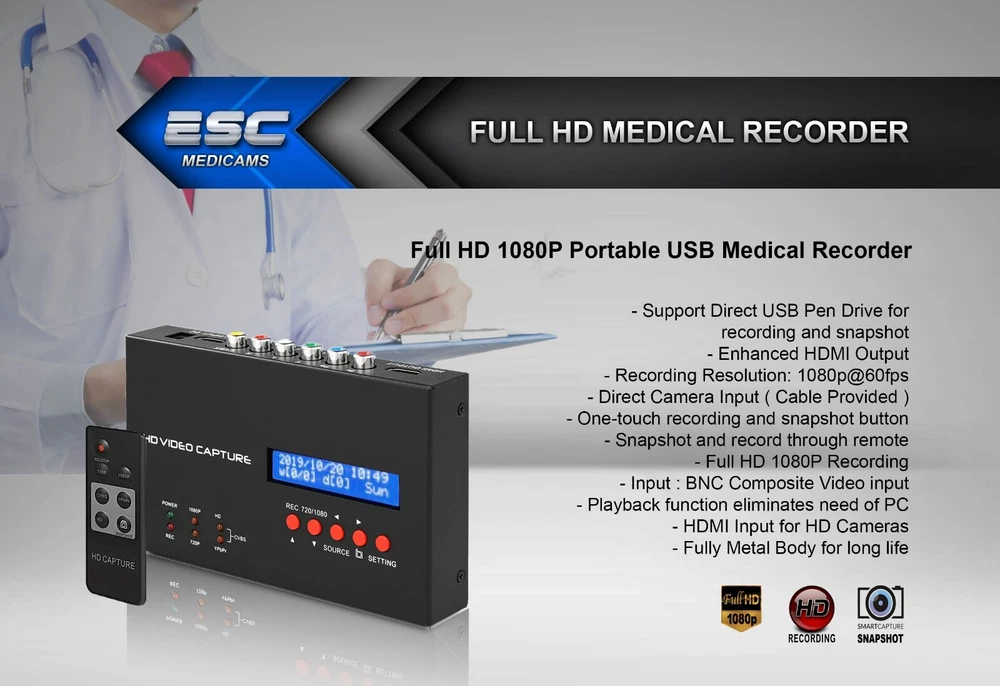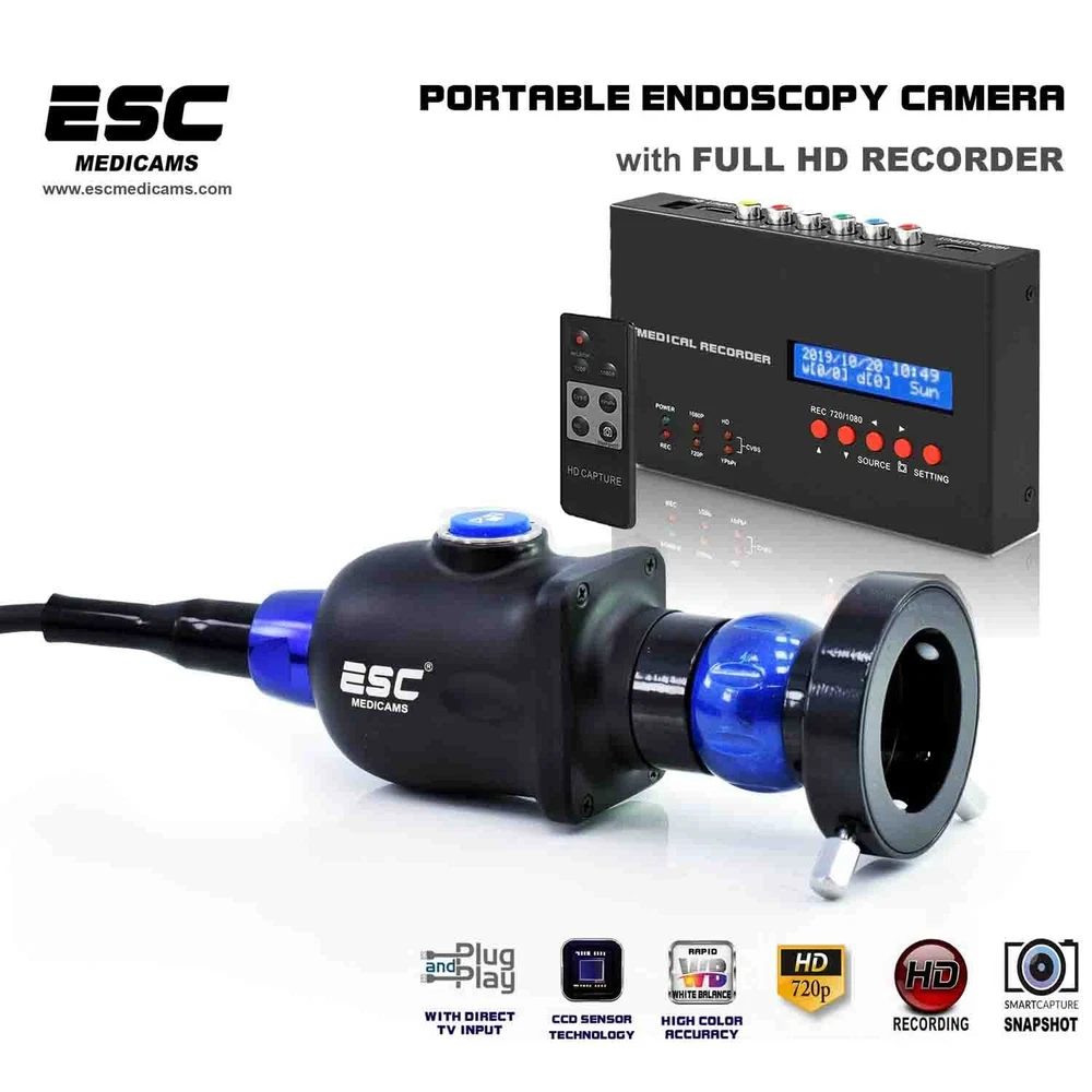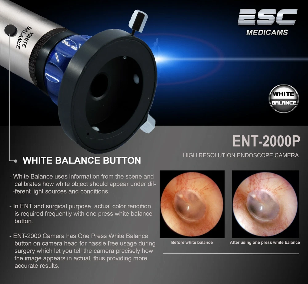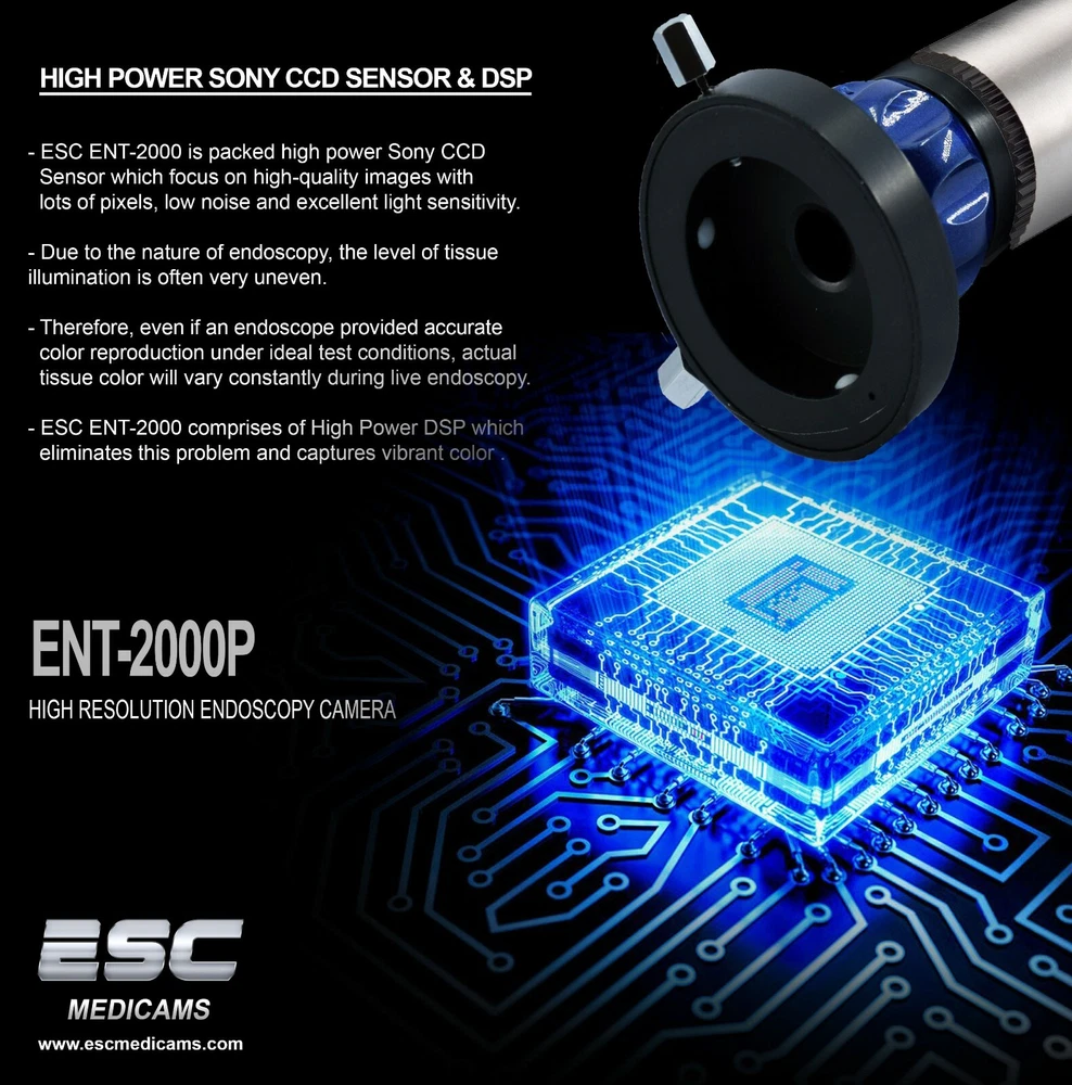 ESC CCTV SYSTEMS & MEDICAMS ENT-2000P HD ENDOSCOPY PORTABLE CAMERA 1.2 MEGAPIXEL CCD WITH TRUE COLOR WHITE BALANCE BUTTON AND FULL HD RECORDER ESC ENT-2000 Endoscope Camera is packed with high power ccd sensor which focus on high-quality images with lots of pixels, low noise and excellent light sensitivity. Its HD 1.2 Megapixel Resolution promises sharp images with vibrant colors. With latest dsp technology, it maintains true color of images by rapid auto gain control in all light conditions. With its quick One-press White Balance Button on camera head doctors can achieve actual color rendition as White Balance uses information from the scene and calibrates how white object should appear under different light sources and conditions, thus providing accurate result. Its compact handheld design is accompanied with german quality Full HD Glass lens Optical Coupler which ensures the fine-focus optical requirements of the Endoscopy Camera System and provides Crisp and Sharp HD images. For extra added protection it comes with heavy duty Medical Grade Power Supply. KEY FEATURES:- 1.) WHITE BALANCE ONE PRESS KEY - White Balance uses information from the scene and calibrates how white object should appear under dif- -ferent light sources and conditions. - In ENT and surgical purpose, actual color rendition is required frequently with one press white balance button. - ENT-2000 Camera has One Press White Balance button on camera head for hassle free usage during surgery which let you tell the camera precisely how the image appears in actual, thus providing more accurate results. 2.) FULL HD 1080P RECORDING AND IMAGE CAPTURING INTO USB DRIVE - Record videos and capture image directly into usb pen drive - Direct HDMI Output for enhanced HD Imaging 2.) HIGH POWER CCD & DSP - ESC ENT-2000 is packed high power CCD Sensor which focus on high-quality images with lots of pixels, low noise and excellent light sensitivity. - Due to the nature of endoscopy, the level of tissue illumination is often very uneven. - Therefore, even if an endoscope provided accurate color reproduction under ideal test conditions, actual tissue color will vary constantly during live endoscopy. - ESC ENT-2000 comprises of High Power DSP which eliminates this problem and captures vibrant color . - ENT-2000 Camera has warranty of 1 year - We deliver what we promise here - We don't compromise with the quality - We understand the importance of after sales service and support ABOUT US We are india based company and has vast experience in the field of medical grade cameras, Endoscopy Cameras, Laparoscopy cameras and microscope cameras which has helped us to become leading manufacturer and distributor worldwide in the field medical equipments . In ESC, quality is our first priority. We focus on making healthcare better for our clients and customers by providing innovative products and services that meet our customers's demand. We are a organization with a goal to provide high quality Medical Cameras at competitive price.