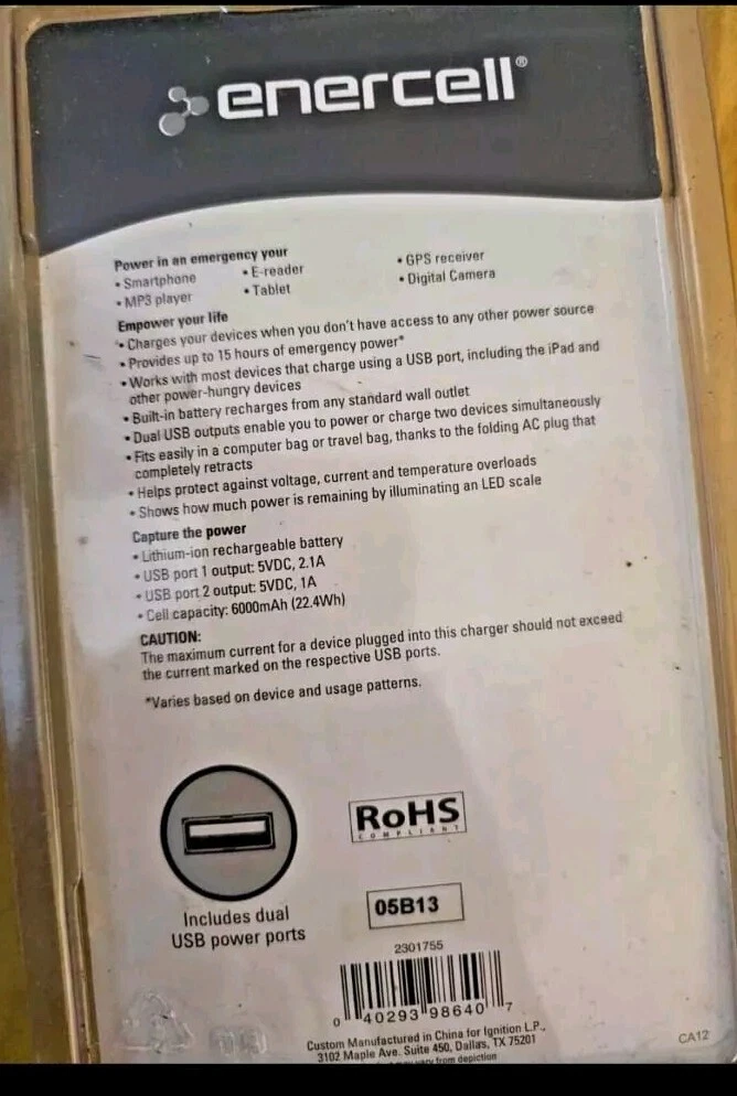 The Enercell 2301755 6000mAh 2-port Universal Portable Power Bank is a black aluminum power bank with a plastic grip design. It has 1 port and includes a charging cable. It operates at 5V voltage and connects via Micro-USB, suitable for universal compatibility.