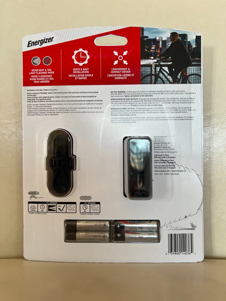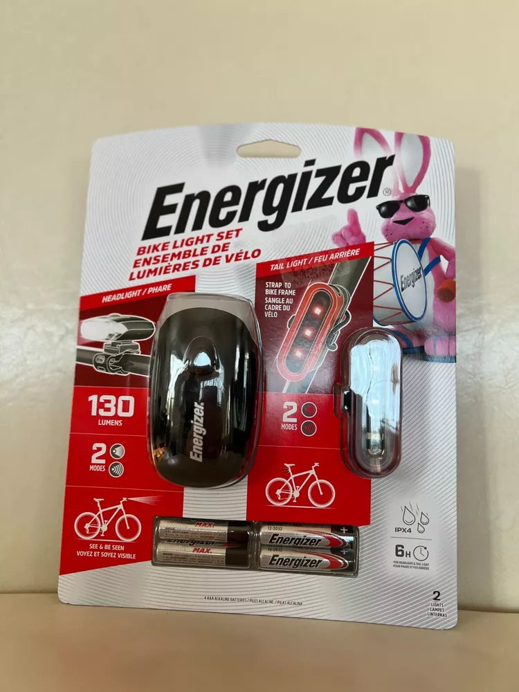 Energizer Bike Light Set, new in package. Includes headlight and tail light and 4 AAA Batteries. See and be seen while riding your bike in low visibility areas.