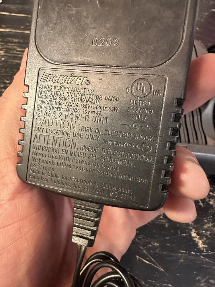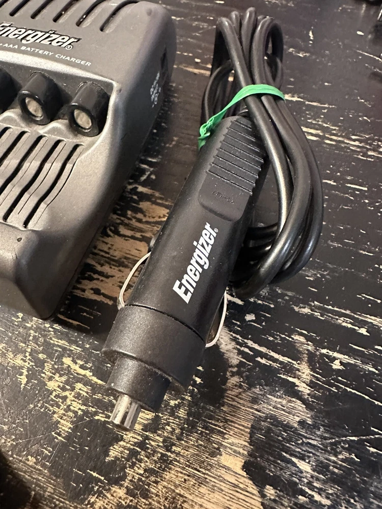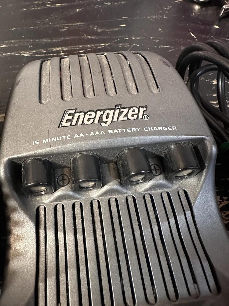 Good condition. This energizer 15 minute fast battery charger includes cords for a home wall outlet and a car 12 V.
