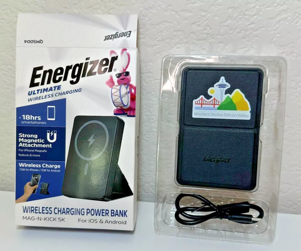 Energizer x Google Cloud Wireless Charging Power Bank Mag-N-Kick iphone/Android QM5004 This Energizer® Mag-N-Kick™ Power Bank magnetically holds to newer compatible phones. It has a convenient fold-out stand to prop up on a desktop surface to keep your hands free. Features: -Strong magnetic attachment (for iPhone Magsafe feature & more) -Wireless charge (7.5W for iPhones, 15W for Android) -Charge & use vertically or horizontally -Includes charging cable Specifications: Model: QM5004 Cell Type: Lithium Polymer Battery Capacity: 5000mAh/18.5 Wh(Max) Rated Input: USB-C 5V/2.4A Rated Output: USB-A 5V/2.4A Raed Output: USB-C 5V/3A Wireless Output: 5W/7.5W/10W/15W Total Output: 15W (Max) Dimensions: 97mm(L) x 63mm (W) x 16mm (H) Brand New, never used, in original box/packaging. Ready to ship!