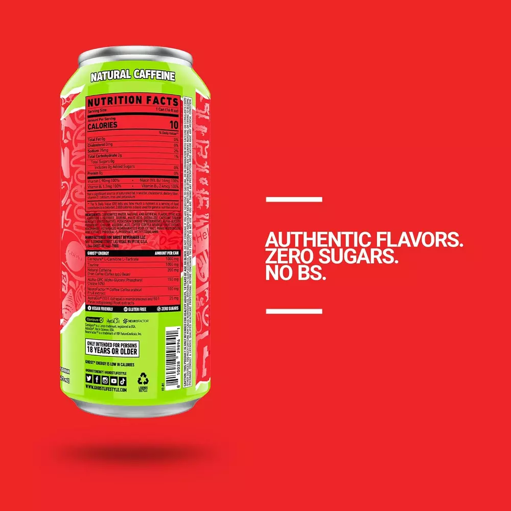 Feel-Good Energy: GHOST Energy is the fully transparent, fully loaded energy drink we’ve all been waiting for. No artificial colors. No BS. Authentic Cherry Limeade flavor. 12-pack. Only intended for persons 18 years or older. Legendary Energy: This drink contains 200mg of Natural Caffeine from coffee beans, which has been found anecdotally to deliver a smooth, feel-good energy with less jitters and no crash when compared to other forms of caffeine. Epic Focus: GHOST Energy combines the nootropics of Carnipure L-Carnitine, Alpha-GPC, Neurofactor, and AstraGin to help your body convert fatty acids into energy, support brain and cognitive function, and absorb a wide range of nutrients.* Total Transparency: All GHOST products feature a transparent label that fully discloses the dose of each active ingredient. Zero proprietary blends means you know what you’re getting in each and every sip. GHOST Energy is vegan-friendly and gluten-free. Perfect Energy and Focus Combo: GHOST Energy is a full disclosure energy drink that delivers on efficacy and the info to ensure you know exactly what you're getting in every can. Combining 200mg of natural caffeine with nootropics to deliver the perfect combo of energy and focus. Product Description