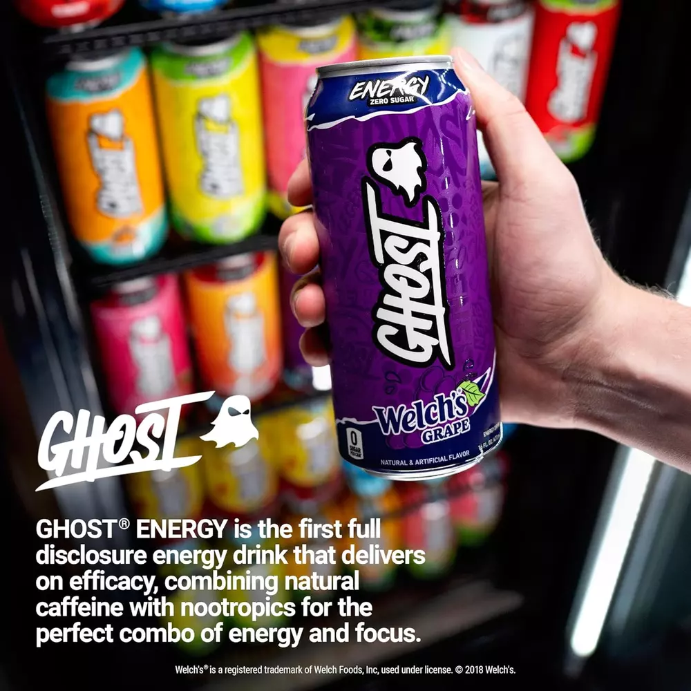 Feel-Good Energy: GHOST Energy is the fully transparent, fully loaded energy drink we’ve all been waiting for. No artificial colors. No BS. Authentic Welch's Grape flavor. 12-pack. Not intended for 18 and under. Legendary Energy: This drink contains 200mg of Natural Caffeine from coffee beans, which has been found anecdotally to deliver a smooth, feel-good energy with less jitters and no crash when compared to other forms of caffeine. Epic Focus: GHOST Energy combines the nootropics of Carnipure L-Carnitine, Alpha-GPC, Neurofactor, and AstraGin to help your body convert fatty acids into energy, support brain and cognitive function, and absorb a wide range of nutrients.* Total Transparency: All GHOST products feature a transparent label that fully discloses the dose of each active ingredient. Zero proprietary blends means you know what you’re getting in each and every sip. GHOST Energy is vegan-friendly and gluten-free. Perfect Energy and Focus Combo: GHOST Energy is a full disclosure energy drink that delivers on efficacy and the info to ensure you know exactly what you're getting in every can. Combining 200mg of natural caffeine with nootropics to deliver the perfect combo of energy and focus. Product Description