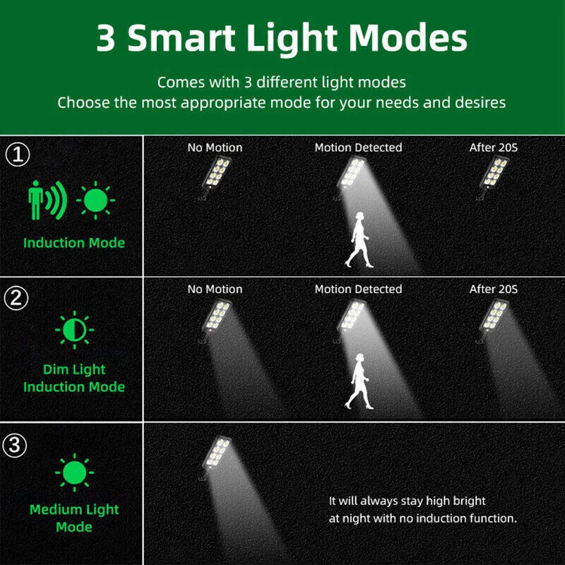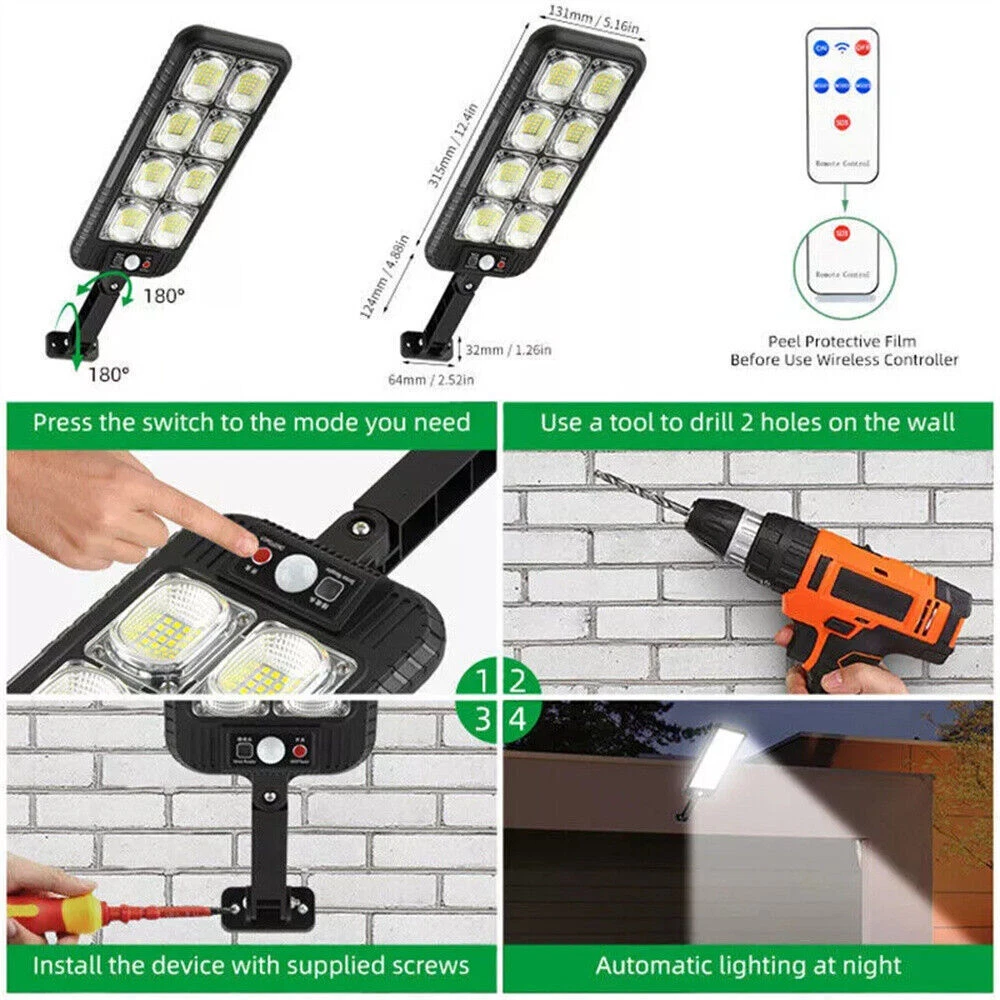 Product Description Product Description Commercial Solar Street Flood Light LED Lamp Outdoor Area Dusk-To-Dawn Wall Lamp Description: LED Solar Light Outdoor: The LED solar street lights outdoor produce ultra-high brightness illumination for a wide area, providing lighting and security to front door, pathway, gutter, porch, front/back yards, gardens, driveways, fence, wall, stairways, landscape, patio or any outdoor places that needs lighting, bring you a super bright lighting experience. 3 Optional Modes & Remote Control: 1. Sensing Mode - Strong light for 20s once movement detected, then turn off. 2. Constant Light + Sensing Mode - Dim light all night, and strong light for 20s when sensor detects movement. 3. Constant Light Mode - Medium light mode all night. 120° Wide-Angle Solar Lighting: The outdoor wall lights features high sensitivity and adjustable bracket design, can sensitively sense moving objects in 10 ~ 15ft with 120° range, providing security and convenience for your home when night falls. High Efficient Solar LED Outdoor Lights: These solar light are made of more energy saving laminated solar panel and premium LED lights, which will be more long-lasting and suitable for longer usage time. Build-in 2400mAh rechargeable lithium-ion battery to allows the LED solar lights to be continuously illuminated for 6 ~ 10 hours in bright mode to meet your lighting needs. IP65 Waterproof & Easy Installation: The solar street lights is made of long-lasting and high-impact ABS Material which makes it to withstand a variety of outdoor environments and other extreme weather conditions. Easy to install and set, no wire and tools need. Specification: Product Name: Solar Street Light Light Body Material: ABS + PC Light Color: Cold White 6500K LED QTY: 200SMD Waterproof: IP65 Battery Capacity: 3.7V 2400mAh Charging Time: 6 ~ 8hrs Direct in the Sun Working Time: 6~ 10hrs Installation Height: 2 ~ 3m / 6.56 ~ 9.84ft Lamp Body Size: 31.5 x 13.1cm / 12.4 x 5.16in Light Arm: 12.4cm / 4.88in 3 Lighting Modes: OFF: Light OFF Mode; Mode 1: Lights on when people pass by, lights off when people leave; Mode 2: Lights on when people pass by, 20% brightness when people are away; Mode 3: Automatically light up when dark, Keep on till the sky gets bright. Package Included: 1 x Solar Street Light 1 x Remote Control 1 x Set of Installation Accessories Anti-Aging Laser Plasma Pen Skin Wart Tag Tattoo Mole Removal Dark Spot Remover 17.89 USD Free shipping 279838 Dryer Heating Element & 279816 & Thermostat 3392519 Dryer Fuse Combo Pack 21.45 USD Free shipping 54 Inch Gray 6 Pack Shotgun / Rifle Socks Hunting Gun Sleeve Silicone Treatment 19.49 USD Free shipping 1 Pair Leg Massager Cordless Calf Air Compression Massager Heated Pain Relief US 39.99 USD Free shipping Decompression Belt Back Brace Lumbar Spinal Support & Extender Belt Air Traction 24.49 USD Free shipping HDMI Splitter 1 In 2 Out 4K UHD HD 1080P 2-Port Repeater Splitter Amplifier 1x2 12.09 USD Free shipping