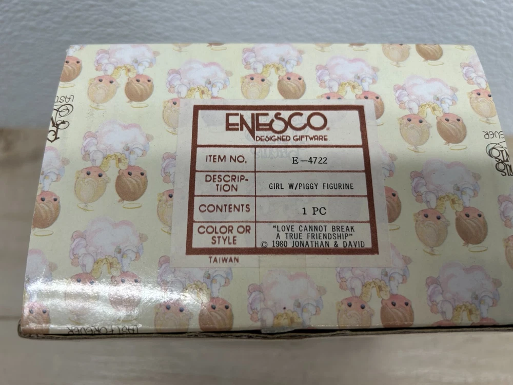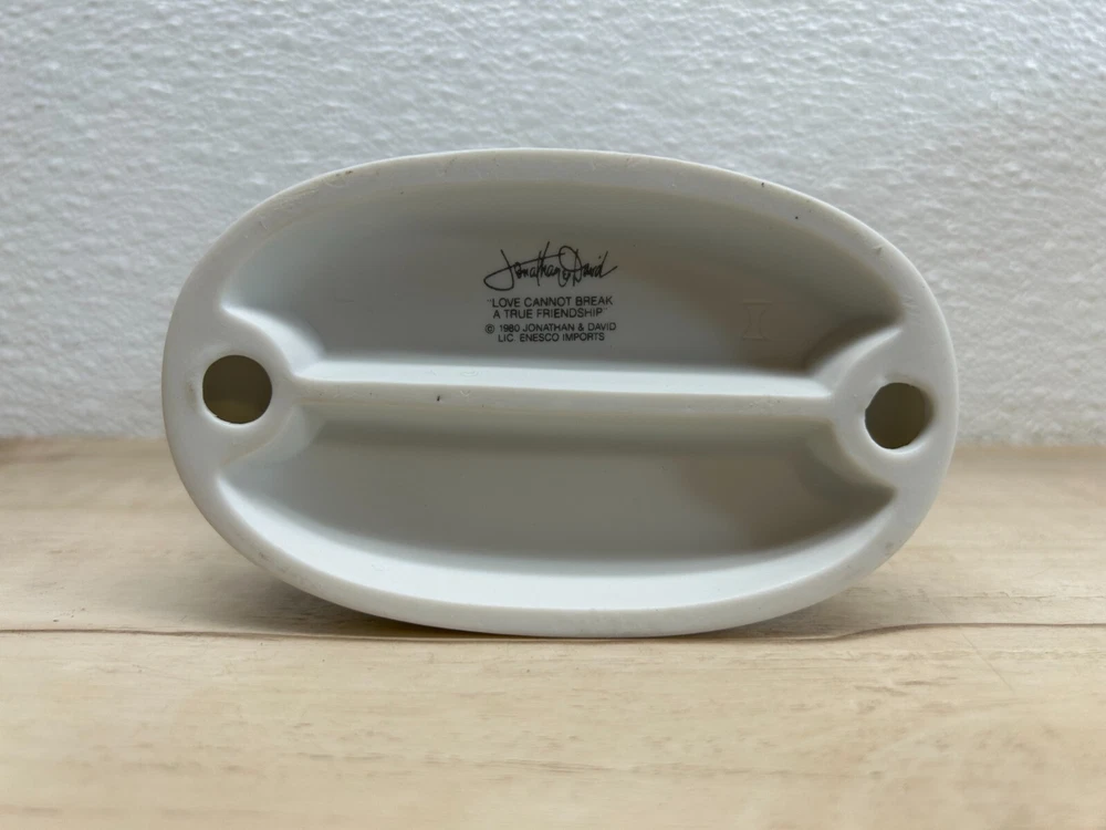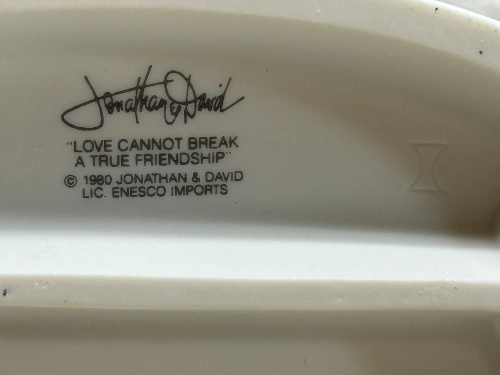 1980 Enesco Jonathan & David Love Cannot Break A True Friendship Porcelain Figurine.In like new condition-no defects.It comes with original box.The box have signs of age and it is taped on the bottom.Please see all pictures WE OFFER COMBINED SHIPPING AND MULTI-ITEM PURCHASE DISCOUNTS.IF YOU HAVE ANY QUESTIONS, PLEASE LET US KNOW