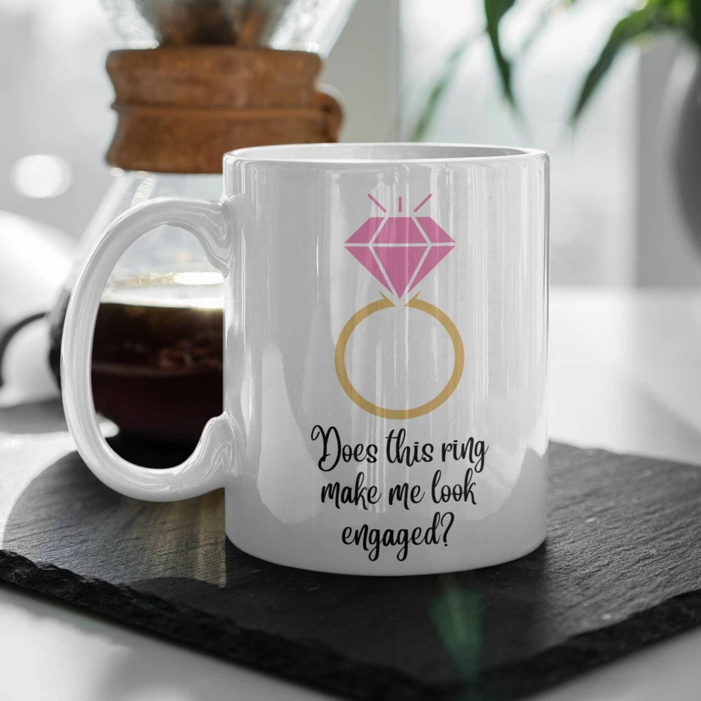 Engagement Gift Engagement Mug Engagement Ring Does This Ring Make Me Look Engaged Wedding Gift Gift For Wedding Bride To Be Product Details.. This high quality 11oz. ceramic white mug has a premium hard coat that provides crisp and vibrant color reproduction sure to last for years. Perfect for all hot & cold beverages. The highest quality printing possible is used. It will never fade no matter how many times you wash it. Material: 100% Ceramic. Print both sides. Dishwasher and Microwave Safe. High Gloss + Premium White Finish. Printed in the U.S.A. Personalized & Custom. We support personalized and custom mug to add custom, when placing an order, you can add notes to the "order note" in shipping address section. Also you can contact us directly via message. Shipping Info. Ready to ship in 1 to 2 business days, All products are made-to-order and proudly printed in the United States. Shipped by USPS and DHL, You will receive your order in 5-7 days. Replace & Refund. All products are defective during shipping broken, chipped will be replaced free of charge. You are not satisfied with the product, we will refund 100% money to you. If any other issues arise, please do not hesitate to message, we would be more than happy to assist you.
