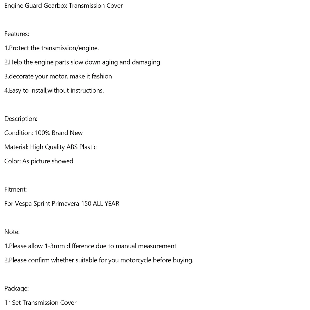 Gas Tank Fuel Cock Valve Petcock fit for Yamaha YZF R1 XJ900 YZ80 4KM-24500-00 18.76 USD Free shipping For BMW E46 323i 325i 328i 330i M3 305 02-06 LHD Center Console Trim Base BE F13 70.61 USD 74.33 USD Free shipping 5% off 6L80 6L90 Transmission Rebuild 1-2-3-4 3-5-Reverse Clutch Seals Pack O-Rings 20.89 USD 21.99 USD Free shipping 5% off 7" LCD Digitizer Touch-Screen C070EAT01.0 For Uconnect Radios VP2 2018-2022 83.4 USD 87.79 USD Free shipping 5% off NEW Set of 4 Door Handles Chrome For Chrysler 300 & 300C 2005-2010 4589009AH USA 74.87 USD Free shipping 1pcs Fuel Injectors 7561277 13537561277 Fit BMW N45 N46N E93 320I 2.0L 17.87 USD Free shipping Oil Cooler Filter Housing Seal Gasket O-ring 21304-JA11A For Nissan Armada Titan 10.68 USD Free shipping CNC Adjustable Kickstand Side Stand Fit HONDA CBR 600 1000 RR 600RR 1000RR 41.86 USD Free shipping M18X1.5 Female Aluminum Weld On Fitting Bung US 11.2 USD 11.79 USD Free shipping 5% off CARBURETOR CARB REPAIR REBUILD KIT FOR GY6 125CC Aprilia PD24J BMW ATV Go Kart 15.79 USD Free shipping STATOR & GASKET Fits YAMAHA YFZ450 2004 2005 2007 2008 2009 2012 2013 UE 56.88 USD 59.87 USD Free shipping 5% off Pair Silver Motorcycle Handlebar Riser Kit Moves Bar Up For BMW F800GS 2008-2017 33.13 USD 34.87 USD Free shipping 5% off A Fantastic Shop Send us a message Our Store Seller Profile Feedbacks Save this seller Contact Engine Guard Gearbox Transmission Cover For Vespa Sprint Primavera 150 White Engine Guard Gearbox Transmission Cover Features: 1.Protect the transmission/engine. 2.Help the engine parts slow down aging and damaging 3.decorate your motor, make it fashion 4.Easy to install,without instructions. Description: Condition: 100% Brand New Material: High Quality ABS Plastic Color: As picture showed Fitment: For Vespa Sprint Primavera 150 ALL YEAR Note: 1.Please allow 1-3mm difference due to manual measurement. 2.Please confirm whether suitable for you motorcycle before buying. Package: 1* Set Transmission Cover About US About Our Items We strive to describe all items accurately and thoroughly, with the utmost care and attention to detail. However, to ensure a mutually satisfactory transaction, we kindly ask for your assistance in thoroughly reviewing the item description and photos, and addressing any questions before placing a bid. Customer Satisfaction We stand behind our commitment with exceptional service, a 100% money-back guarantee, and a dedication to customer satisfaction. I am readily available to address any inquiries or concerns you may have, both before and after your purchase. Our aim is to ensure your shopping experience is enjoyable and that you're delighted with your purchase. Feedback Your feedback is crucial to our business's success. If you're satisfied with your purchase and the service you received, we would greatly appreciate your positive feedback, along with an overall Detailed Selling Rating (DSR) of 5. Please take a moment to leave us positive feedback. Our eBay account is set up to automatically reciprocate positive feedback once yours is received. If you're considering leaving neutral/negative feedback or opening an eBay/PayPal case, we encourage you to reach out to us immediately. We're committed to resolving any issues to the best of our ability. Shipping Parcel will be shipped using Standard shipping method. For security purposes, items will be shipped exclusively to the confirmed address on Paypal. Please ensure your Shipping address is up to date before proceeding with payment. Estimated delivery time within the United States ranges from 3 to 10 business days, depending on your location. Returns We accept returns within 60 days from the date the buyer receives the item. If the item is found to be defective upon receipt, the customer has up to 30 days from the date of receipt to request an exchange for a new item or a refund. For returns due to a change of mind, we accept items in their original selling condition. However, if the package has been opened due to a mistaken order, it does not qualify for our return policy. Please note that the buyer is responsible for covering the cost of return postage. If you encounter any issues, please reach out to us via eBay message, and we'll respond within 24 hours. Chrome Side Panel Storage Box Plating Trim Strip For BMW K1600GTL 2011-2018 ⏳ 65.35 USD 68.79 USD Free shipping 5% off Windshield Plate Side Panels for BMW R1200GS ADV 2014-2020 R1250GS ADV 19-21 QL 23.79 USD Free shipping Fork Lower Leg Deflectors Shield Cover For Touring Electra Glide FLHT 2000-13 TU 26.79 USD Free shipping Unpainted ABS Headlight Guard Bracket Fairing For YAMAHA MT09 FZ09 2017-2020 44.87 USD Free shipping Red Flames Injection Fairing Kit Plastic Fit for Kawasaki ZX10R 2006 2007 US 299.0 USD Free shipping Injection ABS Plastic Bodywork Fairing Fit for Kawasaki Z650 2017-2019 V1 284.08 USD 299.03 USD Free shipping 5% off NEW Injection Fairing Kit Bodywork Plastic ABS For BMW M1000RR S1000RR 2019-2022 609.78 USD Free shipping Frame Fairing Cowl Guards Radiator Cover For BMW R1250GS ADV 2018-2023 Carbon 73.14 USD 76.99 USD Free shipping 5% off Rear Seat Cover cowl Fit BMW S1000RR 2009-2012 2013 2014 Black 32.41 USD Free shipping Gas Fuel Oil Tank Pad Protector Cover For BMW R1250GS R1200GS 2014-2022 13.51 USD Free shipping Windshield Headlight Bezel Upper Fairing fit For Indian Scout sixty 2015-2022 178.69 USD Free shipping Fairing Kit Bodywork ABS fit For Ducati 1098 2007-2012 #4 359.0 USD Free shipping