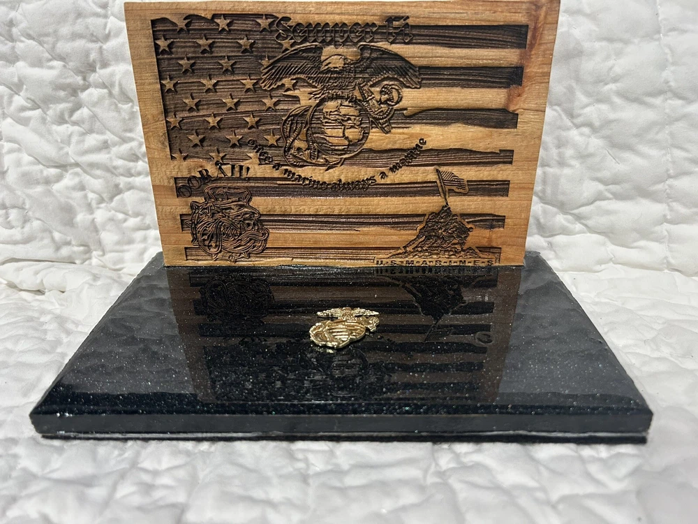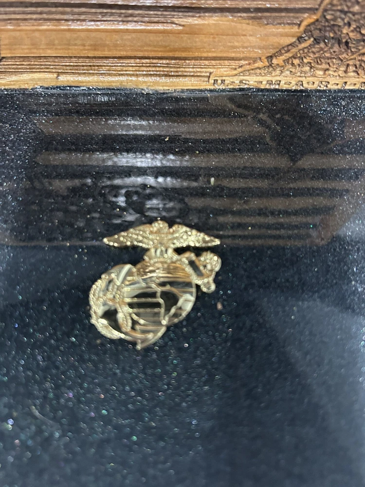 The beautiful plaque is engraved with intricate details, showcasing the Marine Corps emblem and other military symbols. It is a perfect gift for any veteran or active-duty servicemember, as well as a great way to show your support for our troops. This is a unique piece and one of a kind. Add this stunning plaque to your collection today! This piece measures approximately: 5 3/4 inches tall 9 inches wide
