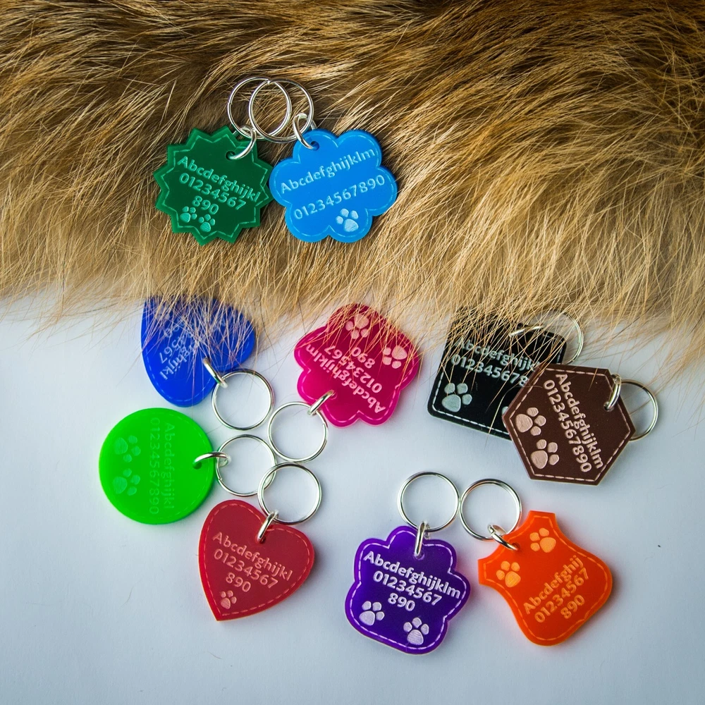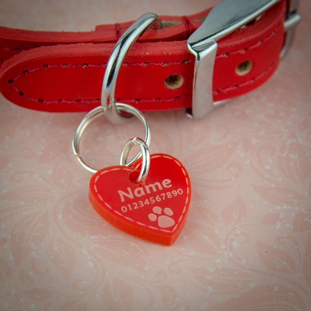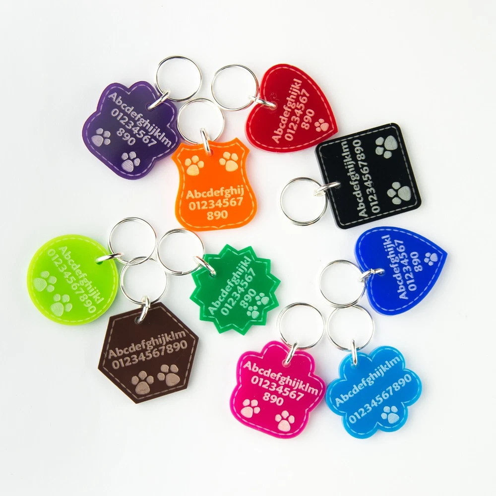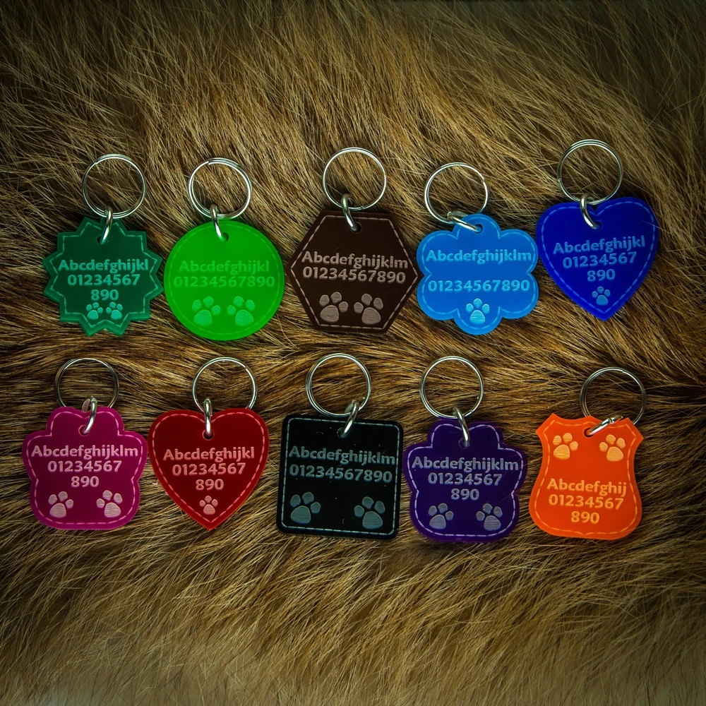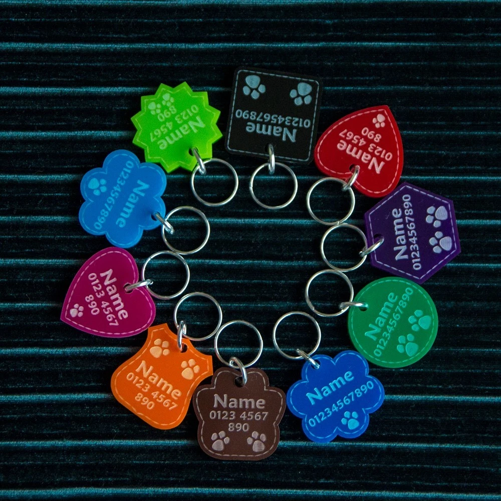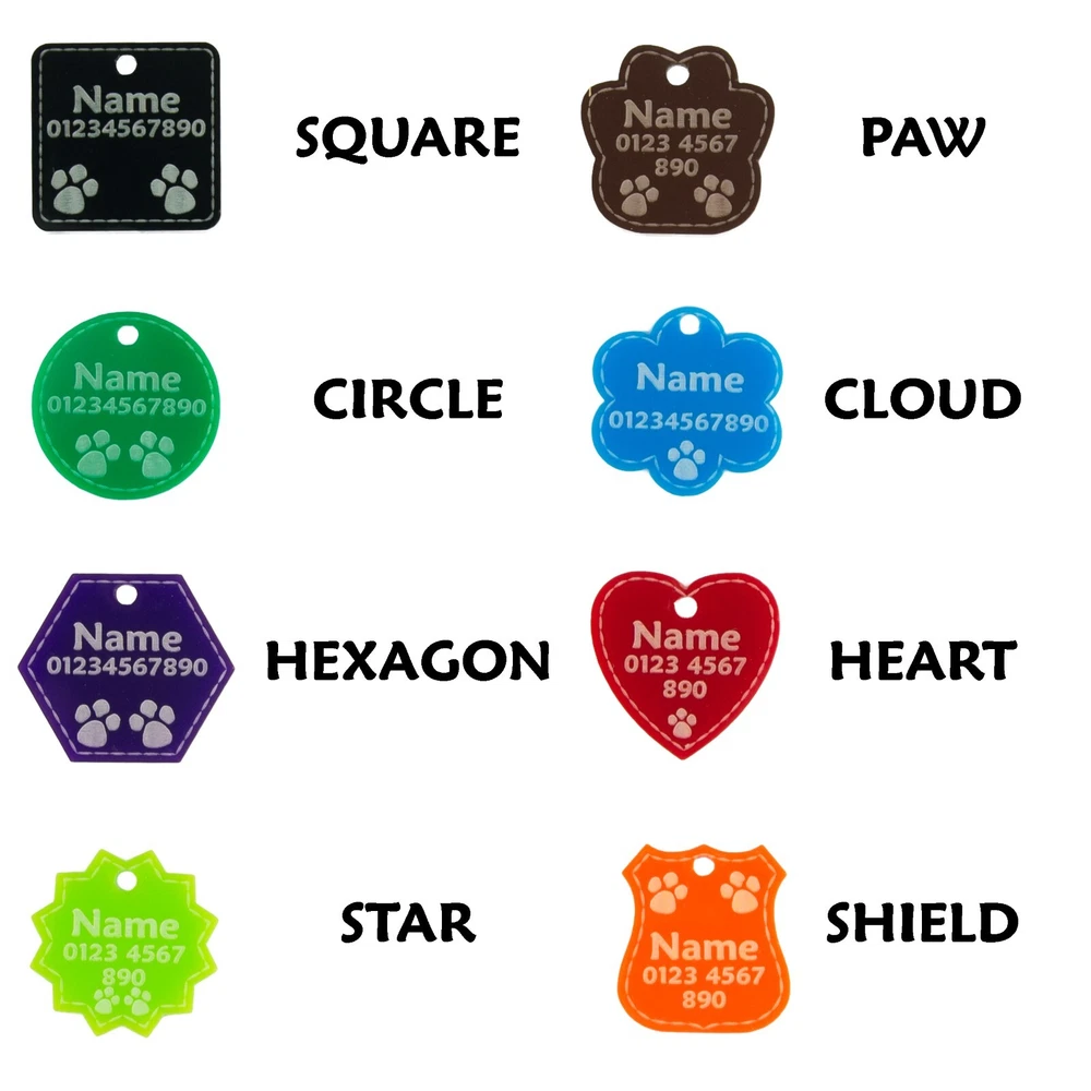 Personalised Acrylic Dog / Cat Collar Tag is a must for pet lovers. This ID tag is the ideal gift for any pet lover that knows their dog or cat needs to look stylish at all times! The essential dog item doesn’t need to look boring; it can be round, heart or shield-shaped. Your pet will look cute with his little tag, and you will feel safe in the knowledge he will be returned to you should he get lost. Don’t forget to update if you move house or change your number! HOW TO PERSONALISE: You can write your pet's name/your name and/or phone number. Also if required additionally we can engrave on another side. Engraving font sizes will vary according to the length of the wording. Please be very careful when sending your details: we will engrave your words exactly as you send them to us. We will copy and paste the information provided. COLOURS: Black Brown Purple Dark Blue Red Dark Green Pink Orange Light Blue Light Green SHAPES: Hexagon Circle Square Cloud Shield Heart Star Paw SIZES: Small - 20mm / 0.79" Medium - 30mm / 1.18" Large - 35mm / 1.38" MATERIAL: Acrylic. Thickness - 3mm 2 keyrings included - 16mm diameter and 10mm in diameter, silver colour. Rings are included but not connected so you will need tools to connect them. For an additional fee, we can attach them. IMPORTANT: It’s a made to order item so as it’s made just for you, you won’t be able to return it (unless it’s faulty). Little burns are normal due to engraving. Thank you for reading! ***** NATIONAL ENGRAVER ***** Legal Disclaimer Tags are tough, but they are not indestructible, we cannot be held responsible for items that become worn due to general use. We cannot guarantee the length of time tag will last your cats or dogs, as this is down to the individual pet's chewing/tearing abilities. Please do not leave unsupervised with your pet. Proper supervision is advised when playing with the collar and the tag to ensure no accidental swallowing. This tag should be regularly inspected to ensure there is no damage. If any damage is seen, then the tag should be discarded.