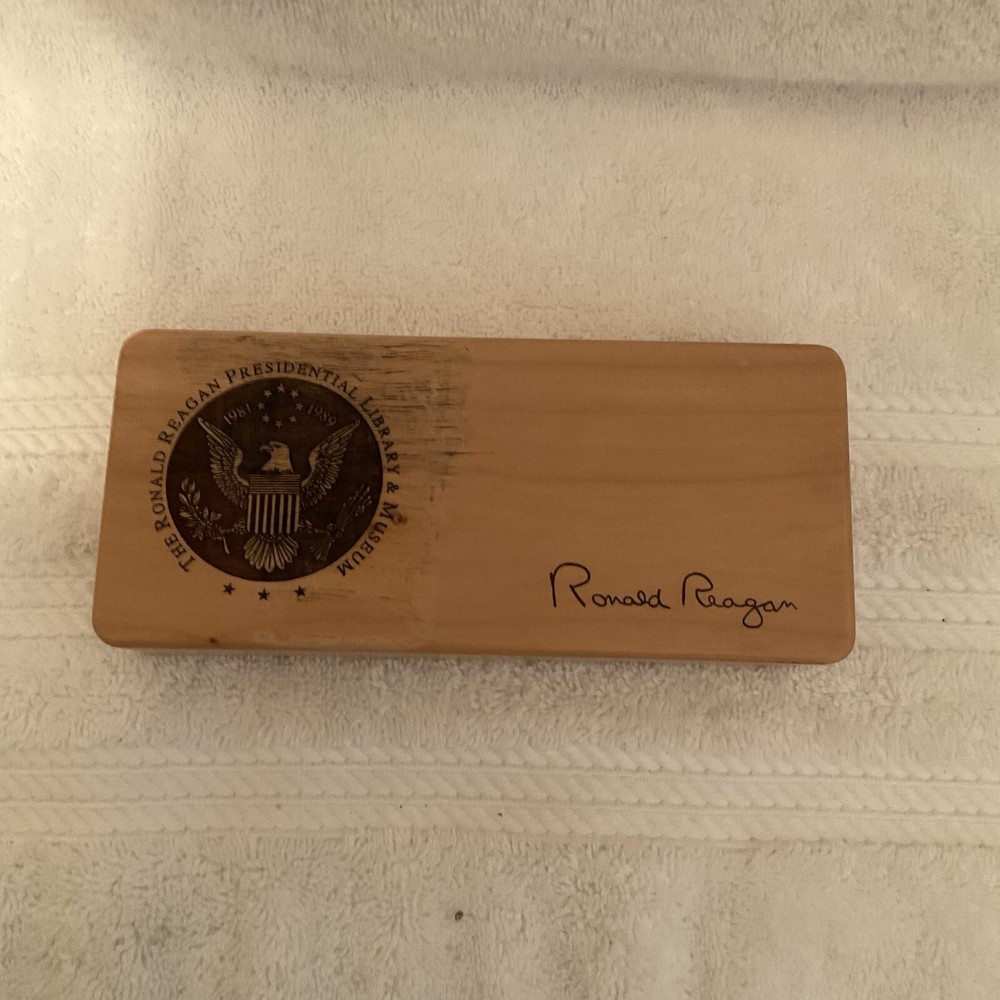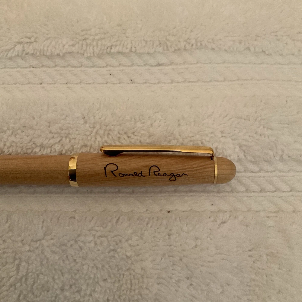 The product is a wooden ballpoint pen and case set engraved with "Ronald Reagan." It is a collectible item related to politics, specifically associated with President Ronald Reagan. The pen is made of wood and is likely a souvenir or memorabilia from the United States.