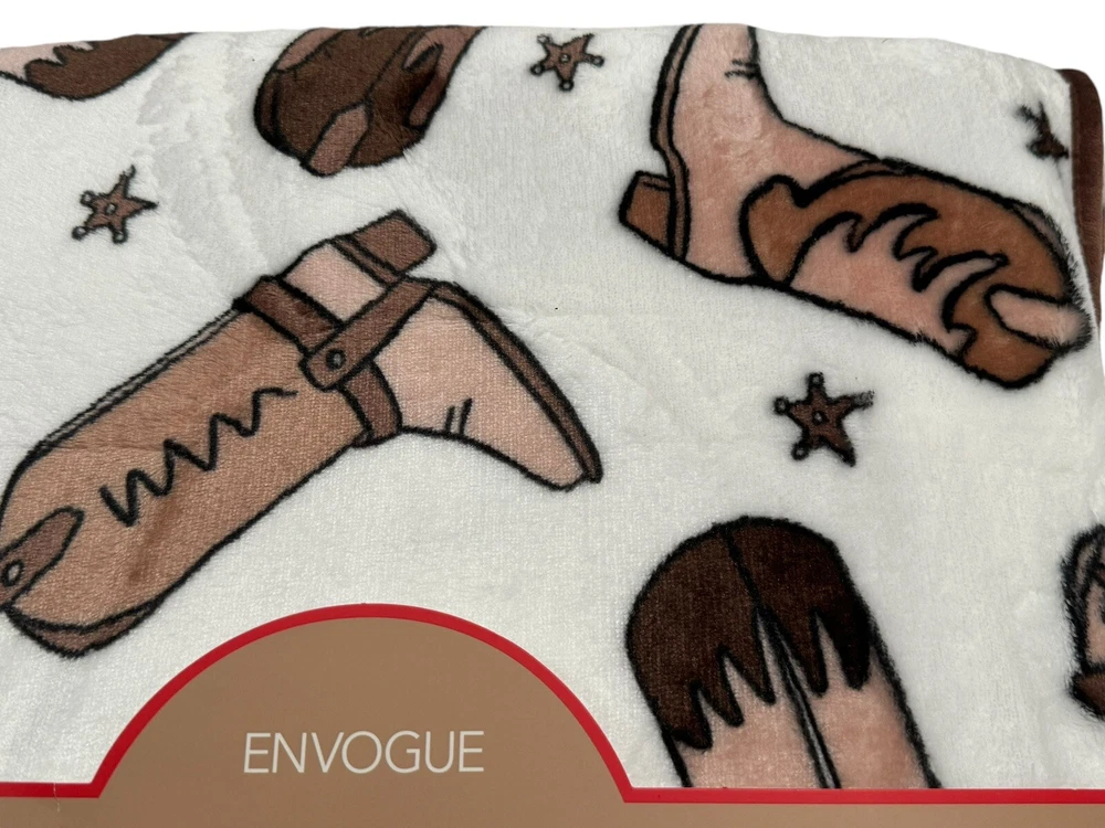 Envogue 60" X 90” TWIN Cowboy Boots THROW Blanket Soft & Cozy Condition: New with tags. Snuggle up with this soft and cozy Envogue throw blanket featuring a solid white color and a charming cowboy/cowgirl boot design. Measuring 60 inches by 90 inches, this twin-sized blanket is perfect for adding a touch of Western style to your bedroom decor. Made from high-quality polyester material, this throw blanket is durable and easy to maintain. Whether you're lounging around the house or adding an extra layer of warmth to your bedding, this throw blanket is a must-have for any cowboy or Western enthusiast.