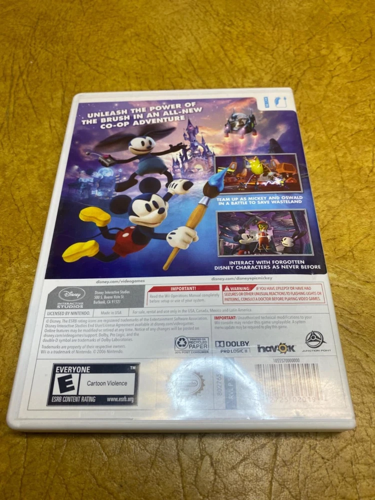 The product is a video game titled "Epic Mickey 2: The Power of Two" designed for the Nintendo Wii platform. It is rated E for Everyone, indicating it is suitable for all ages. The game is published by Disney Software, known for creating family-friendly entertainment. "Epic Mickey 2: The Power of Two" likely follows the adventures of Mickey Mouse in a whimsical and interactive world, offering players the opportunity to engage in a variety of fun and challenging gameplay experiences on the Wii console. Includes: Item and Box only Condition: Normal wear Description: No manual, comes with a protective sleeve.
