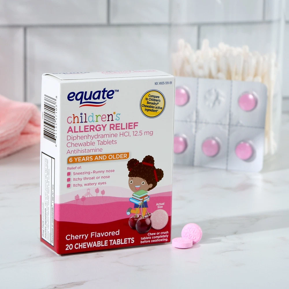 Help your child get rid of sneezing; scratchy throat; and itchy, watery eyes with Equate Children's Cherry Flavored Allergy Relief Chewable Tablets. Whether your little ones suffer from seasonal allergies or are experiencing a mild allergic reaction, our allergy relief chewable tablets alleviate symptoms and help them get back to their day. Our formula contains the active ingredient diphenhydramine HCI, an antihistamine that works to prevent the effects of histamine in the body. The suggested dose is 1-2 chewable tablets for children 6-11 years of age and 2-4 tablets for children ages 12 and older every four to six hours. Do not take these tablets more than six times in 24-hours. When your child starts experiencing allergy symptoms, stop reaching for more boxes of tissues and start reaching for Equate Children's Cherry Flavored Allergy Relief Chewable Tablets. Making the right health decisions can be challenging. With a complete range of products and simple solutions, Equate allows you to take care of your family with confidence. Relieves sneezing, runny nose, itchy throat, and itchy, watery eyes For children 6 years and older Diphenhydramine HCI, 12.5mg: antihistamine 20 chewable tablets Delicious cherry flavor Tamper-evident packaging Compare to Children's Benadryl Chewables active ingredient