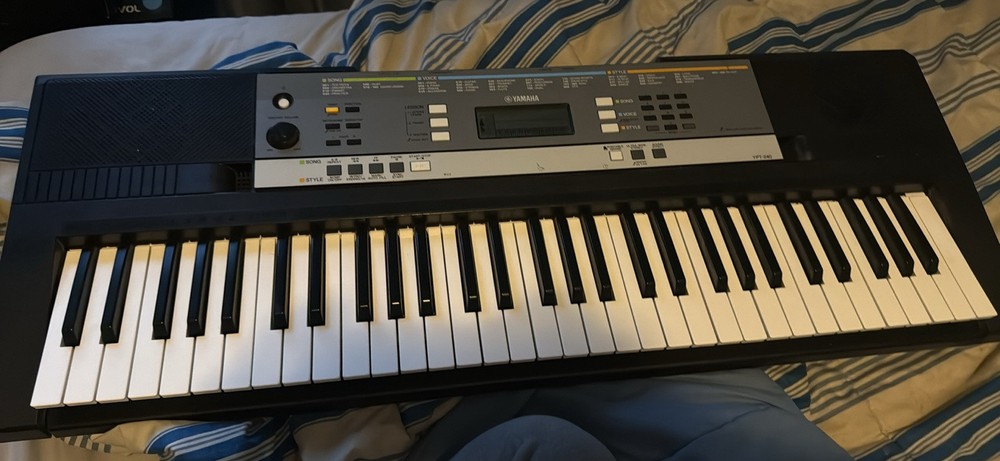 This is a Yamaha electronic keyboard with 61 keys. It is made in China and includes built-in effects. It is designed for creating music and is suitable for various musical activities.