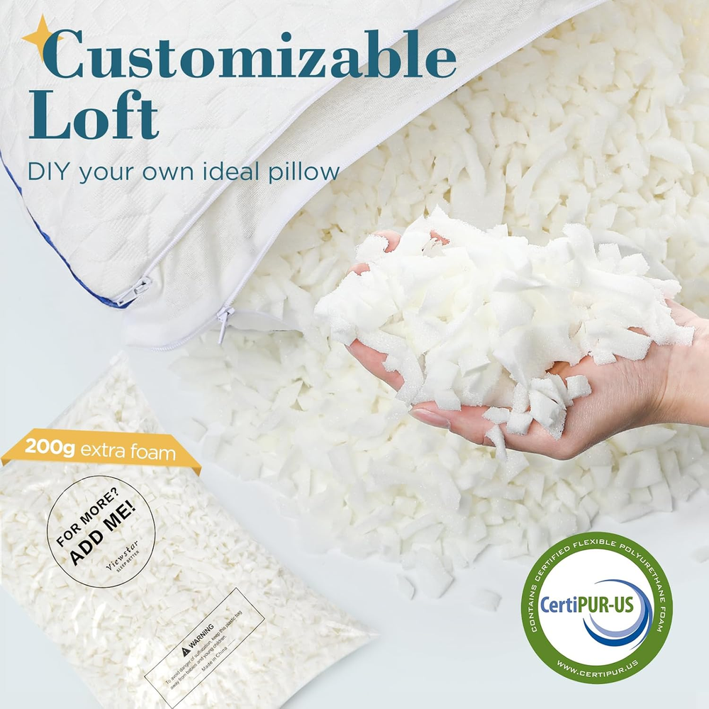PRODUCTS DESCRIPTION AZ/55 Adjustable Loft and Firmness: Finicky sleepers will also like Viewstar adjustable pillows. Just unzip the casing, then add or remove fill to your liking. Great Neck and Shoulder Support: Viewstar memory foam pillows are designed with an ergonomic focus. The pliable memory foam perfectly conforms to your head and neck, ensuring optimal alignment of the head, neck, and spine. Long-Lasting Comfort: The pliable and elastic memory foam filling keeps the pillow plump all night long and never flattens. Say goodbye to constant adjustmentsand and enjoy uninterrupted for better sleep. Trustworthy High-quality Materials:The ultra-soft and breathable cover, combined with shredded memory foam and a ventilated filler, keeps the bed pillows cool and refreshed. It is CertiPUR-US certified, ensuring safe, chemical-free materials for your comfort. Hassle-free Use: Hotel Pillows come vacuum-sealed for shipping and bloom like new when opened. Please air out for 24 hours or wash the outer cover to dissipate odors. The outer cover can go right into your washing machine and dryer. Product Description Viewstar Bedding Collections The video showcases the product in use. The video guides you through product setup. The video compares multiple products. The video shows the product being unpacked. Due to an increase in the demand for sleeping quality, we break the stereotypes of traditional pillows and create the personalized pillows for customers, which makes users have an excellent sleep. Melt into Comfort Supportive and puffy, viewstar memory foam pillows will gently embrace your head and neck, indulge yourself with this soft but firm feeling which as if lying in mother's arms. Perfect sleep from Adjustable for Customized Support and Loft To have a good night's sleep, the loft — the height of the pillow — is crucial . Viewstar Memory Foam Pillows with adjustable design puts you in control. They are firm enough to support your head and neck, yet soft enough for comfort . Personalized support helps you release stress and get a deep rest. Side sleepers, rejoice! Side sleepers need a higher, firmer pillow that supports the head and eases pressure on the shoulders. Shredded Memory foam pillows fit the bill completely. You can add or remove the shredded-foam filling based on the need of sleeping to get your ideal loft and firmness. How to adjust the pillows? Unzip the outer and inner covers Add or remove appropriate amount of memory foam filling according to your needs Try the adjusted pillow to seeif it fits your head and neck Multiple attempts to get the best fit pillow The video showcases the product in use. The video guides you through product setup. The video compares multiple products. The video shows the product being unpacked. Quality meets comfort Cloud-like Filling Shredded memory foam filling is dynamic and unique, bringing support to delight every slumber. Quality meets comfort Gorgeous Feeling Simultaneously breathing and elegance. Quality meets comfort Long-lasting Plump The air-permeable design keeps it plump like a marshmallow and not easy to clump or go flat. Quality meets comfort We Care About Details Upgraded! The both of zippers has become more smoother. 1 Premium Filling 2 Skin-friendly Cover 3 Fluffy Design 4 Smooth Zipper Considerate for You Meet the Needs of All Sleeping Positions No matter what sleepers you are ( Back, Side or Stomach ), memory foam pillows can cradle your head and neck to provide optimal comfort, because of "Adjustable". Designed with Your Needs in Mind Each pillow comes with an extra 200g of filling so you can DIY your own perfect pillow. Renew in a Breeze Simply toss the removable cover in the washer and dry for easy care. Please note that the inner core is not washable.