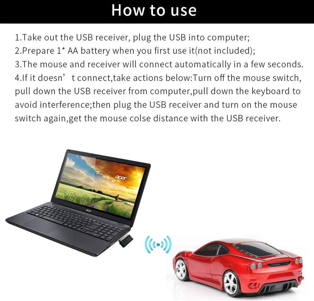 Store New Arrivals Add to Favorite View Feedback Contact Sleep Sport Car Shaped Wireless Computer Mouse Ergonomic Gaming Optical Mouse Description Style Modern Are Batteries Included No Power Source Battery Powered Compatible Devices Notebook, Personal Computer Theme car-themed Movement Detection Technology Optical Mouse Maximum Sensitivity 1.6E+3 Dots per Inch Button Quantity 3 Brand Name Jinfili Brand Jinfili Material Plastic Number of Batteries 1 AA batteries required. Finish Type Glossy Hand Orientation Ambidextrous Manufacturer Jinfili Hardware Platform PC, Linux, Mac Battery Average Life 2 months Connectivity Technology 2.4G Movement Detection Optical Operating System Windows XP, Windows 8, Windows 7, Mac, Windows 10 Special Features Wireless Special Feature Wireless Item Dimensions L x W 4.5"L x 2.9"W Item Weight 0.18 Pounds Color FLL_Red Range 10.0 meters Are Batteries Required Yes Recommended Uses For Product Laptop Included Components USB Receiver Wireless car mouse fashion sport car shaped design with headlights,Super cool gaming mouse for laptop computer,good choice for using or as gifts for kids,girls,women and men Auto sleep mode:Plug and Play, no any drive is needed;Energy-saving,if mouse is not used for short time, it will turn to power saving mode to save energy Powered by 1 AA battery (the battery isn't included). Mini receiver, 2.4GHz optical wireless transmission, operation distance is up to 10 meters. Support most operating system,Windows 98 / ME / NT / 2000 / XP / Vista / Win 7 / Linux or Mac OS and more Product Description Cool sport car shaped wireless mouse for laptop computer notebook,eyecatching ergonomic design,good choice as gifts for kids,teens,students, teachers,girls,women and men. Don't worry if you encounter the mouse doesn't work when you use it for the first time Frist,pull the receiver out and plug it in Second,turn off and on the power If the mouse still not work,please send message to us,we will solve it for you Note:The USB Receiver is in the bottom of mouse(See the description) Feature: Plug and Play,No any drive High-performance chip, stable performance 5 million key times, life ahead of other products 33ft launch distance, 2.4 GHz wireless transmission Car exterior design, the trend of appearance, high-end configuration Light weight enough to take it everywhere, a good choice for home use and on the go Compatible with Windows 2000, Windows XP, Windows 7, Windows 10,Windows Vista, Windows 98, Mac OS, Windows ME, Windows 8 Specifications: Interface: USB 2.0/3.0 Tracking Method:Optical Rated working Voltage:3.0V Optical Resolution: 1600DPI Rated working Current: 25mA Switch Life:5 Million cycles Button: 2 Buttons + 1 Scroll Wheel Battery:1xAA Battery(Not included) Wireless Operate Distance:Up to 33 feet Wireless Transmission Frequency: 2.4 G Package Included: 1 x Wireless mouse 1 x USB receiver (placed in the bottom of the mouse) 1 x Using instruction How to use 1.The USB receiver is placed in the bottom of the mouse; Take out the USB receiver, then plug the USB into computer; Prepare 1* AA battery when you first use it(not included); The mouse and receiver will connect automatically in a few seconds. 2.If it can not go to paring mode,the mouse need to pair with the USB again: Turn off the Switch,pull down the USB receiver from computer, then plug in the USB and turn on the mouse switch again, get the mouse colse distance with the USB receiver. If not still work,Please try to put the usb receiver to other USB port of pc ABOUT US We offer the best prices around on high quality products. Our E-store includes media such as books, movies, music and games while offering electronics, toys, sporting apparel, clothing, tools, general home, garden items and more. SHIPPING We are always working hard to ensure your package arrives as soon as possible. Please understand that some factors like weather, high postal traffic, and the performance of shipping companies are outside of our control. We offer free shipping to the lower 48 states and ship within 2 business days of payment, usually sooner. We do not accept P.O. Boxes. Please provide a physical address. RETURNS We offer a 30-Day Return Policy on items which you are not completely satisfied with. You have the option for a full-refund or an exchange of the item. No returns are available on items shipped outside of the USA. PAYMENT We accept PayPal. CONTACT US This page content is yet to come Please ad us to your favorite seller and visit again later Thank You CUSTOMER SATISFACTION We try our very best to make sure every customer is completely satisfied. If there's a problem, message us! We're happy to help.