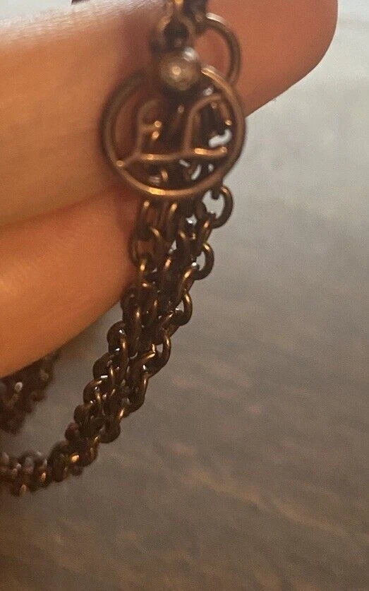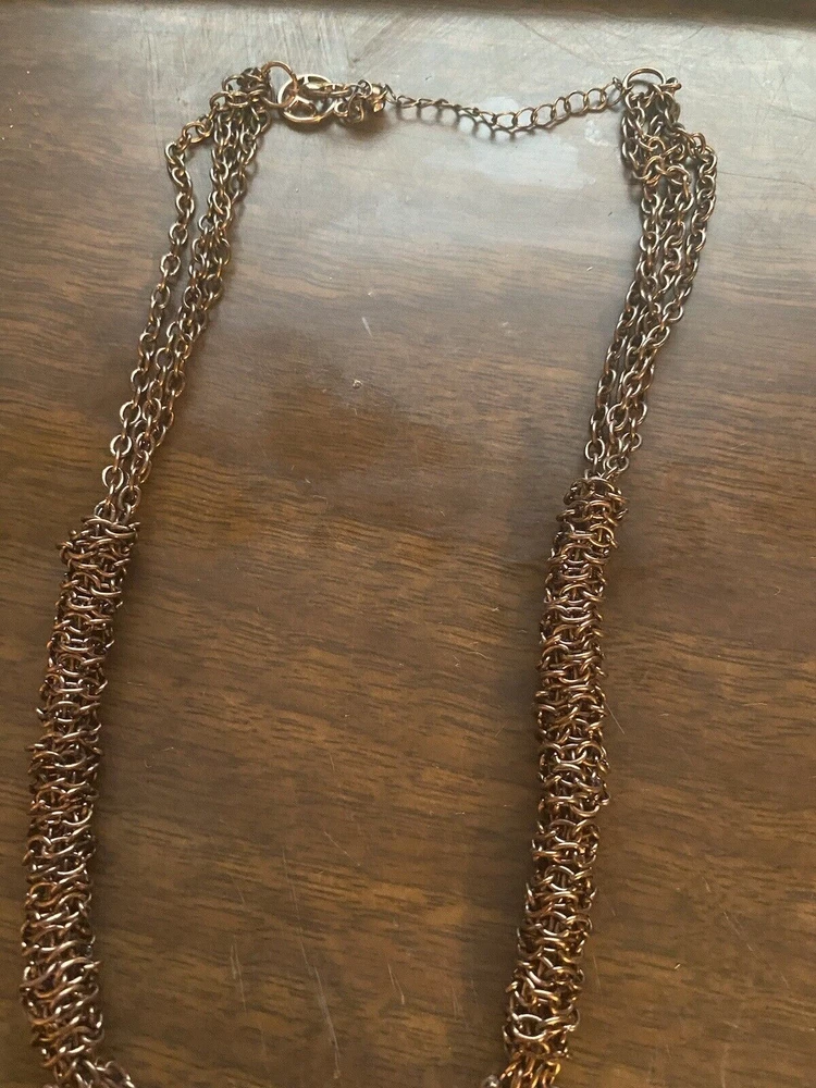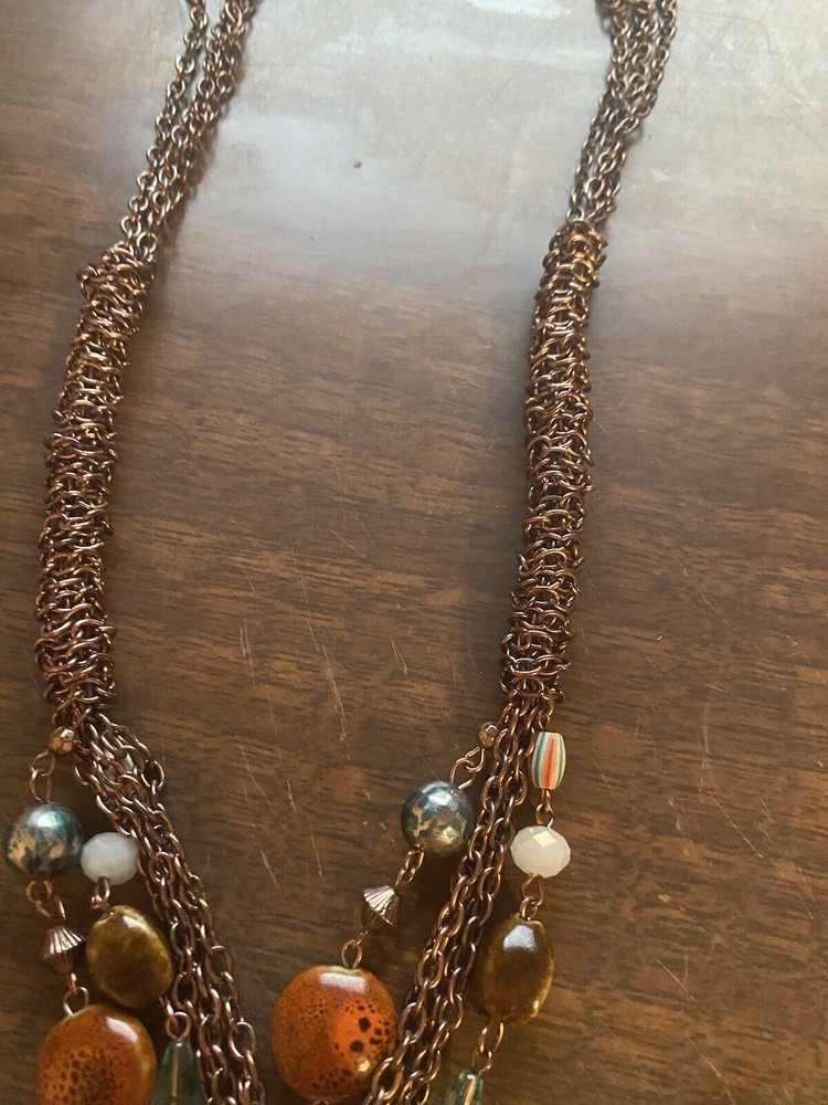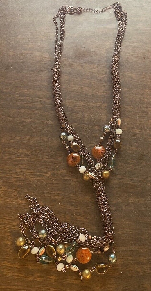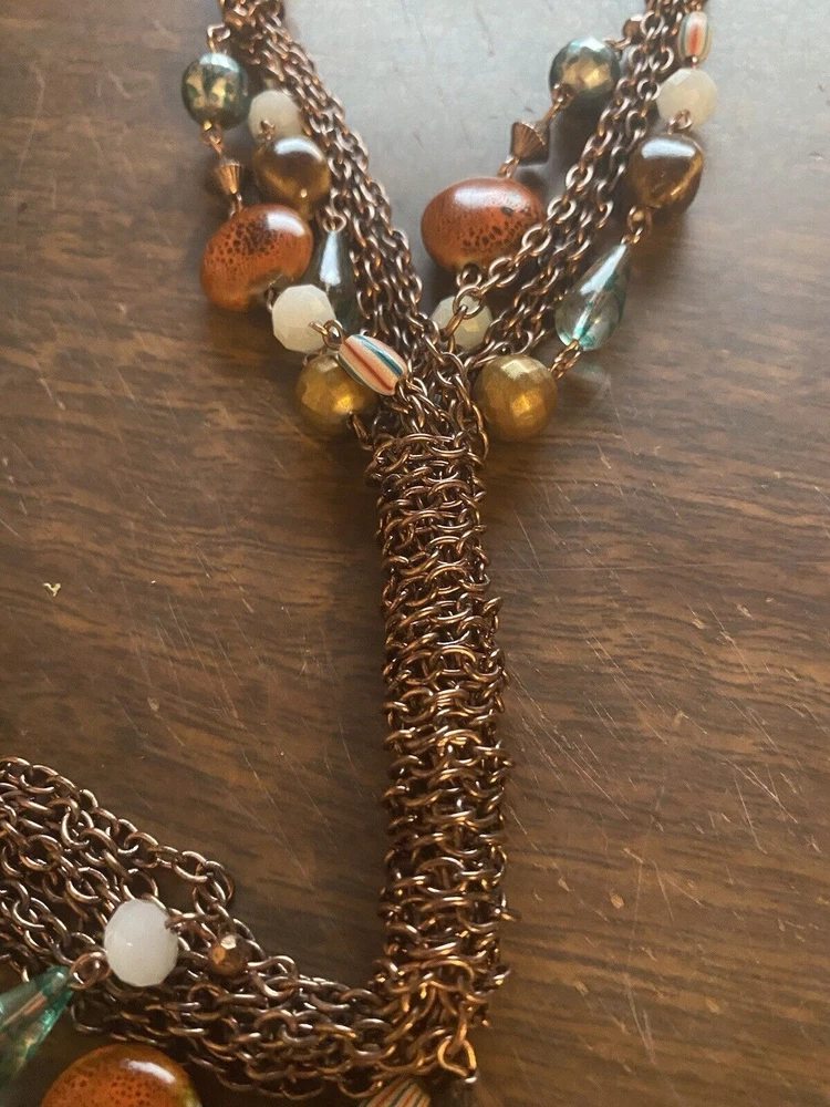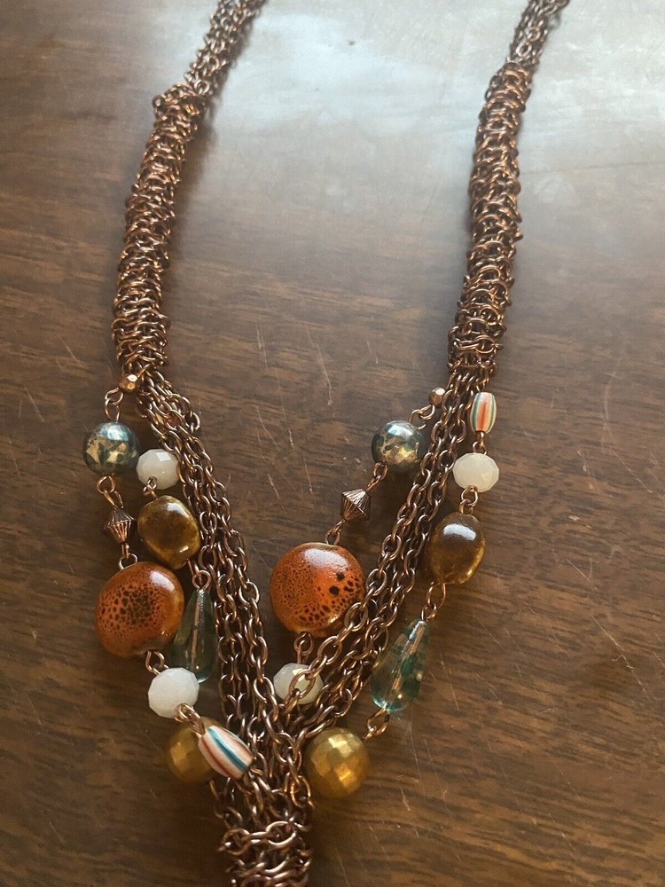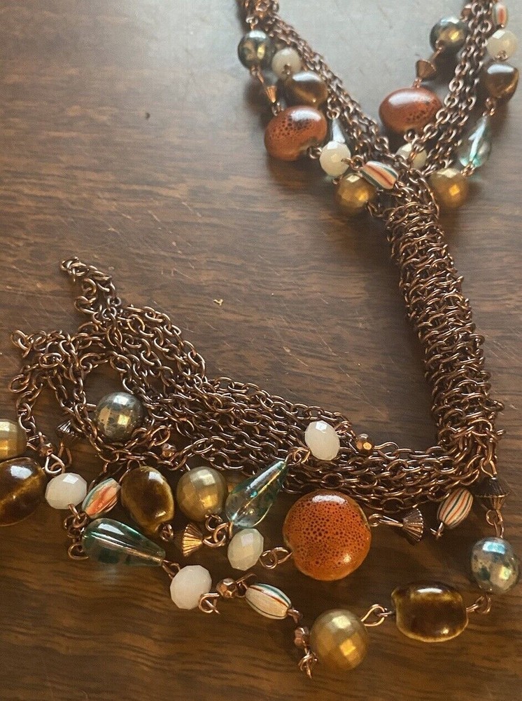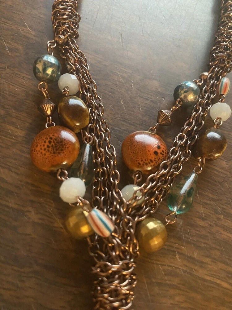 EL Erica Lyons Multi-Strand Collar Necklace Pendant Faceted Smooth Marbled Beads Copper metallic metal chain with multi colored synthetic stones Listing and template services provided by inkFrog