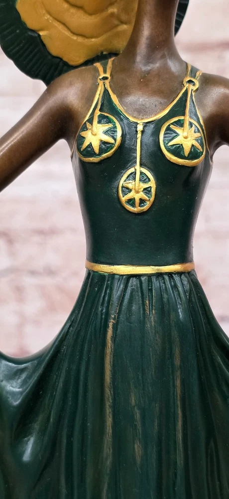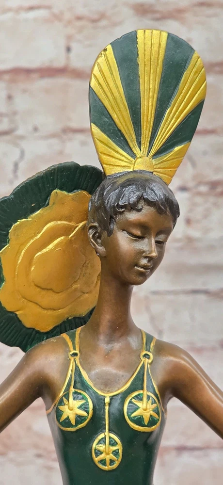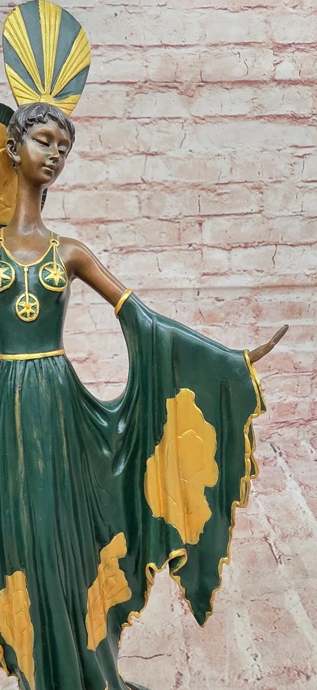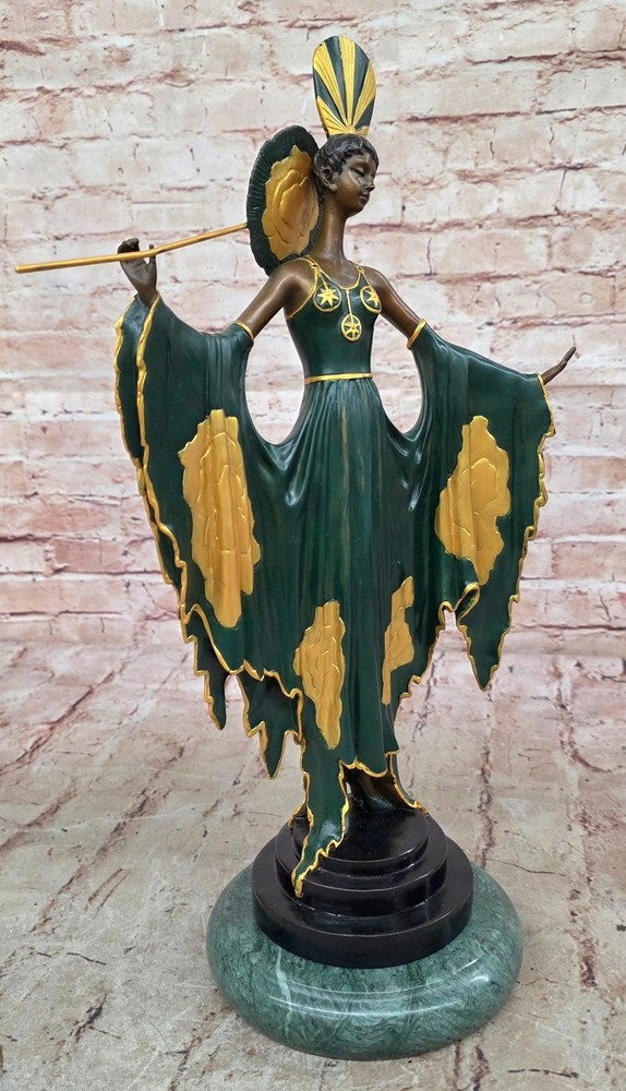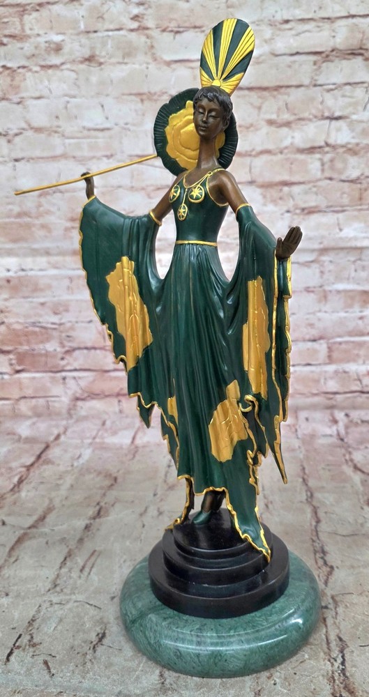 A Tribute To Erte Art Nouveau Fashion Model Bronze Sculpture Home Decor Gift A Tribute To Erte Art Nouveau Fashion Model Bronze Sculpture Home Decor Gift Condition : This sculpture is in perfect condition. Bronze Dimensions with Marble Base: Height 18" X Width 10" Marble Dimensions: Diameter 6" Height without base:17" Weight:14 LBS Inventory:67SA63913076 This elegant bronze sculpture captures a timeless moment of fashion and poise. A stunning woman stands confidently at the end of the runway, arms gracefully extended as camera flashes illuminate her form. Her long golden-green patina dress flows with vintage charm, cinched at the waist to accentuate her silhouette. The high collar evokes the glamour of old Hollywood, while a flowing black shawl drapes delicately over her arms, its rich patina giving the illusion of subtle movement. With her eyes gently closed, she embraces the attention and energy of the spotlight. Her pose exudes confidence and elegance, embodying the allure of haute couture and stage presence. Every detail — from the contours of the dress to the serene expression on her face — has been meticulously sculpted to convey sophistication and grace. Handmade and cast in 100% bronze using the traditional "Lost Wax Method", this collectible piece rests atop a luxurious green marble base. The sculpture is signed by the legendary Art Deco artist Julius Erté, known for his glamorous and theatrical designs. A striking tribute to fashion, performance, and feminine strength, this piece makes a show-stopping addition to any art or fashion collection. Shipping Terms : Most of our items are shipped via USPS (United States Postal Service) mail or UPS. Most orders are shipped within 24-48 hours of purchase. Please be aware that not all items are available for USPS shipping due to size and weight. We do ship to Hawaii, Alaska, Canada, Puerto Rico, APO/AE, and U.S. Virgin Islands, however, an additional charge may be required. Please contact us before making any purchases in these areas. For Non-USA customers, you may be responsible for all duty, tax, brokerage fees that may be due upon delivery (shipping costs cover freight charges only). We also ship internationally. Please refer to the "Shipping and Handling" chart for the rates for each area. Payment : We accept just about any form of payment. PayPal, Master Card, Visa or American Express credit cards. Money orders, cashiers checks, and even personal or business checks. For governmental institutions, we will also accept a purchase order. Please understand that for personal or business checks we have to wait for the check to clear (usually 7 days) before shipping. Condition : New Detailed Hand Crafted Hot Cast Bronze Satisfaction Guaranteed. This is Stock Photo, Slight Color Variation!! Listing and template services provided by inkFrog