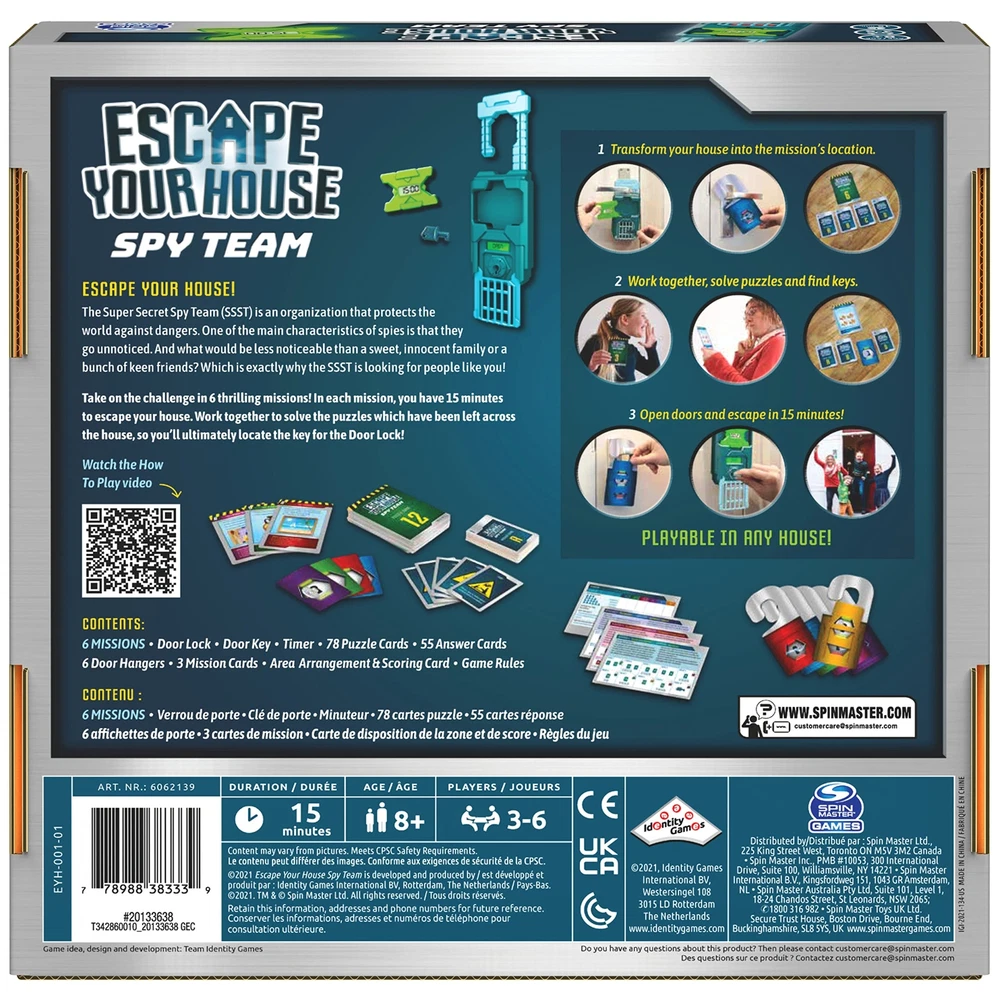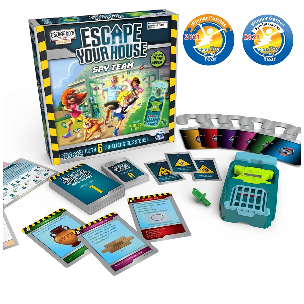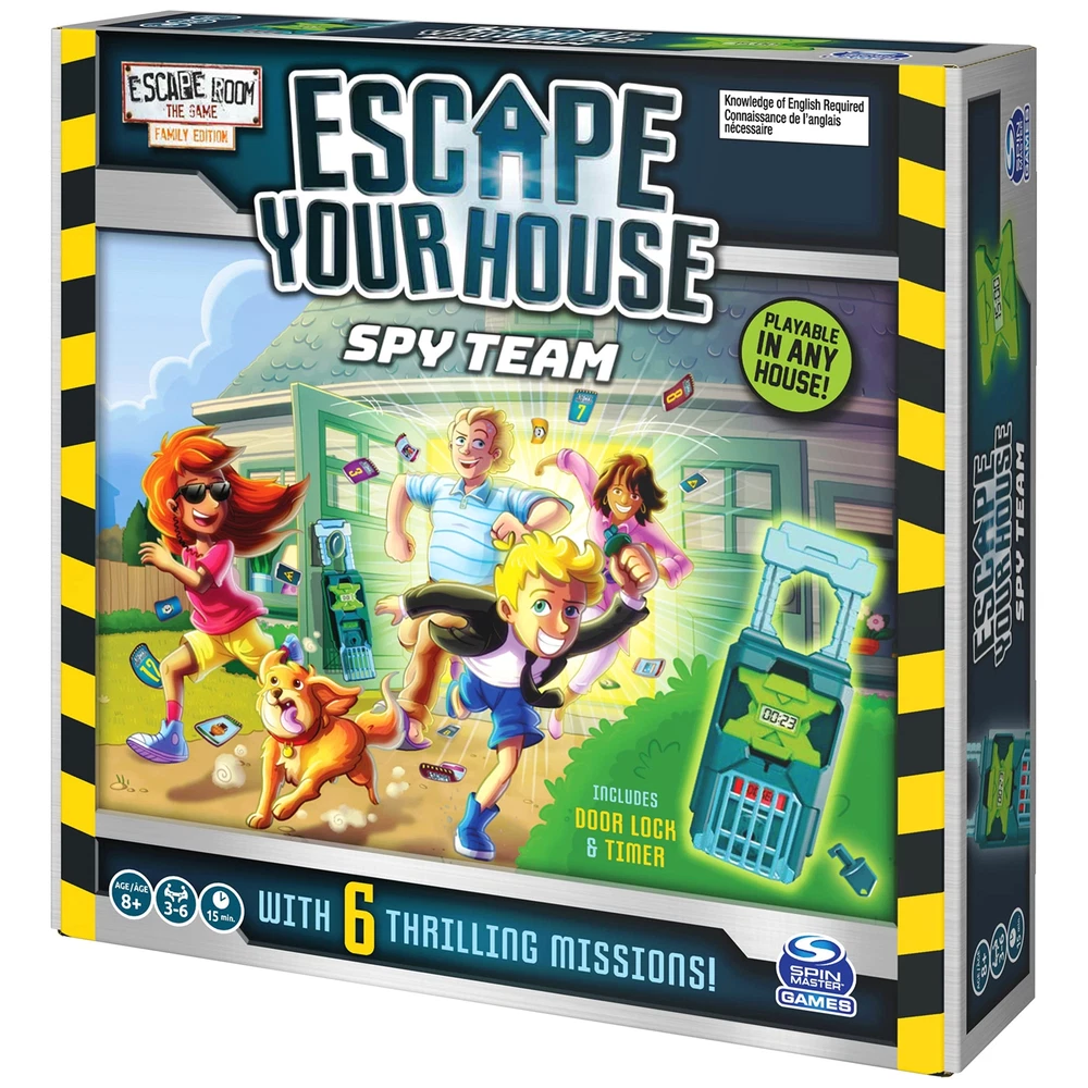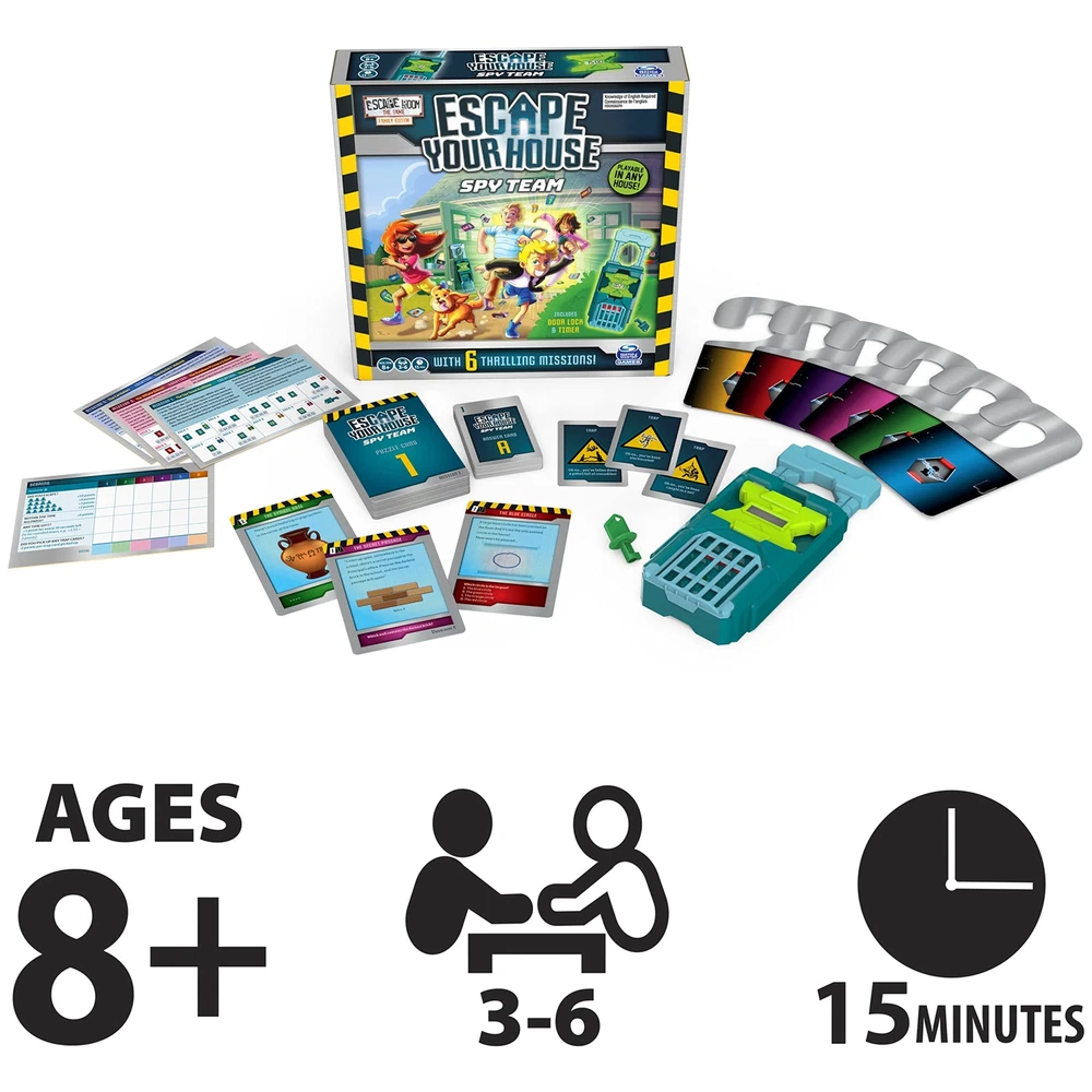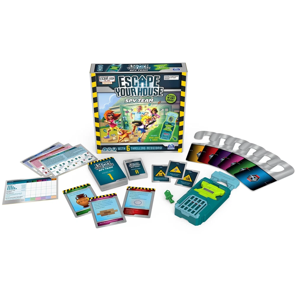 The Super Secret Spy Team (SSST) is an organization that protects the world against dangers. of the main characteristics of spies is that they go unnoticed. And what would be less noticeable than a sweet, innocent family or a bunch of keen friends? Which is exactly why the SSST is looking for people like you! Take on the challenge in 6 thrilling missions. In each mission, you have 15 minutes to escape your house. Work together to solve the puzzles which have been left across the house, so you'll ultimately locate the key for the door lock. This game includes an easy-to-use door lock & timer, which counts down from 15 minutes right when you hit start. Simply place the door lock onto your front door or the door handle of any room you’re in, and it will lock into place. In an , you can use the door key if you are not able to solve the mystery in time. Use the area arrangement card, so you know exactly how to turn your home into a top-secret mission. With all these supplies on hand and a variety of mission options and puzzle cards, you will have everything you need for a family game night full of adventures. Get ready for a wild ride of solving puzzles, finishing missions, and of course… escaping your house! SOLVE THE PUZZLE: Work together, solve riddles, and find keys. Turn your home into an Escape Room with the help of your family or friends! This game is perfect for family game night or as a gift for . 15 MINUTES TO ESCAPE: Test not only your mind, but also your speed… because you only have a limited time. Finish strategy game and wanting more? Simply move on to another mission. 6 THRILLING MISSIONS: The Super Secret Spy Team is always needed for the world’s most high-profile missions. Choose from of six missions to uncover the mystery and unlock the door. PLAYABLE IN ANY HOUSE: Play 'Escape the Room’ from the comfort of your home! It is easy to transform your house into the mission's location with the included supplies, such as the door lock and timer. FOR , TEENS, & ADULTS: This game is suitable for ages 8 and up, and it is unlike any board game you own. Play with 3-6 people, and don’t forget to put your minds together to solve the mystery! Includes: 6 Missions, Door Lock, Door Key, Timer, 78 Puzzle Cards, 55 Answer Cards, 6 Door Hangers, 3 Mission Cards, Area Arrangement & Scoring Card, Game Rules Covered by the Spin Master Care Commitment. See below for full details