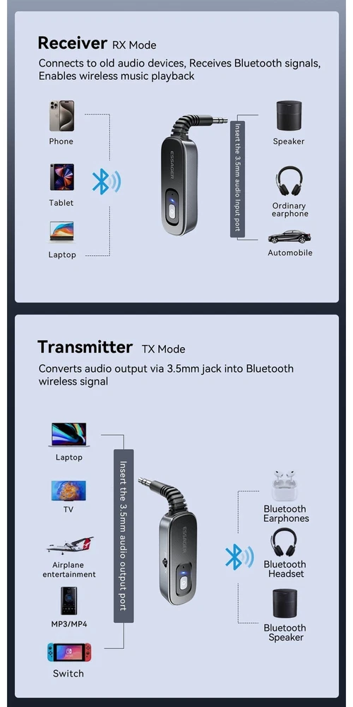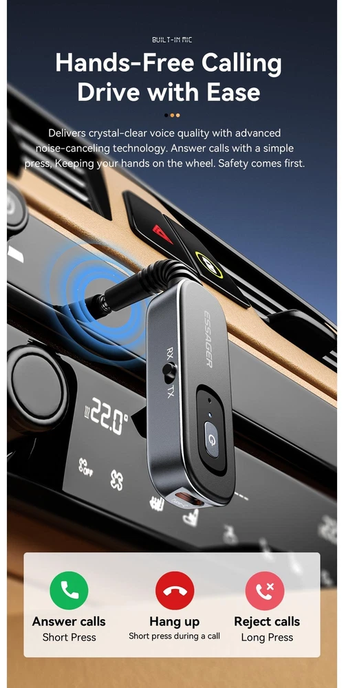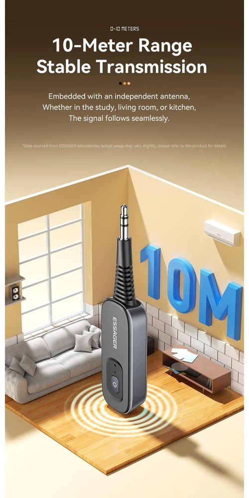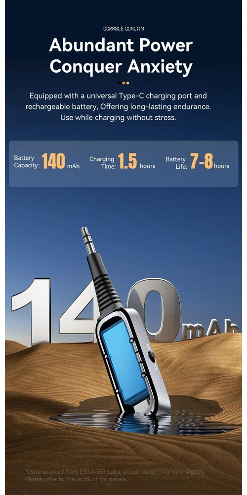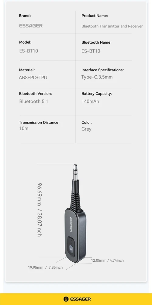 FREE SHIPPING 30 DAYS RETURN EASY PAYMENT Essager Bluetooth 5.1 Audio Receiver/transmitter- 3.5mm Aux,mic,wireless Adapter 【Product parameters】 Brand: ESSAGER Material: ABS+PC+TPU Interface specifications: Type-C,3.5mm Function: Bluetooth 5.1 Battery capacity: 140mAh Transmission distance: 10 meters Color: Black 【Product Features】 1. Bluetooth 5.1, receiving and transmitting two-in-one, support a variety of protocols, miniature and compact, long battery life 2. Receive (RX)/transmit (TX) signal two-in-one, free switching, multi-scene application 3. Bend-resistant plug, applicable to multiple environments Thank you for shopping