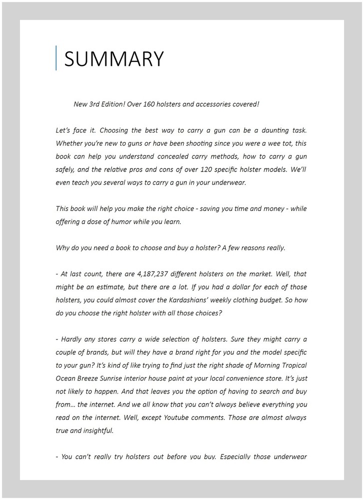 Practical Guide to Gun Holsters for Concealed Carry, Paperback by McHale, Tom, ISBN 1976433525, ISBN-13 9781976433528, Like New Used, Free shipping in the US New 3rd Edition! Over 160 holsters and accessories covered! Let’s face it. Choosing the best way to carry a gun can be a daunting task. Whether you’re new to guns or have been shooting since you were a wee tot, this book can help you understand concealed carry methods, how to carry a gun safely, and the relative pros and cons of over 120 specific holster models. We’ll even teach you several ways to carry a gun in your underwear. This book will help you make the right choice - saving you time and money - while offering a dose of humor while you learn. Why do you need a book to choose and buy a holster? A few reasons really. - At last count, there are 4,187,237 different holsters on the market. Well, that might be an estimate, but there are a lot. If you had a dollar for each of those holsters, you could almost cover the Kardashians’ weekly clothing budget. So how do you choose the right holster with all those choices? - Hardly any stores carry a wide selection of holsters. Sure they might carry a couple of brands, but will they have a brand right for you and the model specific to your gun? It’s kind of like trying to find just the right shade of Morning Tropical Ocean Breeze Sunrise interior house paint at your local convenience store. It’s just not likely to happen. And that leaves you the option of having to search and buy from… the internet. And we all know that you can’t always believe everything you read on the internet. Well, except Youtube comments. Those are almost always true and insightful. - You can’t really try holsters out before you buy. Especially those underwear holsters. Gun store sales staff tend to get a little cranky when you start shedding clothes next to the ammunition aisle. - There are many different styles of concealed carry. Every day, innovative gun folks are inventing new ways to safely and discreetly carry guns. The variety of options is great, but how do you know which style of carry is right for you? The editors at have painstakingly documented all the holsters we’ve tried over the years and provided helpful commentary about pros and cons of different holster styles. In other words, we’ve tried just about everything. We’ve had great successes. We’ve experienced colossal failures. We’ve listened to so many gun show huckster sales pitches that the late Billy Mays would be impressed. And the result? The Practical Guide to Gun Holsters for Concealed Carry. Topics Include: - A brief and entertaining history of holsters. - Weighing concealment versus accessibility - Open or concealed carry? How to start an enthusiastic argument. - Ladies only holster solutions. - Belt carry holsters - inside, outside and underneath? - Body carry solutions. Undershirts, belly bands, and harnesses. - Ankle holsters. You think your ankles were swollen before? - Pocket holsters. Why some work and others don't. - You too can carry a gun in your underwear! - Stashing guns in your clothing. Pants, shirts, and jackets. - Off premises parking. Ways to carry a gun not attached to your body. - Home, office and car holster options. - Magazine carriers and pouches. Ways to easily carry spare ammunition. Loaded with pictures and the occasional comedic illustration, this book will tell you just about everything you need to know regarding styles of carry and the pros and cons of dozens and dozens of holsters from numerous manufacturers. Holsters are expensive. And important! This book will help you make the right choice for your needs and lifestyle without breaking the bank. Enjoy!