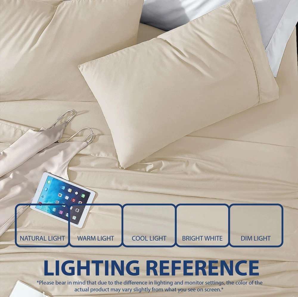 COLOR DIFFERENCE: We work hard to ensure the colors you see online are close to the colors you receive. Please also bear in mind that sometimes due to different lighting and computer monitor settings, the colors of the products viewed in person may vary slightly from what you see on screen. WHAT IS IN THE PACKAGE: King set includes: 1 Fitted Sheet 78" x 80", 1 Flat Sheet 102" x 105", 2 Pillowcases 20" x 40". WHY WE LOVE THESE SHEETS: 100% microfiber polyester, double brushed to finish for amazing softness. The -resistant and incredibly durable design will pamper you all night and leave you feeling rested. HOME ESSENTIALS: Our fitted sheets are fully elasticized with extra strength elastic and can easily accommodate mattresses up to 16” thickness for a snug fit. EASY CARE: Machine wash on gentle cycle with cold water and like colors. Then tumble dry on low or air dry for best results OEKO-TEX STANDARD 100 Certified – an industry standard that proves that the product has been tested to be free of harmful substances & chemicals