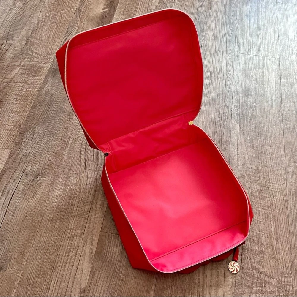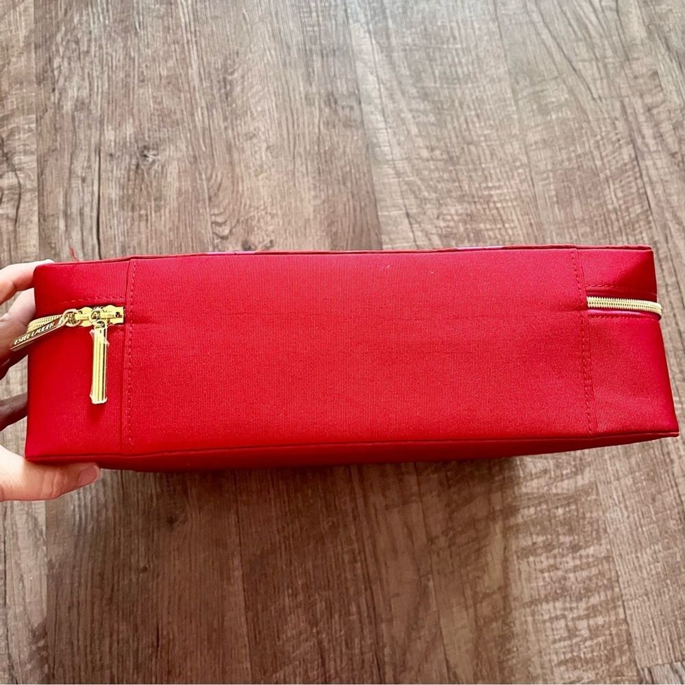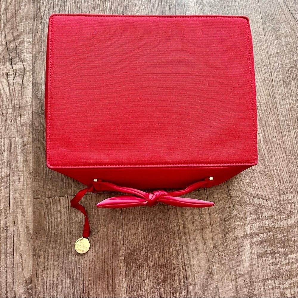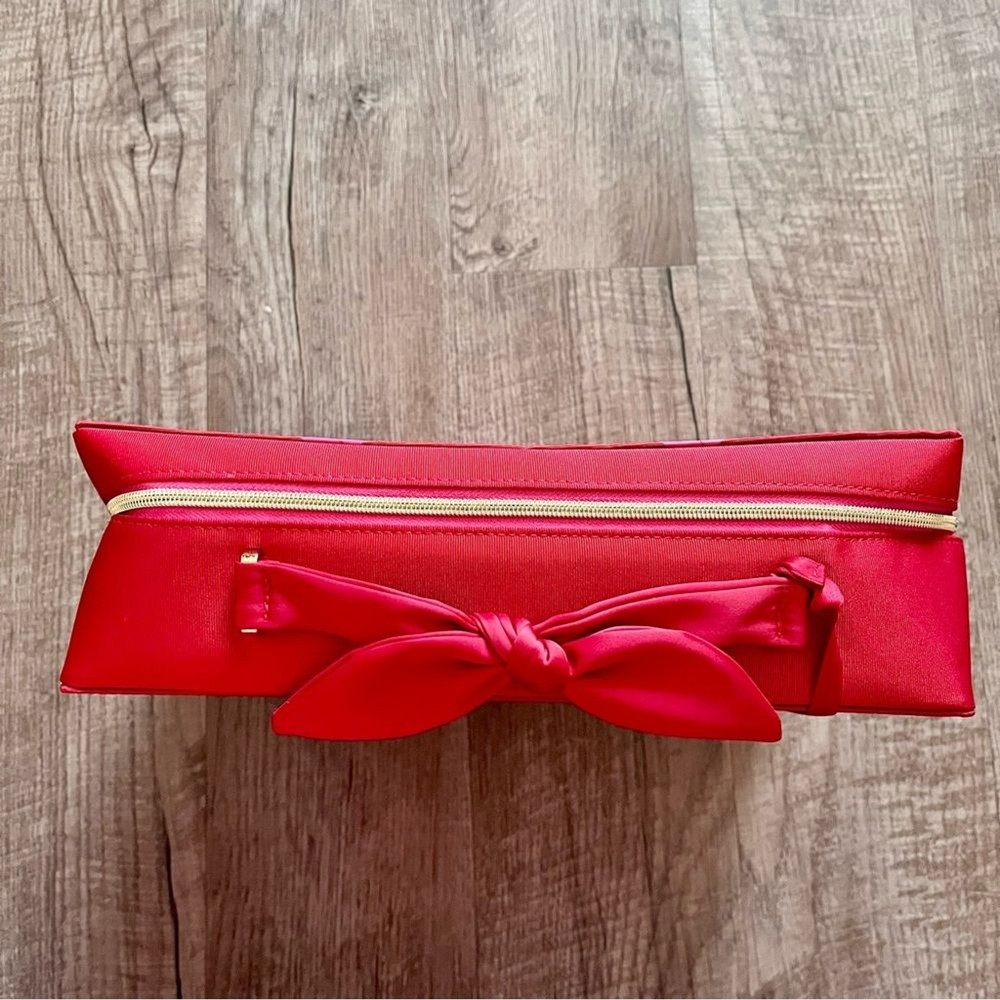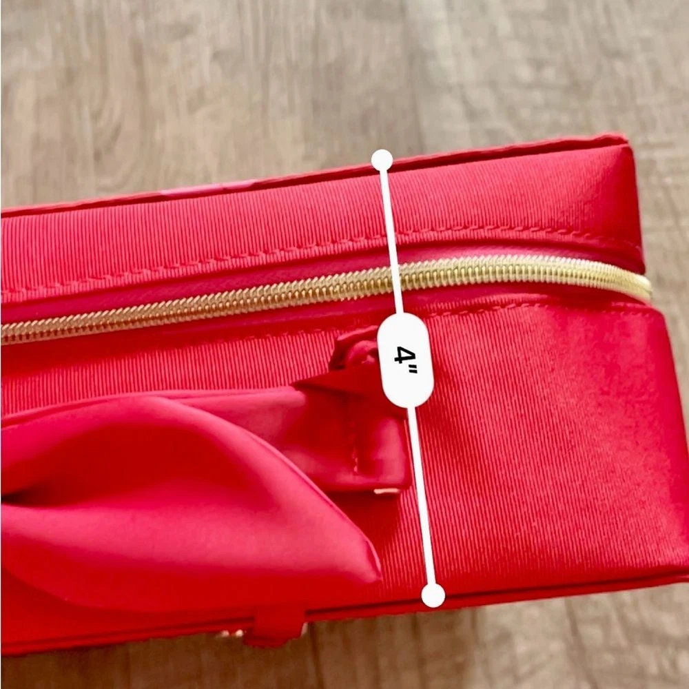 This vibrant red cosmetic bag features a quilted diamond pattern that adds a touch of elegance and texture. Made from a smooth material, it has a sleek rectangular shape with rounded corners and a matching red zipper with a decorative tassel pull. Perfect for organizing your beauty essentials in style. Used once, Gently pre loved, excellent condition. All items ship the next business day! I love offers & give generous discounts on bundles