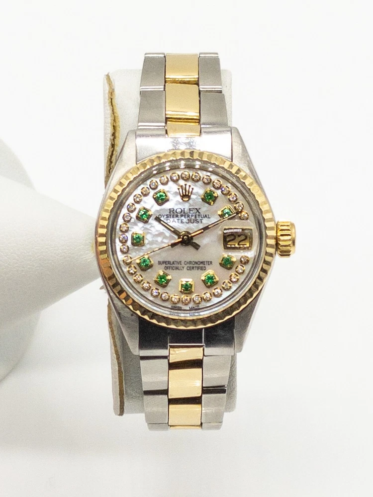 Item Description: Estate ROLEX Datejust Ladies Watch. Solid 18k Yellow Gold and Stainless Steel...mesmerizing piece and rare find. 6.6 inches long and just serviced and runs and keeps time. 26mm CASE and all ORIGINAL FACTORY ROLEX with only a CUSTOM DIAL in White MOTHER PEARL and Natural Emeralds and Diamonds. Just stunning and so pretty. Great two tone watch and rare Rolex find. This dial is so pretty and mesmerizing. Retail $10,000...GORGEOUS. Brand: Rolex Metal: Stainless Steel and 18k Yellow Gold Movement: AUTOMATIC - Just serviced and runs and keeps time with a 1 year warranty Gram Weight: 43.1g Powered by SixBit's eCommerce Solution