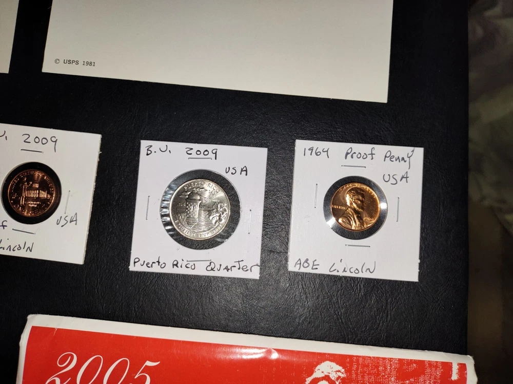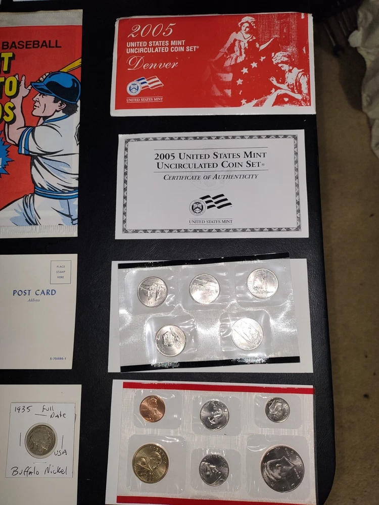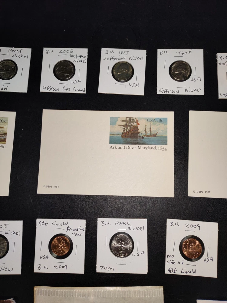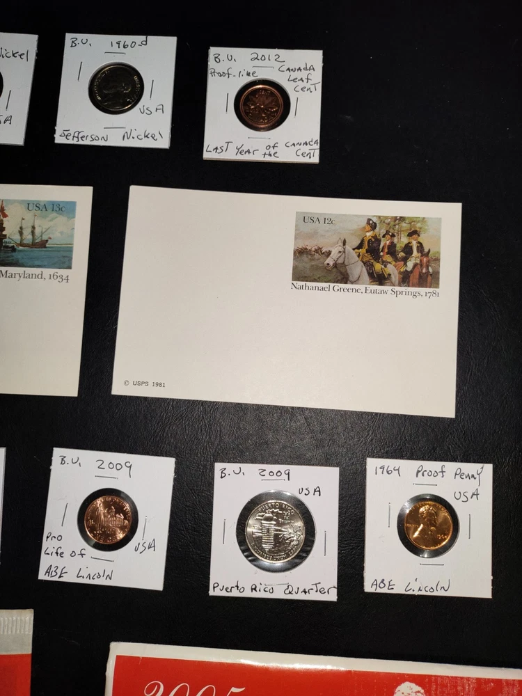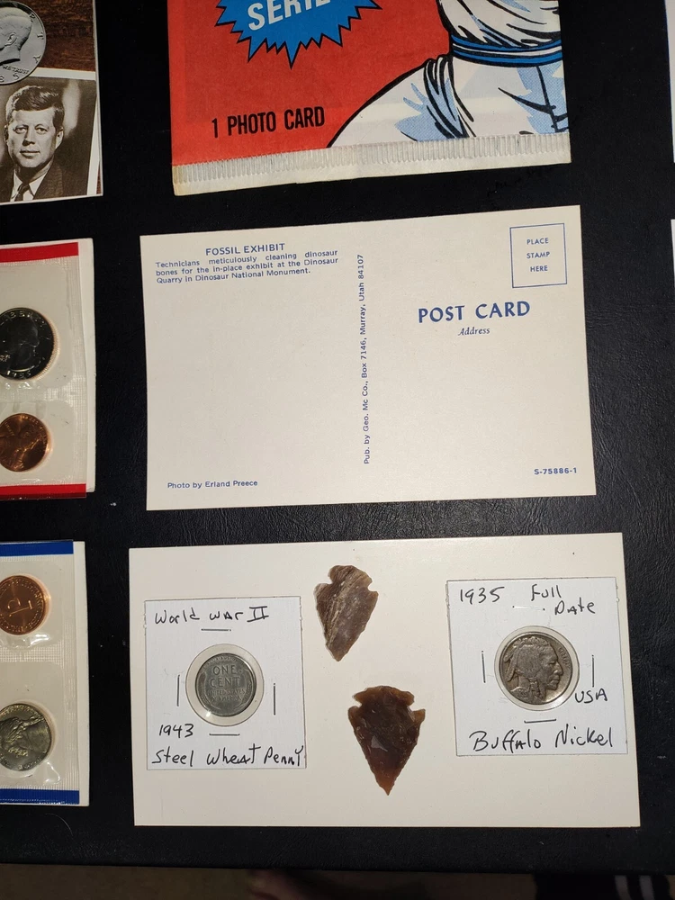 No gimmicks no junk just nice coin You get everything in pictures , see pictures you like to combine shipping just let us know we'd like to save you as much money as possible SEE PICTURES YOU GET EVERYTHING WE ACCEPT PAYPAL AND CREDIT CARD PAYMENTS You get everything in pictures ! This auction is for everything in pictures have a look see so you know exactly what your going to get...thanks All you're single individual coins will come in brand new unused coin folds 2005 United States Denver 11 coin mint set including Sacagawea dollar Kennedy half dollar two Westward journey Nickels plus five state quarters the set includes certificate of authenticity and original envelope 1935 full date Buffalo nickel usa World war II 1943 steel wheat penny usa Extra large signature sealed tops baseball card Two Flint arrowheads various colors Dinosaur fossils unused postcard Three civil war postcard with original postage unused mint condition very cool collectors see pictures 1985 United States 12 coin mint set including two Kennedy half dollars two Washington quarters two Jefferson Nickels two Roosevelt times and two Lincoln pennies This settles includes the original certificate of authenticity and envelope Brilliant uncirculated 1957 Denver wheat penny Brilliant uncirculated 2005 ocean in view westward journey nickel Brilliant uncirculated 2009 Life of Abe Lincoln pro-life penny Brilliant uncirculated 2004 piece nickel Western journey edition Brilliant uncirculated 2009 formative years of Abraham Lincoln penny Circulated old wheat penny Brilliant uncirculated 2009 Puerto Rico quarter 1964 proof Abraham Lincoln penny beautiful condition 1964 proof Canada nickel Brilliant uncirculated 2006 Jefferson return nickel forward-facing Brilliant uncirculated 1977 Jefferson nickel Brilliant uncirculated 1960 Denver Jefferson nickel 2012 proof like Canada cent uncirculated very nice condition This is the last year Canada printed a 1 cent coin this auction is for everything in pictures have a look-see so you know exactly what you'll get YOU GET EVERYTHING SEE PICTURES YOU GET EVERYTHING IN PICTURE ANY QUESTIONS OR PROBLEMS PLEASE CONTACT US WE LIKE TO PROVIDE EXCELLENT CUSTOMER SERVICE WE WILL COMBINE SHIPPING = JUST LET US KNOW
