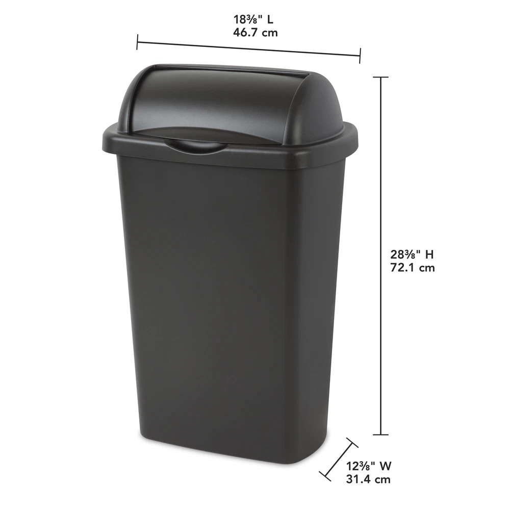 The Sterilite 13 Gallon Roll-Top Wastebasket features a lid that rolls up, stays open and returns closed, all with minimal effort. The large opening allows for disposal of oversized items while leaving the lid rolled up. The design coordinates with any kitchen décor and this wastebasket features an easy-to-clean textured surface. It accommodates a standard 13-gallon trash liner or it can be used to collect recyclable material. This Wastebasket is ideal for all areas of the home including kitchen, garage, basement or even the office. It's durable design will hold up to regular day-to-day use and confidently conceal contents. The overall assembled dimensions of this item are 18 3/8" L x 12 3/8" W x 28 3/8" H. Sterilite Adult 13 Gal. Roll Top Wastebasket Black: Outside Dimensions: 18 3/8" x 12 3/8" x 28 3/8" Large 13 Gallon capacity makes this the ideal size for kitchen use Single unit option Classic color to complement all décor - Black The Sterilite 13 Gal RollTop lid opens with a touch and stays open for easy disposal Lid rolls up, stays open and returns closed with minimal effort Coordinates with any kitchen décor Easy-to-clean textured surface Accommodates a standard 13-gallon trash liner Ideal for use in the Kitchen, Bathroom, Bedroom, Dorm Room, Mudroom or Basement BPA-free and phthalate-free Made of easy to clean No batteries required