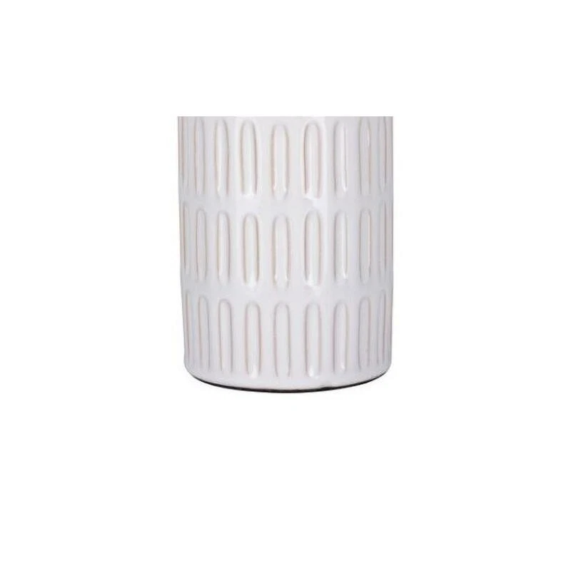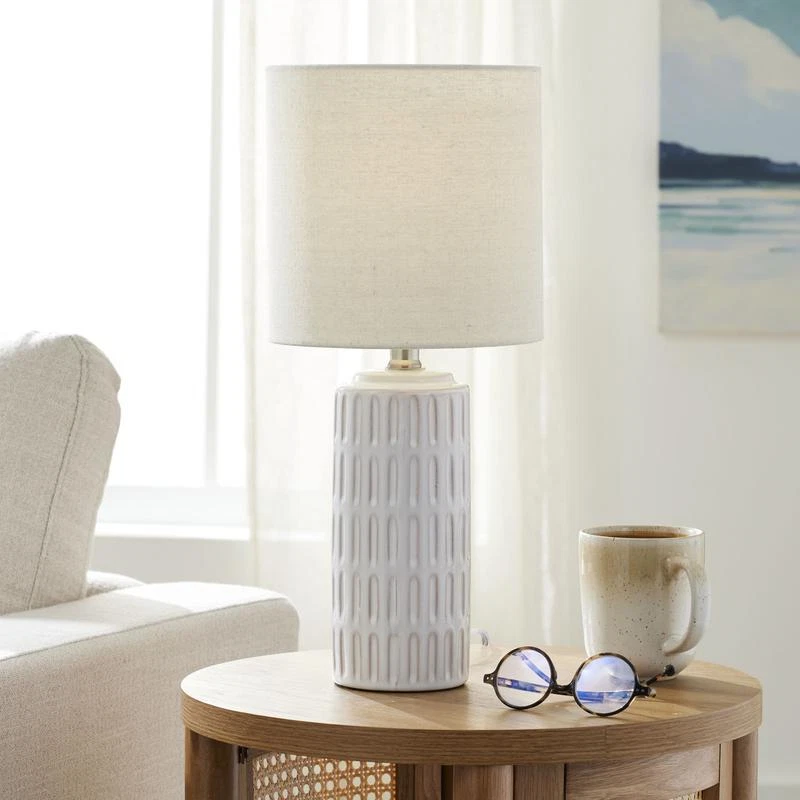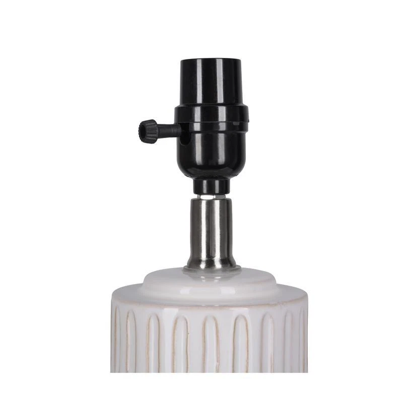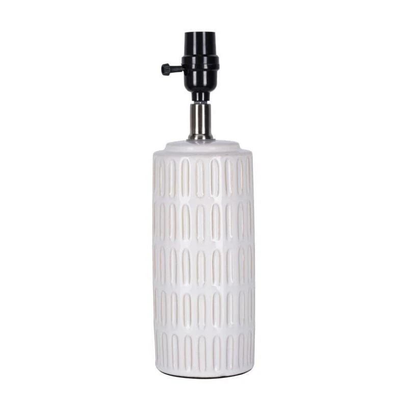 Introducing the Better Homes & Gardens 13. 5" Etched Ceramic Accent Lamp Base, Neutral 2-Tone. This accent lamp base is an elegant and sophisticated addition to your home décor. The detailed texture and elevated design bring a classic yet transitional design element to your home. This lamp is fitted with a 60-inch black power cord and a 2-way rotary switch on the socket. Complete your lamp with your selected shade style, any shade using an uno fitter will work! Whether used in a living room, on accent tables, in your entry way or as a pair of bedside nightstand lamps, this table lamp offers the perfect balance of classic style and ambiance! Better Homes & Gardens neutral tone-on-tone ceramic accent lamp base with high-gloss finish Assembled Dimensions: 3. 75"L x 3. 75"W x 13.5''H