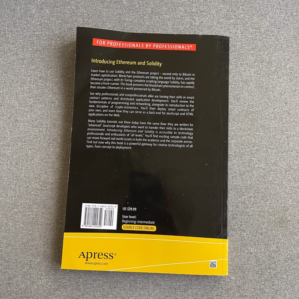 Title: "Introducing Ethereum and Solidity: Foundations of Cryptocurrency and Blockchain Description: CONDITION: Pre-owned with normal signs of wear and tear. The cover, spine, and back show visible scuffs, some pages may have creases and there may be some staining on the front and back cover. Please refer to the images to better understand the item's condition. Details: Returns: We offer a 100% money-back guarantee. If the item does not meet your expectations, you can return it for a full refund. Shipping: The item will be dispatched within one business day upon receiving payment. Thank you for considering this item. Should you have any inquiries, concerns, regarding the product or service, please don't hesitate to get in touch. Your satisfaction is our priority, and we are committed to ensuring your complete contentment. Thank you for your purchase. "Optimize your shipping costs by acquiring multiple items! We are delighted to combine shipping for multiple purchases." Please feel free to reach out if you have any further questions. When shipping a book, it typically goes through media mail unless there's a request for expedited shipping.