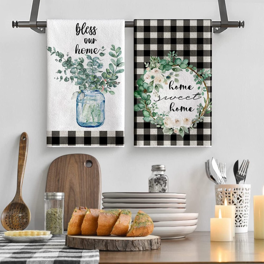 Ideal Present: Our beautiful eucalyptus leaves plaid kitchen dish towels are very suitable for the daily cleaning and drying of the kitchen and summer decorations. They can also be given to your friends and family as gifts to express their important love, care and blessings to mankind. ▶Product Information: -Product Name: Eucalyptus Leaves Plaid Dish Towels -Material: Polyester -Product Size:70cm*45Cm. -Packing Size: 25*10*1.5cm -Weight: 0.16kg ▶Package Includes: 2* Eucalyptus Leaves Kitchen Towels ▶Product Features: High absorbency: Eucalyptus dish towel has strong absorbency, enough to dry, clean and scrub dishes. It is very suitable for your daily work of drying and cleaning the kitchen. Unique and Design: printed with eucalyptus leaves vase, eucalyptus leaves wreath, home sweet home, bless our home and other fashionable, unique and cute patterns. It is the perfect kitchen gift for wife, mother, grandma, and hostess. Washing instructions: Wash our summer towels in cold water, hang to dry; machine washable. ▶Warm Reminder: -Manual measurement, there may be 1-2 cm deviation. -Due to the difference in light, angle and presentation, there may be chromatic aberration, please refer to the actual product, please understand Soft Material-- Eucalyptus leaves buffalo plaid dish towels are made of high-quality and durable microfiber, which can be machine-washed and dried. It is super soft and will not scratch your delicate bowls, plates, pots or pots and other tableware. High Absorbency-- Eucalyptus leaves kitchen dish towel has strong absorbency, enough to dry, clean and scrub dishes. It is very suitable for your daily work of drying and cleaning the kitchen. Size and Packaging-- Dish towel tea towel 18 X 28 inches / 45 cm X 70 cm, durable, including 2 pieces, very suitable for kitchen use. Unique Design-- Printed with eucalyptus leaves vase, eucalyptus leaves wreath, home sweet home, bless our home and other fashionable, unique and cute patterns. It is the perfect kitchen gift for wife, mother, grandma, and hostess. Wide Application Range-- This summer tea towel can be hung on the oven handle, countertop or towel rack, which is very suitable for kitchen, bathroom or home decoration. Our eucalyptus leaves wreath kitchen towels will add vitality to your home.