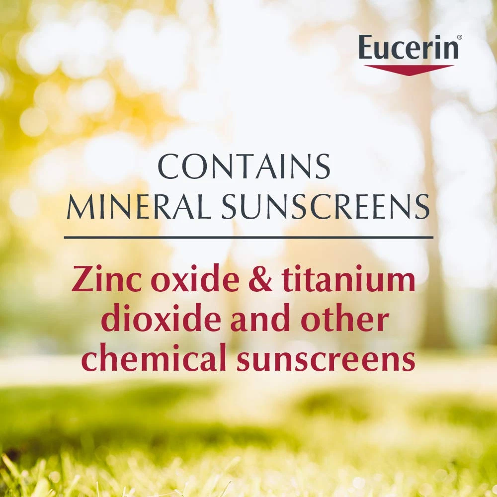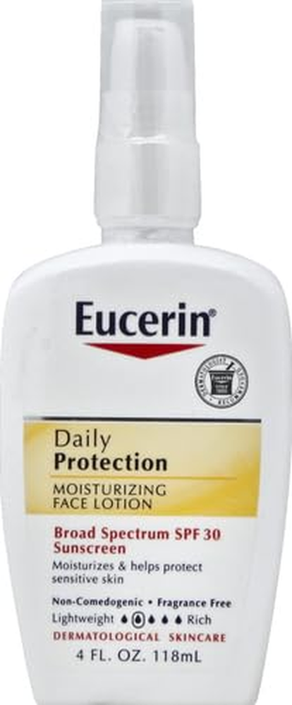 SUN PROTECTION: Enriched with zinc oxide, titanium dioxide and others sunscreens to provide broad spectrum UVA/UVB protection GENTLE: Gentle for sensitive skin NON-GREASY: Fast absorbing, nongreasy LONG-LASTING MOISTURE: Provides 24 hour moisture FREE OF: Fragrance-free, dye-free, Noncomedogenic, and gentle for sensitive skin INCLUDES: One (1) 4 fluid ounce bottle of Eucerin Daily Protection Face Lotion Broad Spectrum SPF 30 Sunscreen Eucerin’s Daily Protection Face Lotion is a dermatologist recommended, lightweight, broad spectrum SPF 30 moisturizer. Eucerin Daily Protection Face Lotion has UVA/UVB sunscreens, including zinc oxide and titanium dioxide which helps defend against sunburn and long-term sun damage. In addition, it provides 24 hour moisture, is non-comedogenic and is clinically proven to be gentle on sensitive skin.