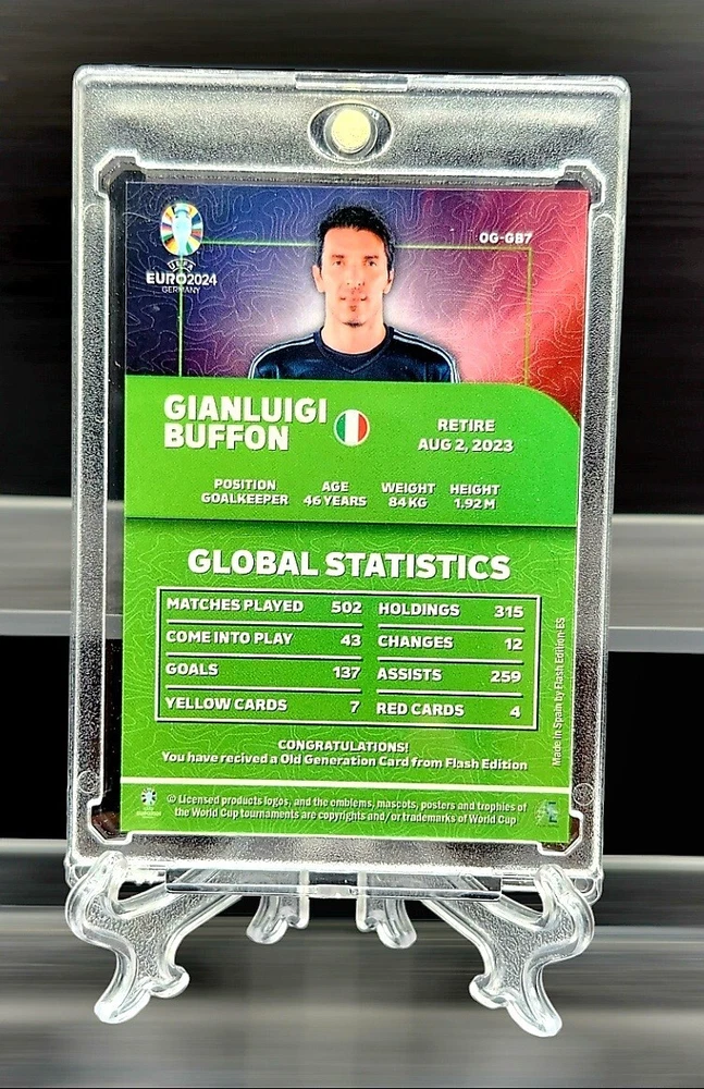 - 1 Card Foil Euro Cup Germany 2024 Legend Gianluigi Buffon Special Edition. - 1 Magnetic Card Holders. - 1 Stand holders.