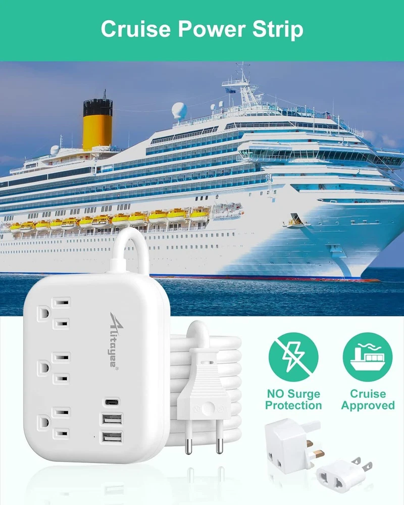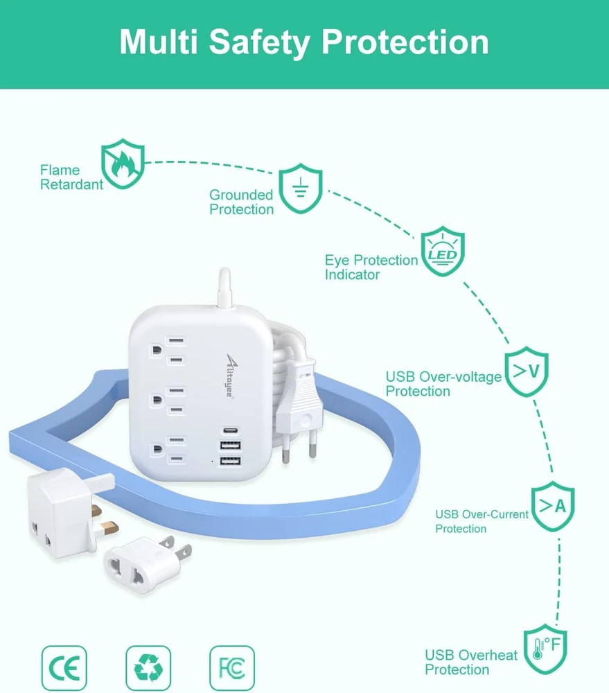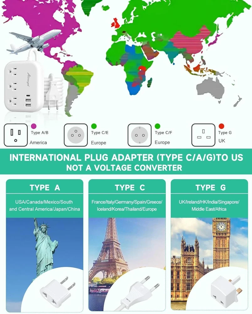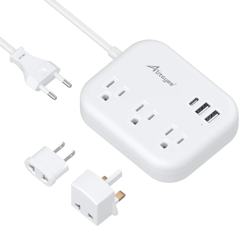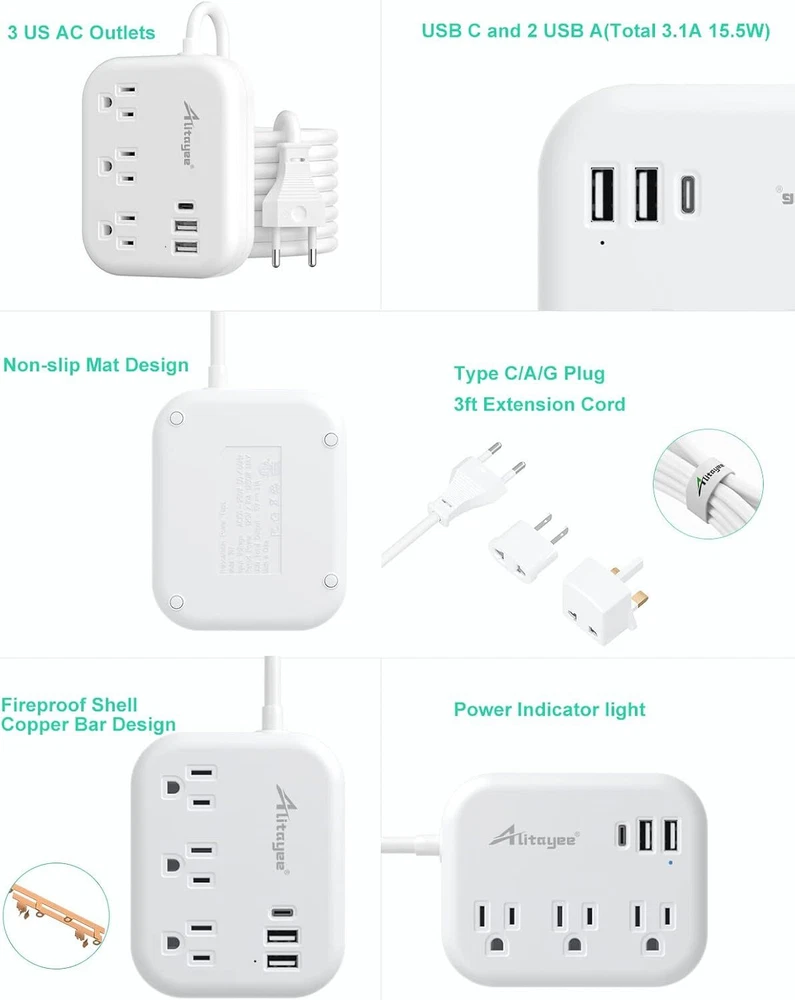 European Travel Plug Adapter, Alitayee EU/UK/US Power Strip with white Product Details Brand: Alitayee Color: white Item Weight: 8.9 Ounces Input Voltage: 250 Volts Item dimensions L x W x H: 4.4 x 3.5 x 1.2 inches 【Universal Travel Adapter/Power Strip(more than 150 countries and regions)】Includes 3 types of international adapters -Type C(EU),Type G(UK),Type A(USA) plugs compatible with most of the world. Type A plug adapter can work in America,Japan,Canada,China.Type C European travel plug adapter can work in most of Europe. Type G plug adapter can work in UK,Ireland,Middle East.It is not only a travel essentials,but also a power strip for home/office 【6-IN-1 USB C European Travel Adapter】3 AC outlets(10A/2500W) USB international plug adapter with 3ft extension cords could allow 3 standard USA plug to be used at the same time and 3 USB ports for Smart phones, iPad, cameras and many other devices.3 Ft extension cord makes it more flexible,get easy access to place that's hard to reach,extend the european to us plug adapter to table or other place easily where need power outlets or usb charging ports 【3 USB European Outlet Adapter】USB C adapter provides 5V 3.0A 15W ,3 USB port total provides 5V 3.1A 15.5W Fast Charging.With Smart Charging Technology,the Type-C and 2 USB-A ports will Identify your devices automatically and deliver the fastest and most suitable charging speed.Great for all your travel accessories and electronic devices that accepts fast charging 【Not a Voltage Converter】This adapter for Europe is not a voltage converter, european adapter is only compatible for wide voltage device, Your hair dryer, straightener, electric toothbrush or razor must to support dual voltage(100V to 250V), or you may need a voltage converter 【European River/Cruise Must Haves】This international power adapter with USB is certified by FCC, CE,made of Fire-resistant PC shell.It has NO surge protection,making it a European river cruise approved power adapter.Perfect for International Europe Cruises.No trouble getting it through customs or safety check.Compact Size and lightweight design to fit into luggage and bag,No need to take additional USB phone charger while traveling.Non-slip mat design,better for on the desktop or nightstand Compatible Countries: More than 150 Countries and Regions. 1,Type A - USA/Canada/Japan/ China Other Countries include: American Samoa / Antigua and Barbuda / Aruba / the Bahamas / Barbados / Belize / Bermuda / Brazil / the Cayman Islands / Colombia / Costa Rica / Cuba / Ecuador / El Salvador / Guam / Guatemala / Haiti / Honduras / Jamaica / Liberia / Mexico / Micronesia / Montserrat / Nicaragua / Okinawa / Panama / Peru / the Philippines / Puerto Rico / Saudi Arabia / Tahiti / Taiwan / Thailand / Trinidad and Tobago / Venezuela / the Virgin Islands, etc. 2,Type C- France/Germany/Italy/Spain/Greece/Iceland/Korea,/Thailand Other Countries include: Armenia/ Aruba/ Austria/ Azerbaijan/ Bangladesh/ Belarus/ Belgium/ Bolivia/ Brazil/ Bulgaria/ Croatia/ Cameroon/ the Czech Republic/ Denmark/ Egypt/ Estonia/ Finland/ Georgia/ Hungary/ ,Indonesia/ Kazakhstan/ Kyrgyzstan/ Libya/ Latvia/ Lithuania/ Luxembourg/ Macedonia/ Moldova/ Monaco/Mauritius/the Netherlands/ Norway/ Poland/ Portugal/ Paraguay/Romania /Russia/ Ukraine/ Serbia/ Slovakia/ Slovenia/ Sweden/ Switzerland/ Bahrain/ Chad/ the Republic of Guinea/ Israel/ India/ Iran/ Iraq/ Jordan/ Kazakhstan/ Kuwait/ Lebanon/ Madeira/ Mozambique/ Oman/ Palestine/ Saudi Arabia/ Syria/ Senegal/ Turkey/ Chile /Peru/ Saba/ Suriname/ Uruguay/ Vietnam/ Malaysia/ Maldives/ South Africa/Zambia, etc 3,Type G - UK/Ireland Other Countries include: Bahrain / Belize / Botswana / Brunei / Cyprus / Dominica /Ghana / Gibraltar / Grenada / Iraq / Kenya / Macau / Malta / Malaysia / Nigeria / Northern Ireland / Oman / Qatar / Saint Lucia / Saint Vincent / Saudi Arabia / Scotland / Singapore / Sri Lanka / Tanzania / Uganda / the United Arab Emirates / Wales / Yemen / Zimbabwe/India/HK, etc. Tips 1: This is not a voltage converter,travel adapter worldwide is only compatible for wide voltage device,Your hair dryer, straightener, electric toothbrush or razor must to support dual voltage(100V to 250V),or you may need a voltage converter. Tips 2: The USB-C port doesn't support Macbook, Macbook Air, Macbook Pro or any other laptops which needs 14~22V charging voltage.