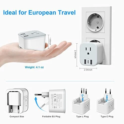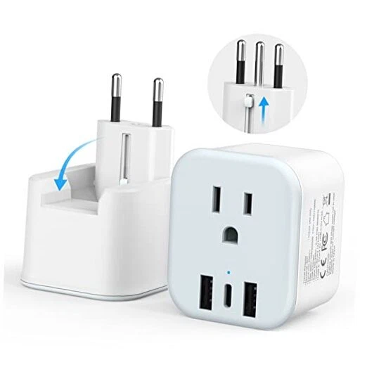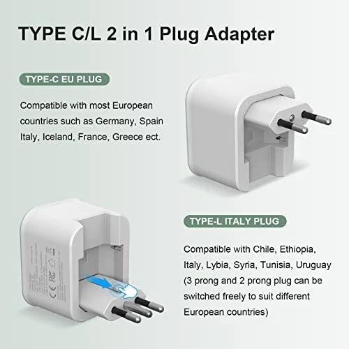 Return Policy Fast Delivery Trusted seller European Travel Plug Adapter Foldable International Power Plug Adapter with USB-C, Type C/L 2 in 1 Plug Adaptor for US to Most of Europe EU Spain Italy France Germany Product Description 【TYPE C/L 2 in 1 Europe Plug Adapter】2 Prong EU Plug and 3 Prong Italy Plug all in one design. Compatible with most european countries, such as Austria, Belgium, Croatia, Denmark, Finland, France, Germany, Spain, Turkey, Iceland, Israel, Switzerland, Amsterdam, especially for Italy, Chile, Maldives and Angola, etc.(More country list can be checked in detail page). With Retractable Grouned prong. Type C and type L plug can be switched freely which meet the different need for european travelling. (Note: Not WORK in UK/Ireland/Scotland). 【4 in 1 EU Power Adapter Charger】: This adapters for Europe outlets accept the standard N American 2 or 3 prong flat pin plug; This European Travel Plug Adapter also has 2*USB-A ports and one USB-C, allowed to fast charging 4 devices at once. The 5V3A USB-C makes it perfect match for iPhone, iPad, Apple watch, Airpods and other digital devices. Provide best charging solution for you europe trip. 【Foldable and Compact Design】: Foldable EU plug design and compact size, this mini italy europe power adapter can easily put into pockets or bags. Very suitable for travel or cruise ship; Indicator can let you know the Europe power adapter is on/off 【Safe & Reliable Europe Travel Accessory:】 CE/EMC/ROHS/FCC/LVD Certified, and multiple safety system (Smart IC,PC fireproof materials,Grounded Prong) makes it a reliable Travel Plug Adapter -This plug adapter is only compatible for 110V-240V wide voltage device, If you want to use your hair dryer, straightener, electric toothbrush or razor, they MUST support 110V-240V Dual Voltage, otherwise you may need a power voltage converter. 【Worry Free After Sales Service】: 30 Days refund policy and if t's anything wrong with the adapter, we will fix the problem for free or send you a new replacement by default (1-Year Limited ) . Please contact us If you have any questions, we will offer you satisfactory solution and we will reply you within 24 hours. Shipping Returns Payment Shipping Shipping is FREE to all addresses other than APO/PO boxes in the lower 48 states. All our stock ships from US-based warehouses. Shipped via USPS or UPS (depending on location and package weight) Unless stated otherwise, all orders will ship within 24-72 hours of your payment being processed. Check our feedback to see the great reviews of FAST shipping we offer. Returns Seller does not accept returns Payment We currently accept payment via eBay managed payments only. Once payment is cleared, we will dispatch your shipment within 1-3 business days. Please refer to the "Shipping" tab for more information regarding shipping speed to your destination.