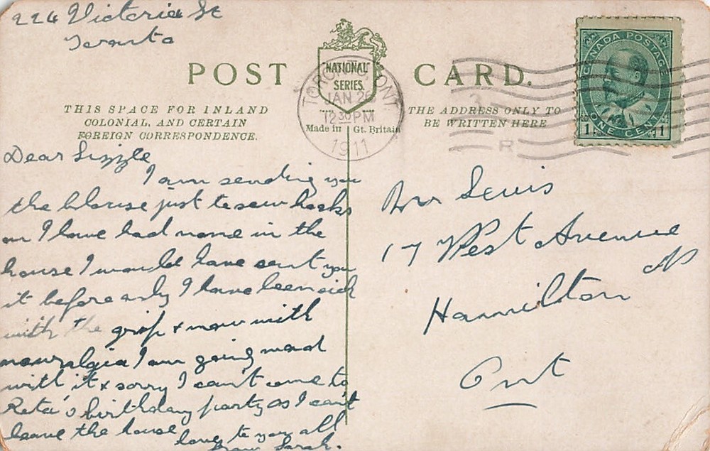 Front Description: Illustration of people canoeing on a lake under a moonlit sky. Central imagery includes British and Canadian flags and a coat of arms, surrounded by maple leaves. Caption reads: “Softly as falls the evening chime. Rough Transcription of Legible Text: 226 Victoria St., Toronto Dear Lizzie, I am sending you the blouse just to see how it goes on. I have had none in the house. I would have sent you it before only I have been ill with the grippe & now with neuralgia. I am going mad with it & sorry I can’t come to Kate’s birthday party as I can’t leave the house. Love to you all. Shipping Policy Due to ever increasing postage costs, shipping is charged separately rather than hidden in the item's price. This method is more equitable, allowing customers closer in proximity to benefit from reduced shipping costs. For orders with multiple items, I'm happy to offer combined shipping (which can further save on shipping expenses).