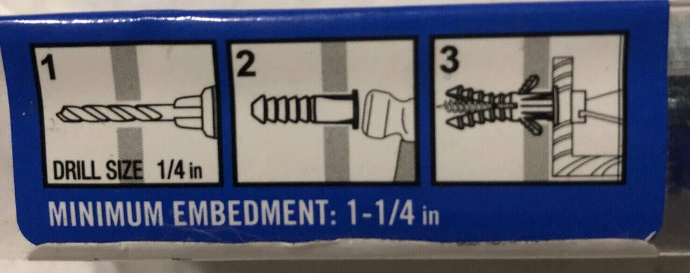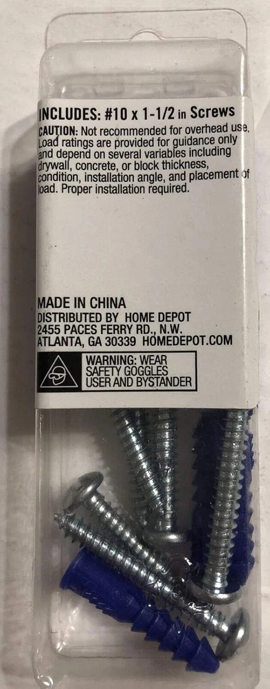 Everbilt #10-12 x 1-14inch Blue Plastic Ribbed Plastic Anchor with Screws (7 Pack) Product Details Material: Plastic Drive System: Phillips Head Style: Round Item dimensions L x W x H: 0.25 x 0.25 x 2 inches Exterior Finish: Plain Includes 7 Screws with blue plastic anchors #10-12 x 1-1/4" Use where there is no backing on the sheet-rock, or mounting surface. Will ease your handyman projects when it comes to hanging pictures, photo frames or any other object to drywall or sheetrock surfaces. This dry-wall anchors require a pre-drilled hole to be drilled on the dry wall surface prior to installation.